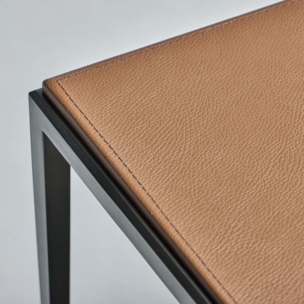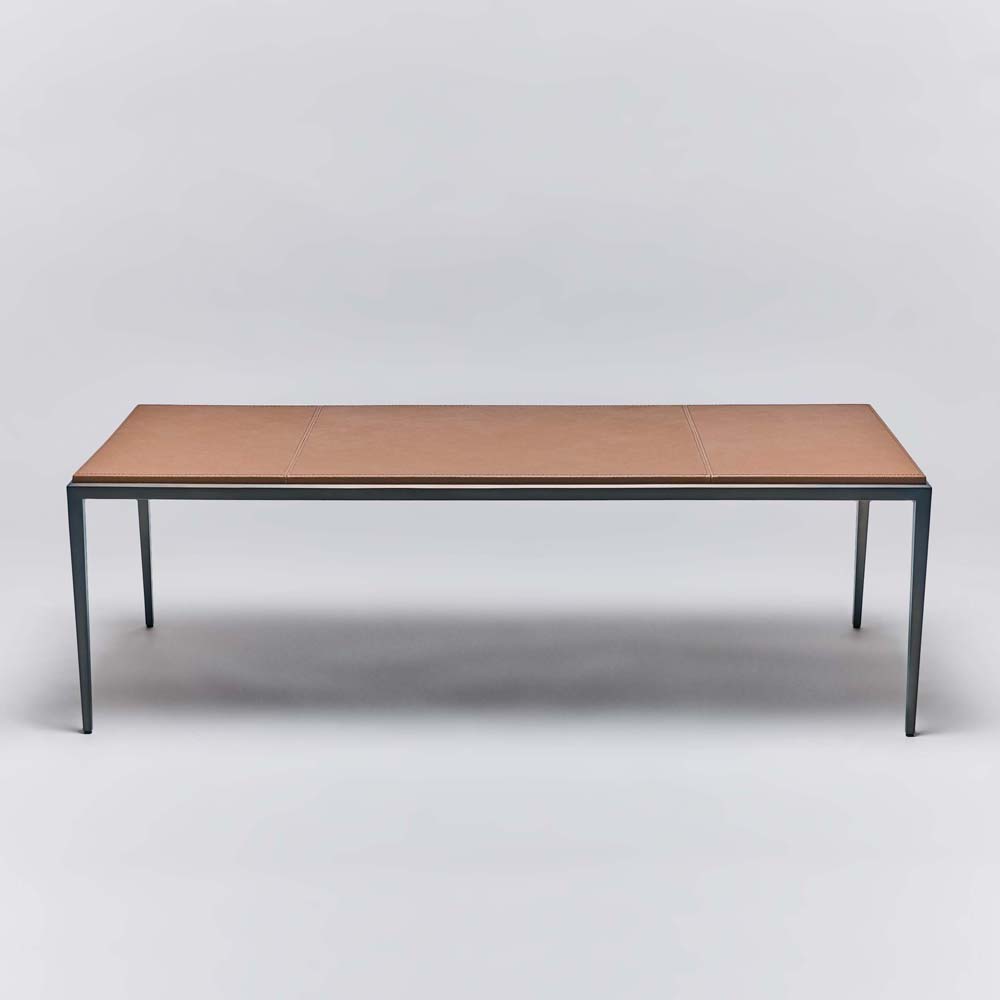 With a caramel leather top and classic bronze cast iron legs, the Auburn Cocktail Table is an au courant take on a midcentury silhouette.