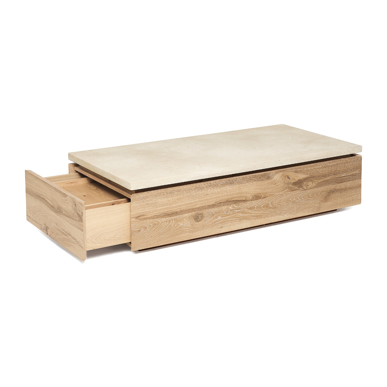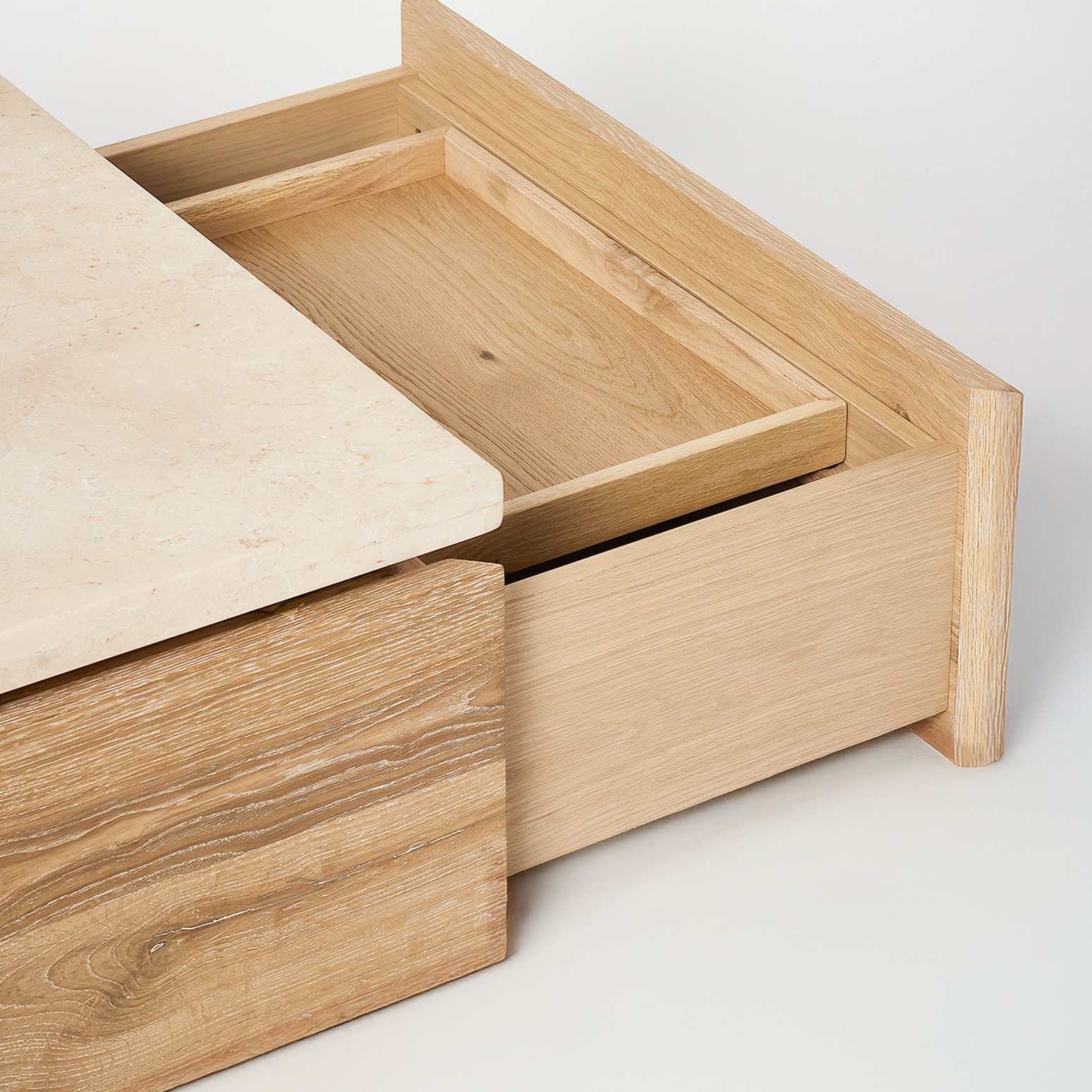 Belying its surprising utility, the Branford Rectangular Storage Cocktail Table boasts a honey marble top, and a saddle-finished character oak base fitted with tucked-away drawers.