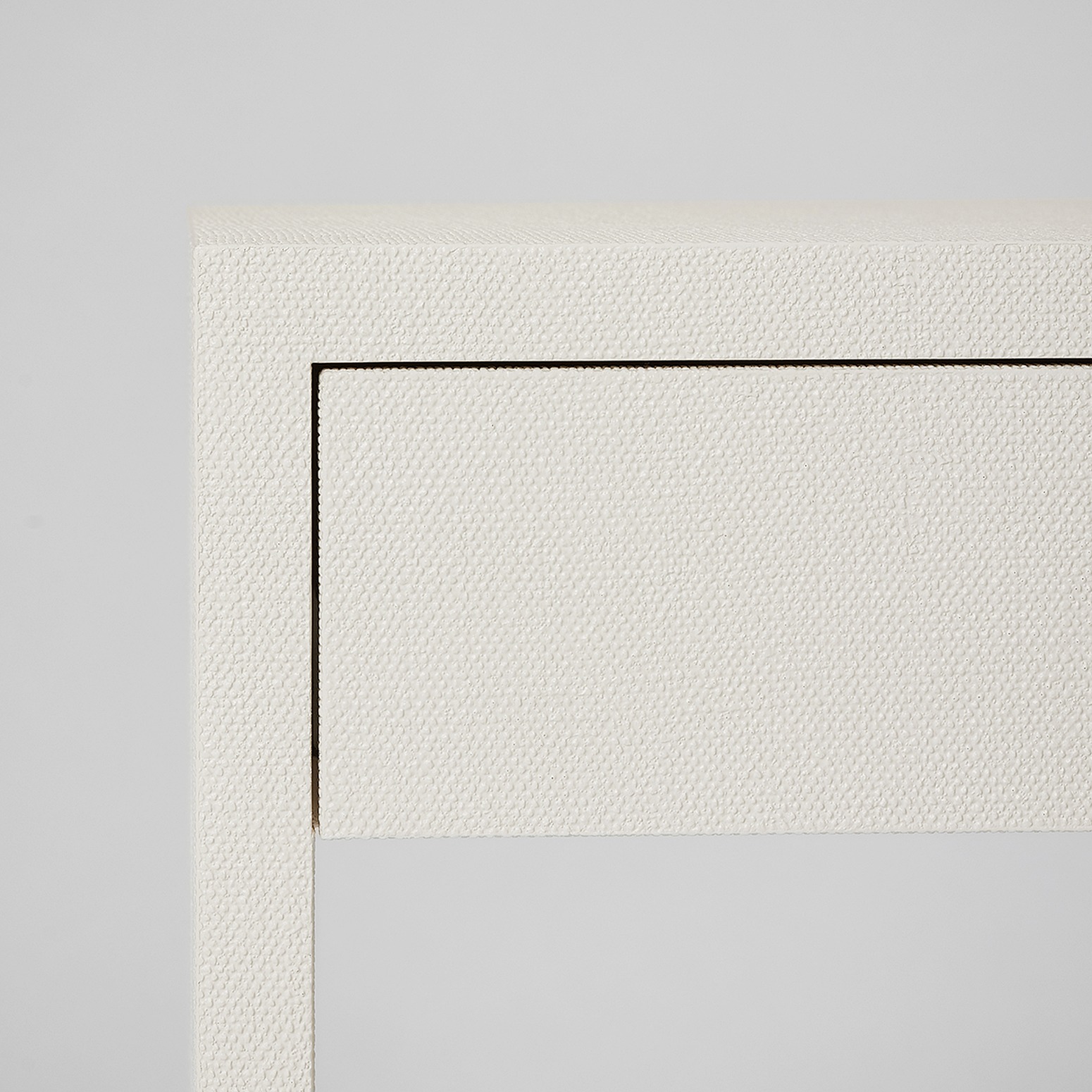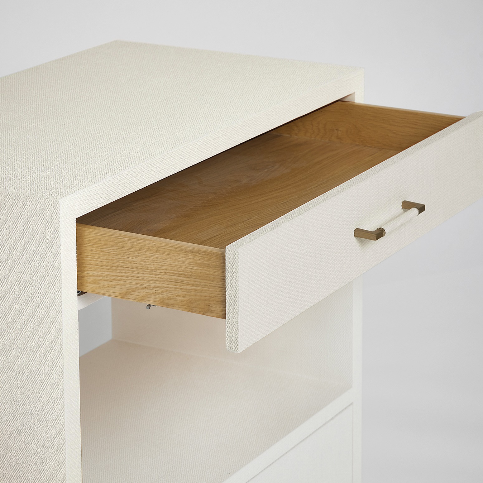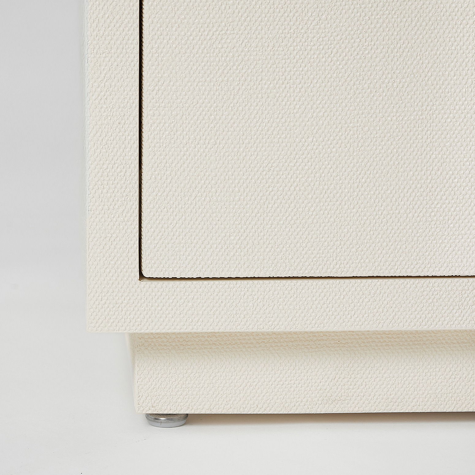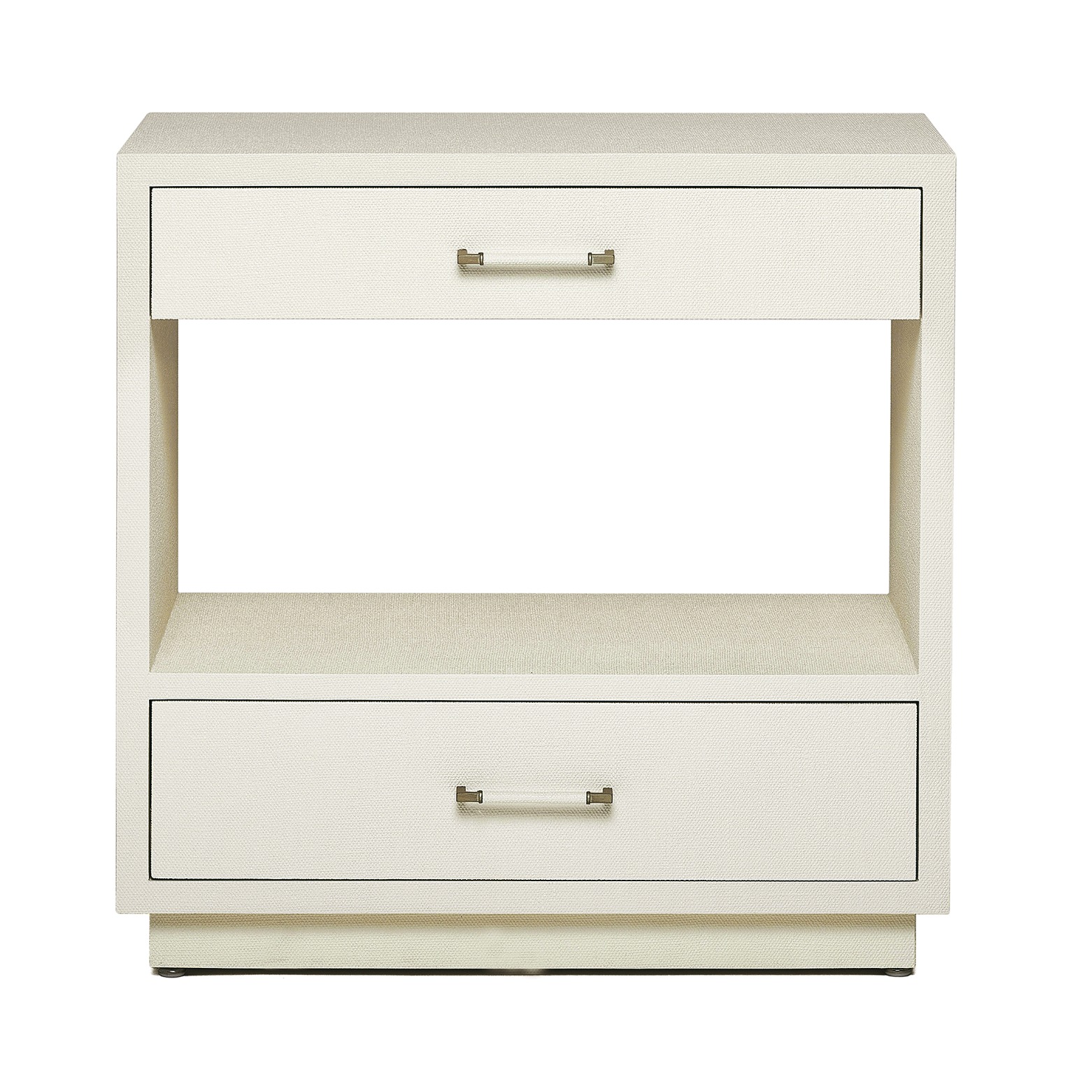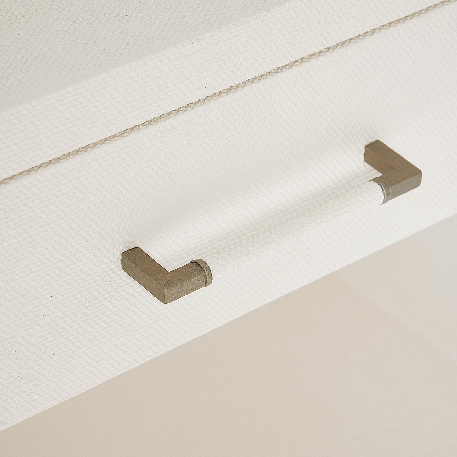 The clean lines of the Taylor Tall Bedside Chest are transformed into a statement piece thanks to the texture of natural white faux linen and metal pulls in a champagne silver.