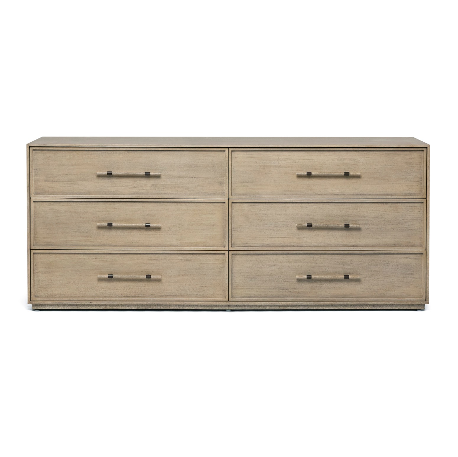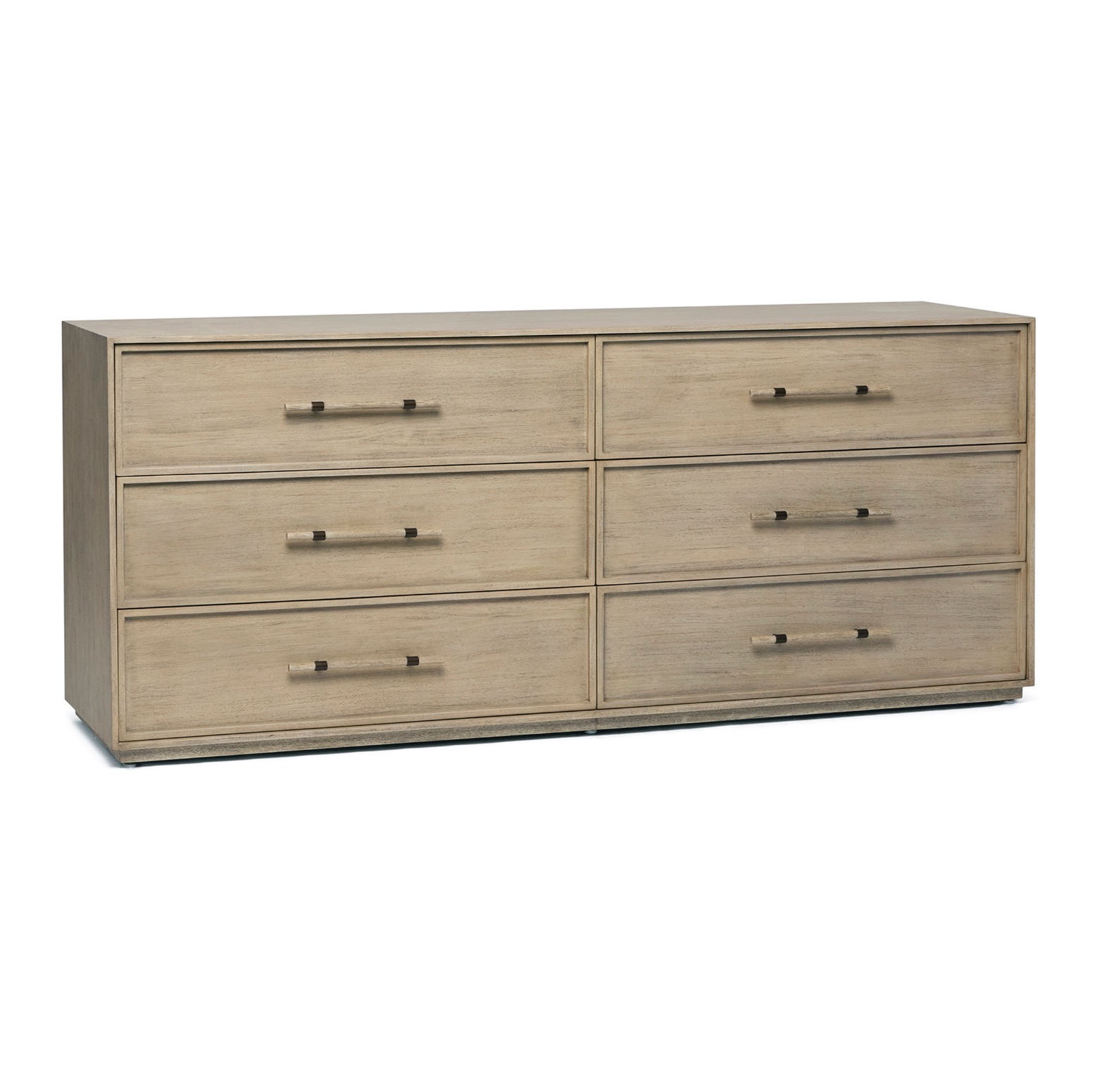Crafted of mahogany in a washed taupe finish and featuring faux horn and brushed brass metal hardware, the Clement 6 Drawer Chest showcases integrity and artisanal vibes.