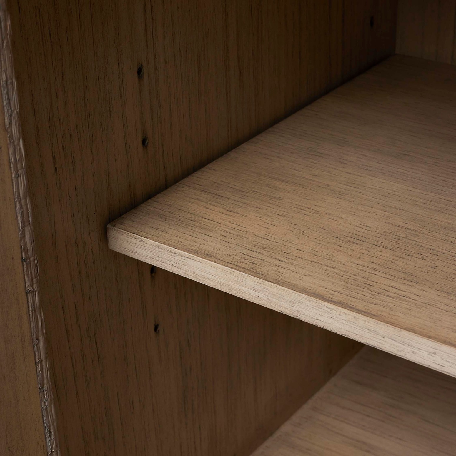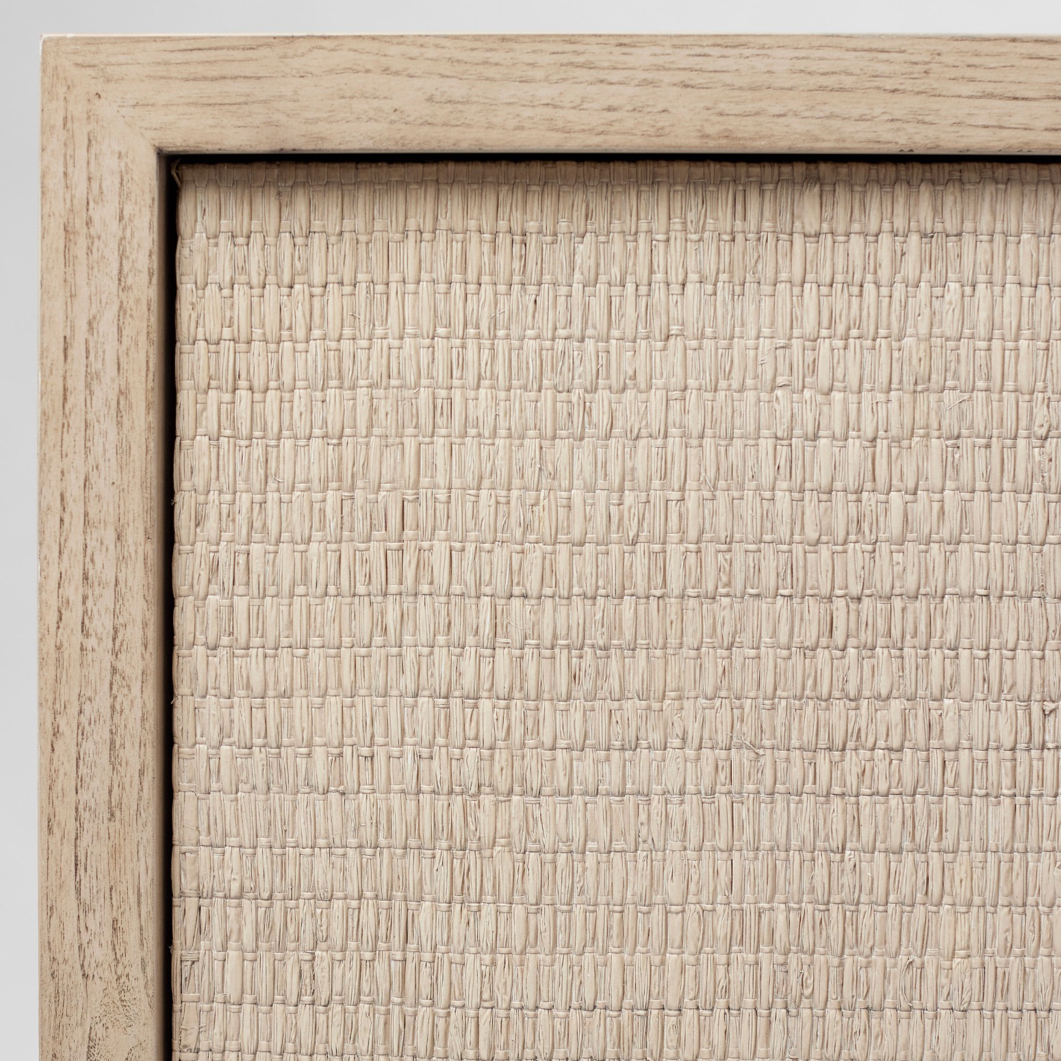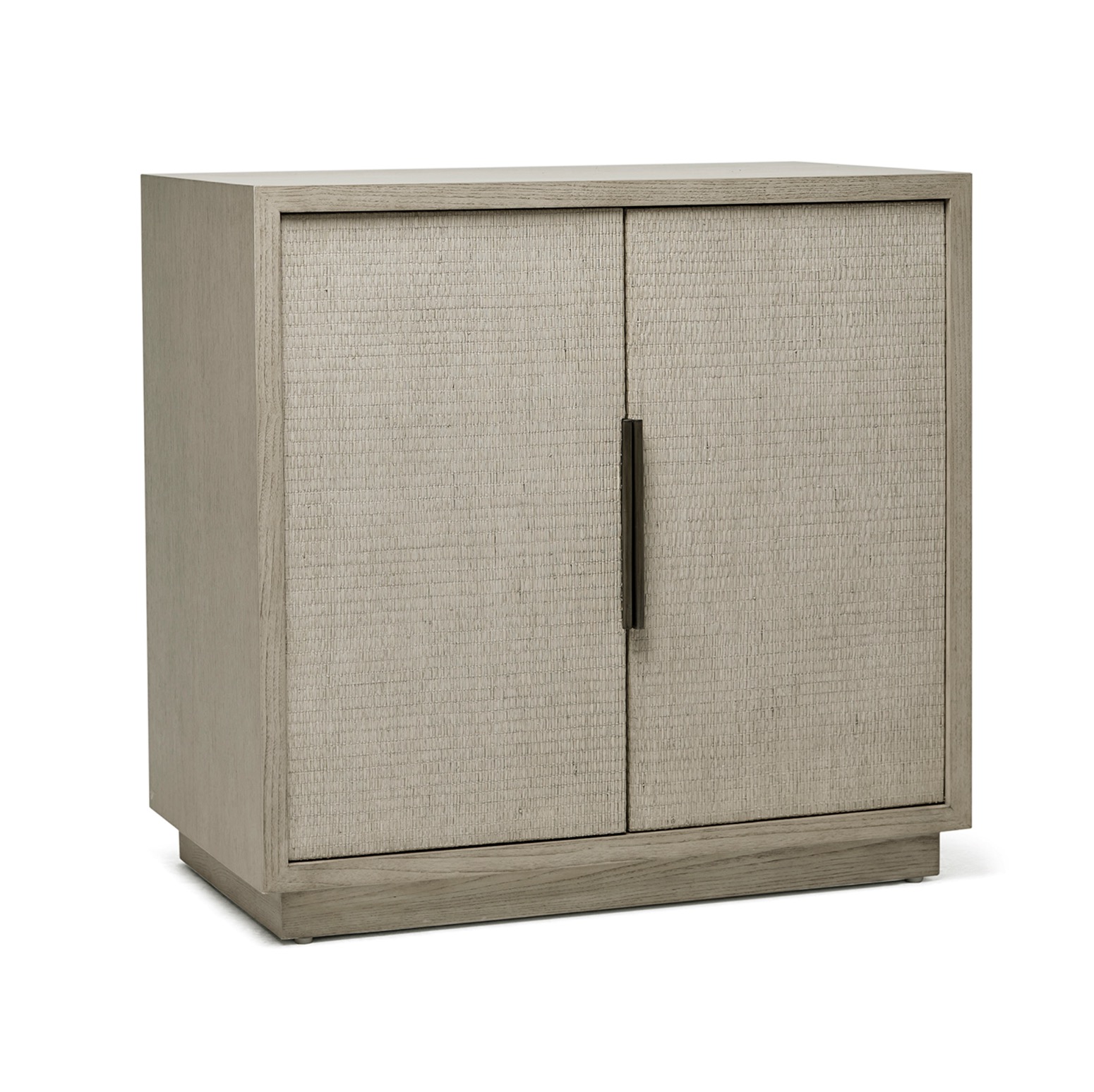 Featuring washed taupe wood with raffia insets and metal drawer pulls in satin aged bronze, the Harperly Bar Cabinet brings an organic calm to a storage must-have.