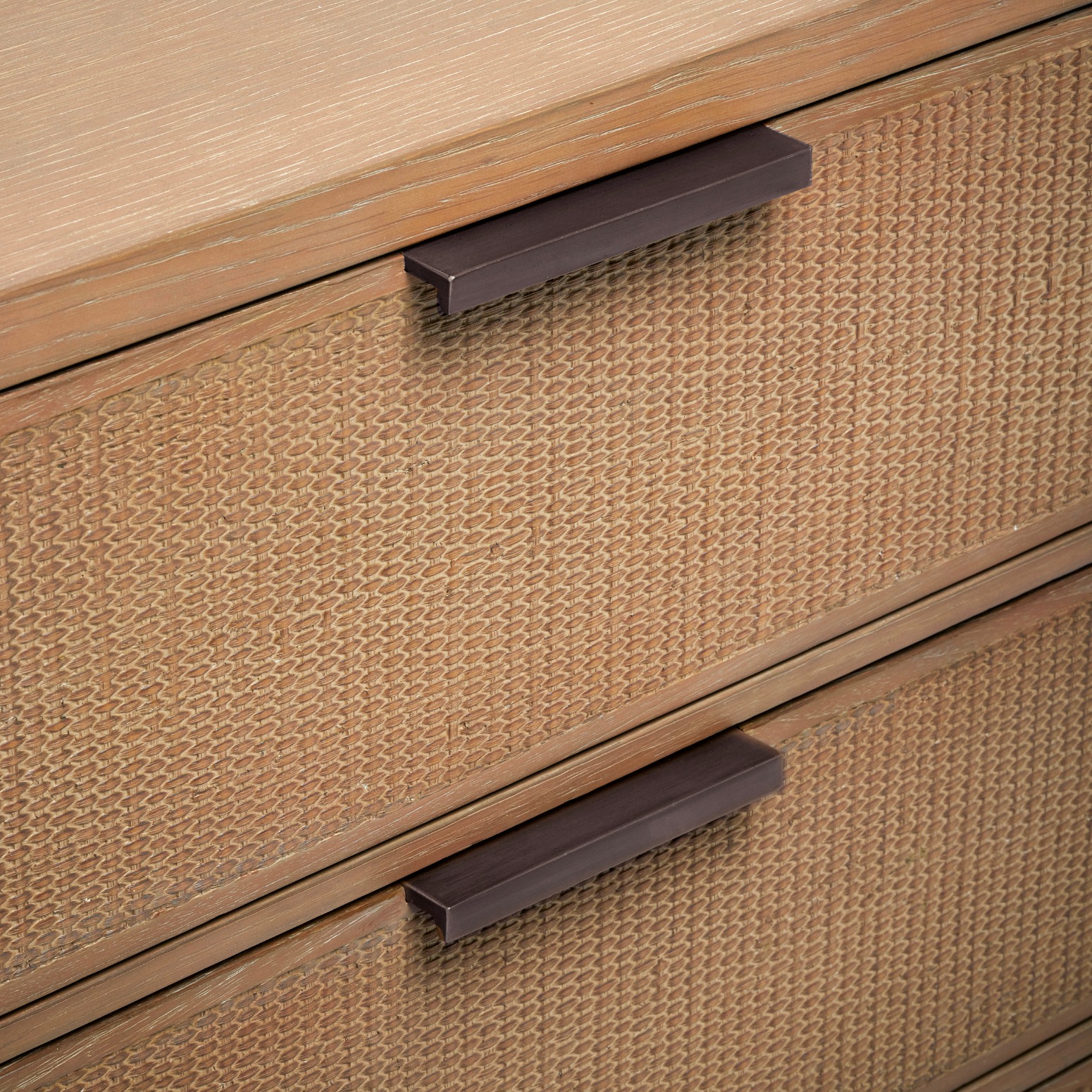 Crafted of oak in a harvest finish and featuring rattan drawer fronts, the boldly sized Holmes Credenza delivers organic texture and natural flair.