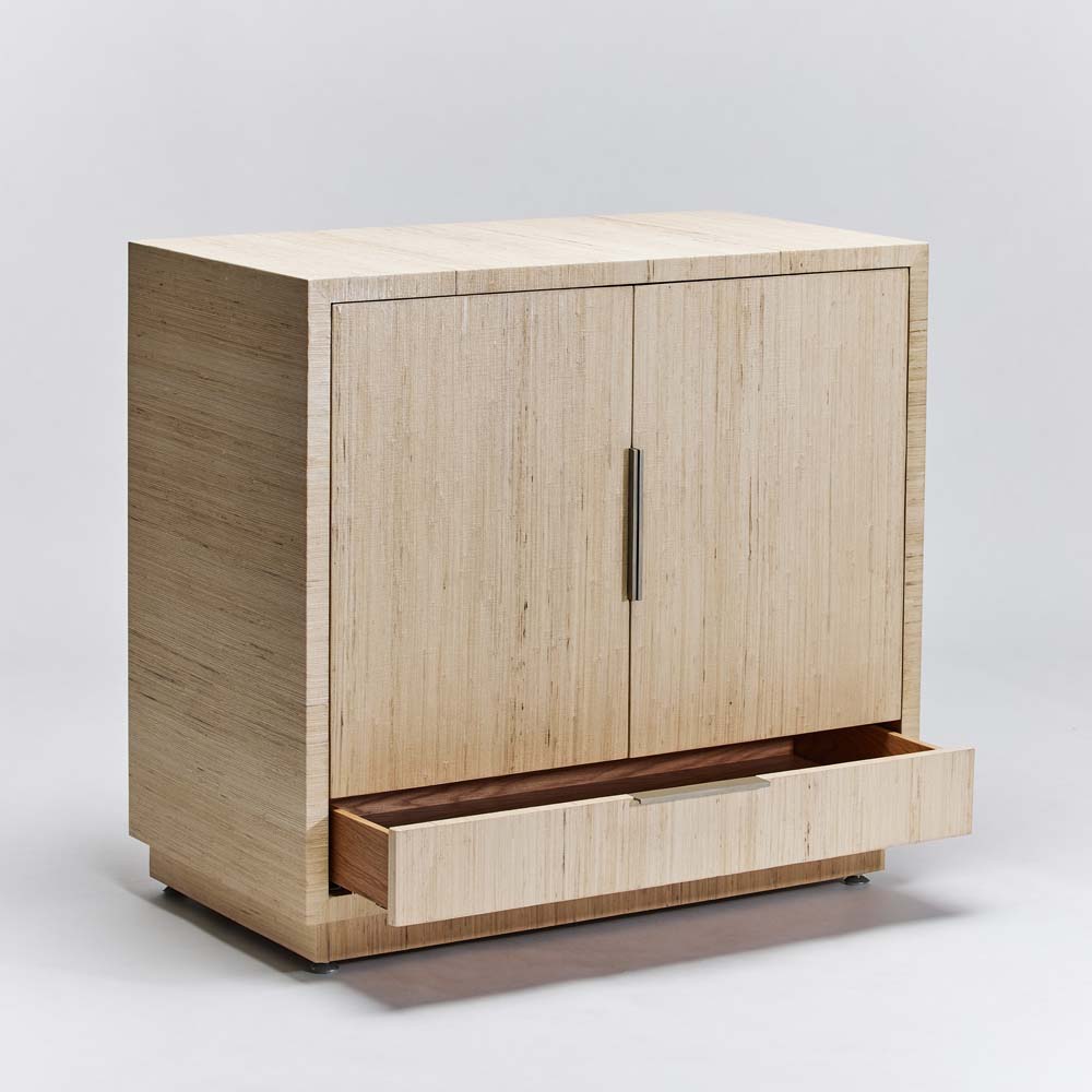 The organic flair of a natural sisal texture complements the sophistication of the Montaigne Bar Cabinet and its champagne silver iron hardware.