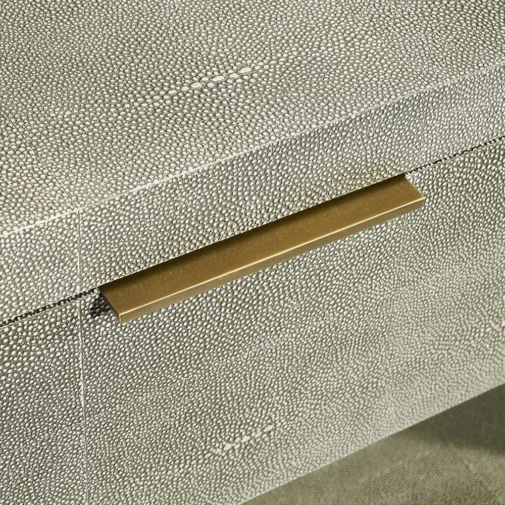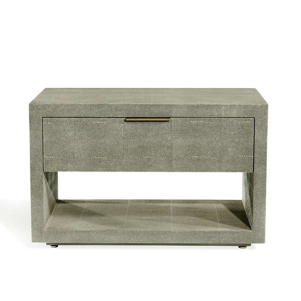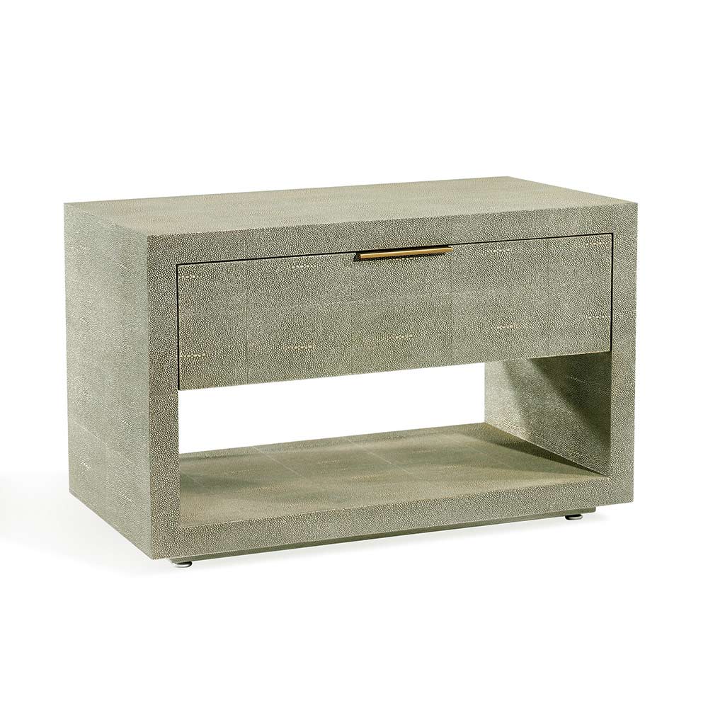 The Montaigne Bedside Chest in sorrel olive sharkskin with a antique brass metal pull, is small in scale, but makes a big impact.