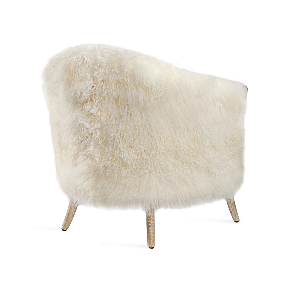 A whitewash-stained wood frame and ivory sheepskin belies the cozy sumptuousness of the plush Ilaria Lounge Chair.