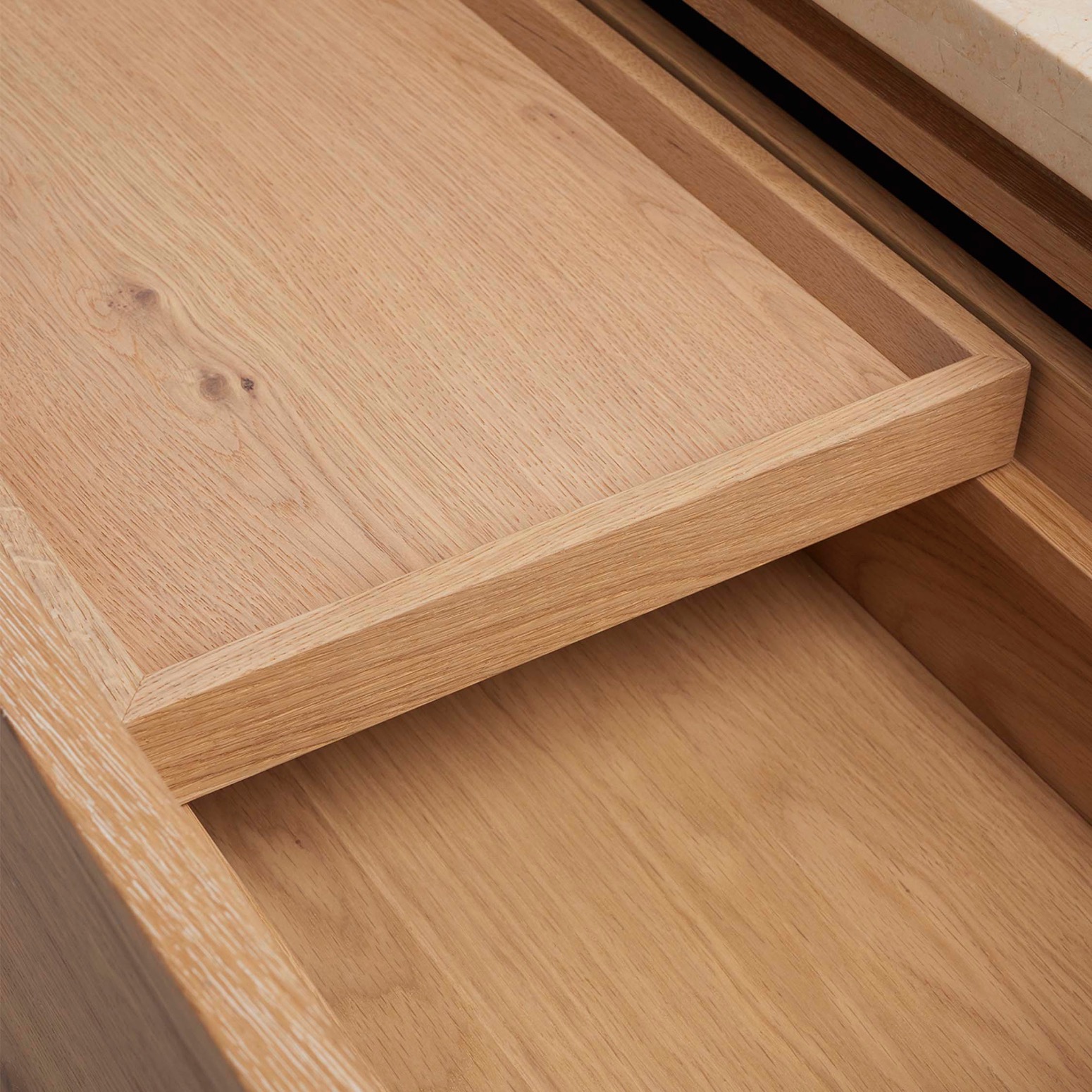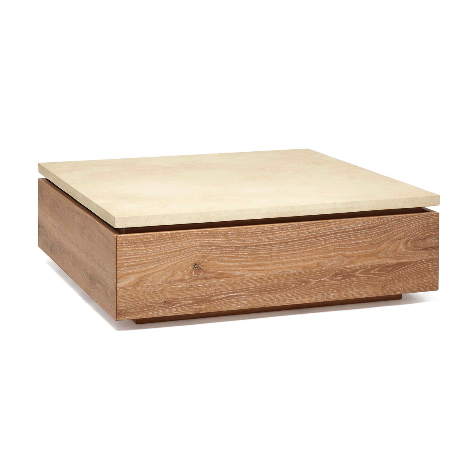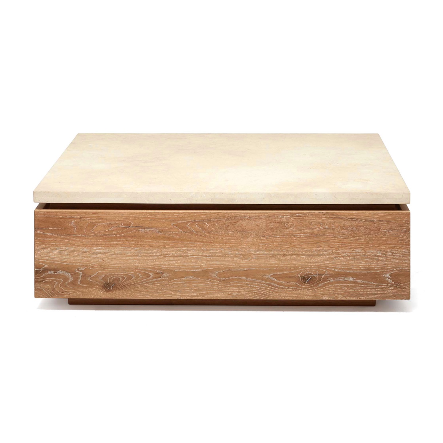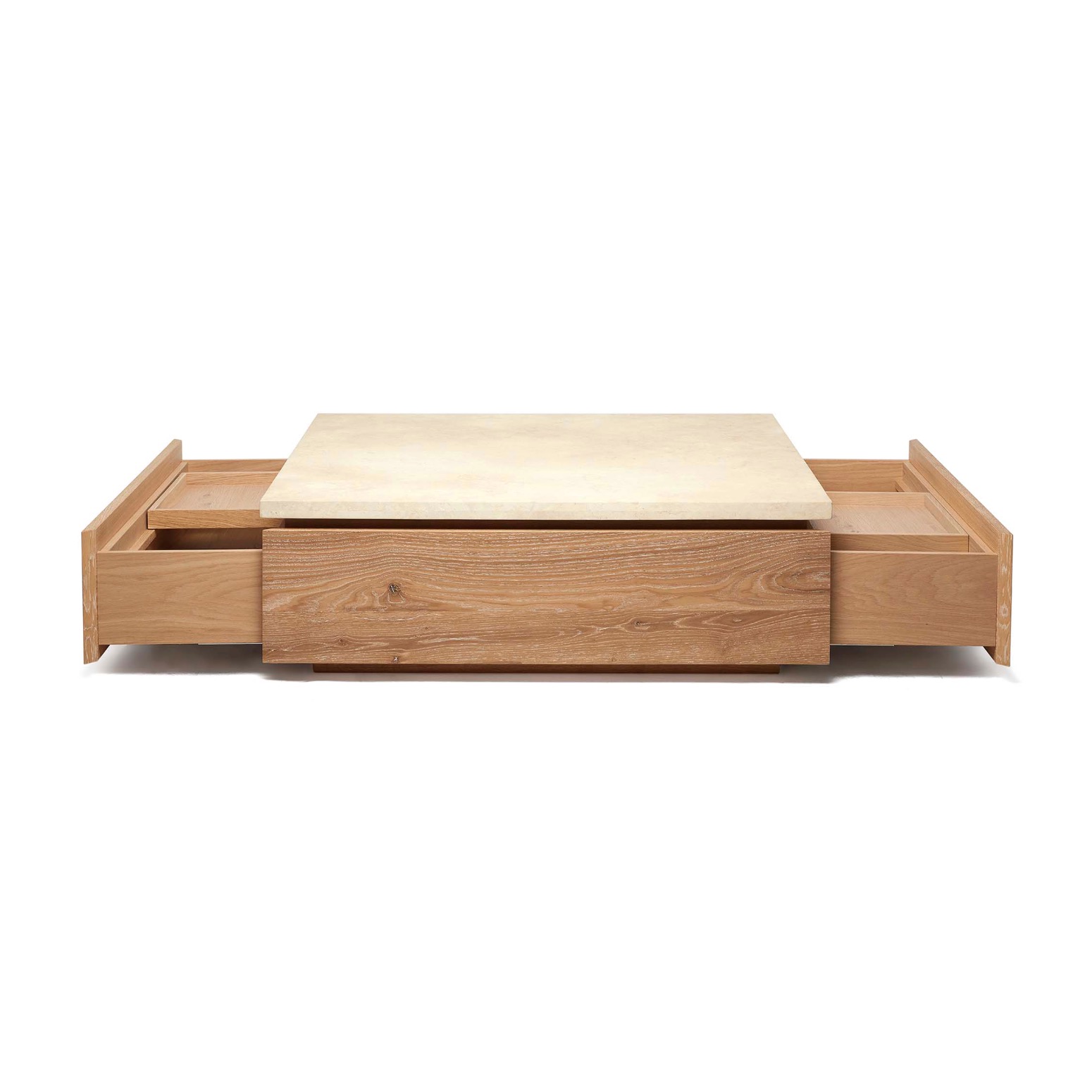 Belying its surprising utility, the great looking Branford Storage Cocktail Table boasts a honey marble top and a saddle-finished oak base fitted with tucked-away drawers.