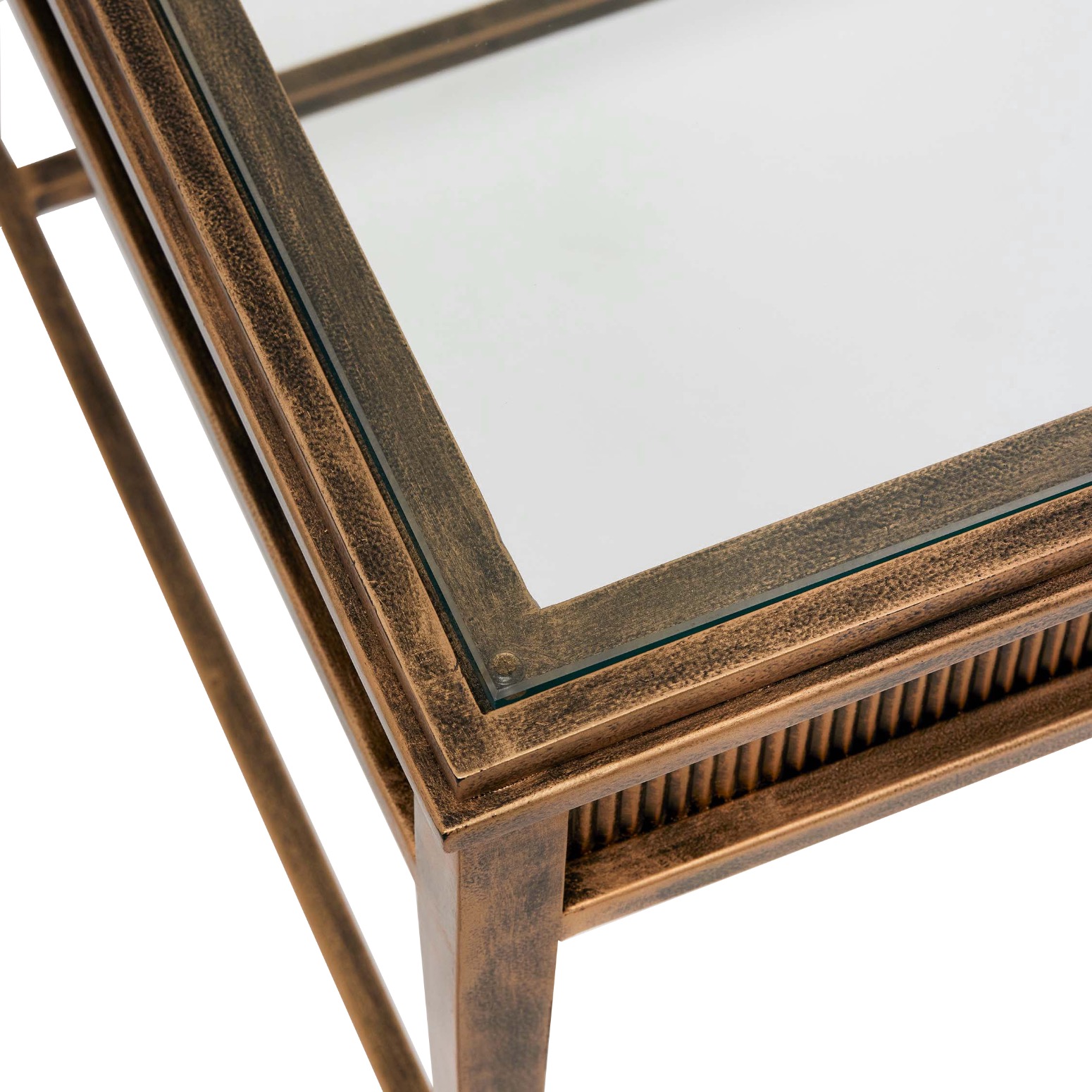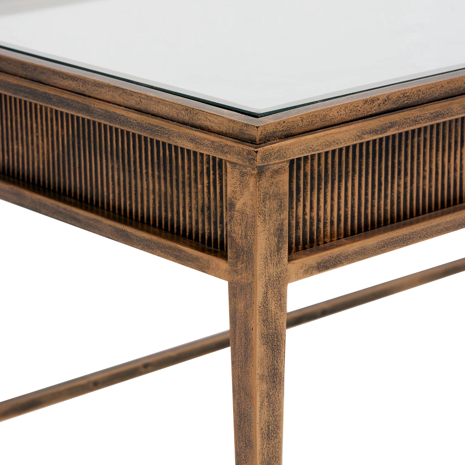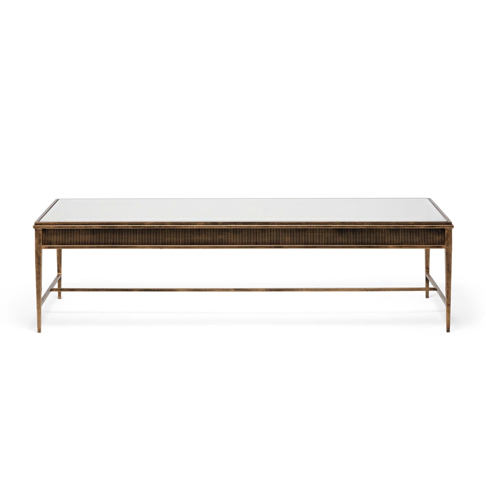 Clear glass tops the iron Camille Cocktail Table in a gilded brass finish and lets the classically elegant base steal the show.