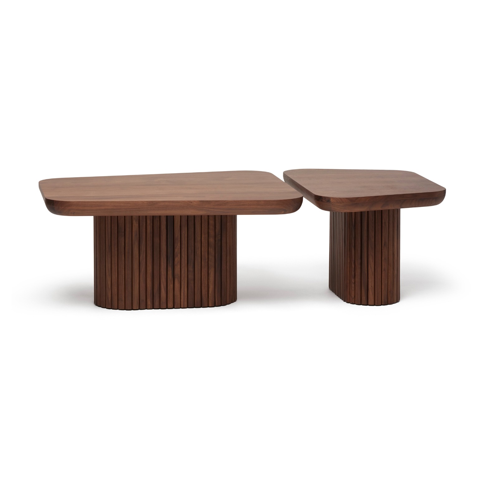 Precise fluted bases play off surprising organic tops to make the walnut Carrabelle Bunching Cocktail Tables a truly handsome statement piece.