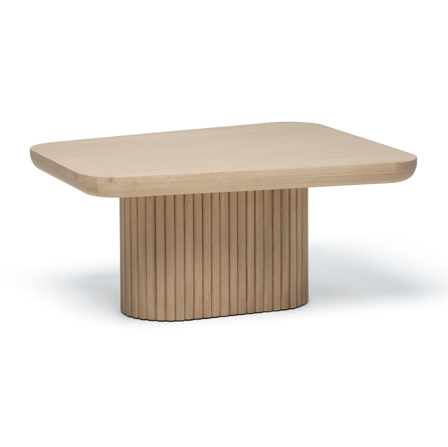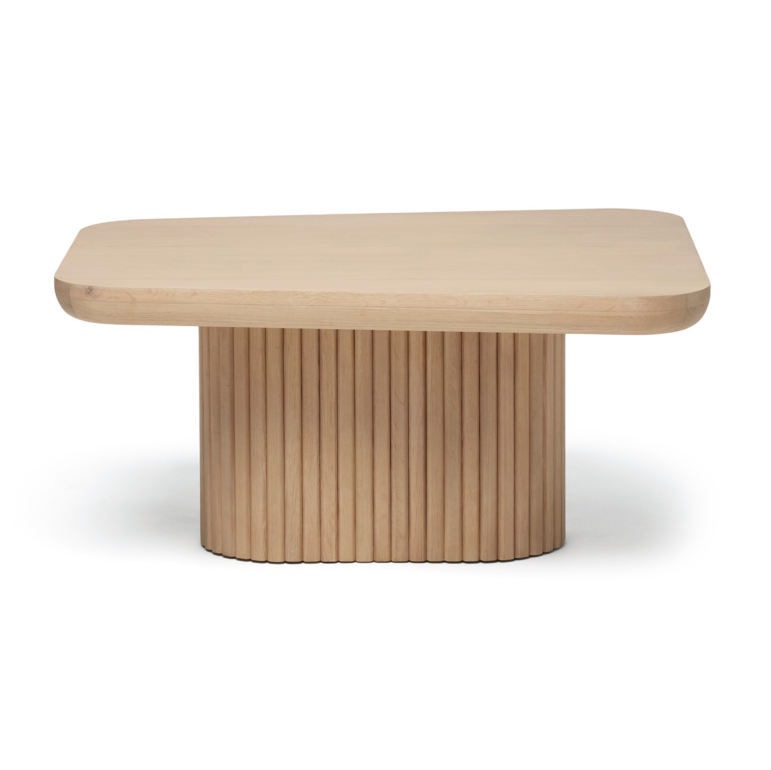 A precise fluted base plays off a surprising organic top to make the oak Carrabelle Large Cocktail Table in saddle a truly handsome statement piece.