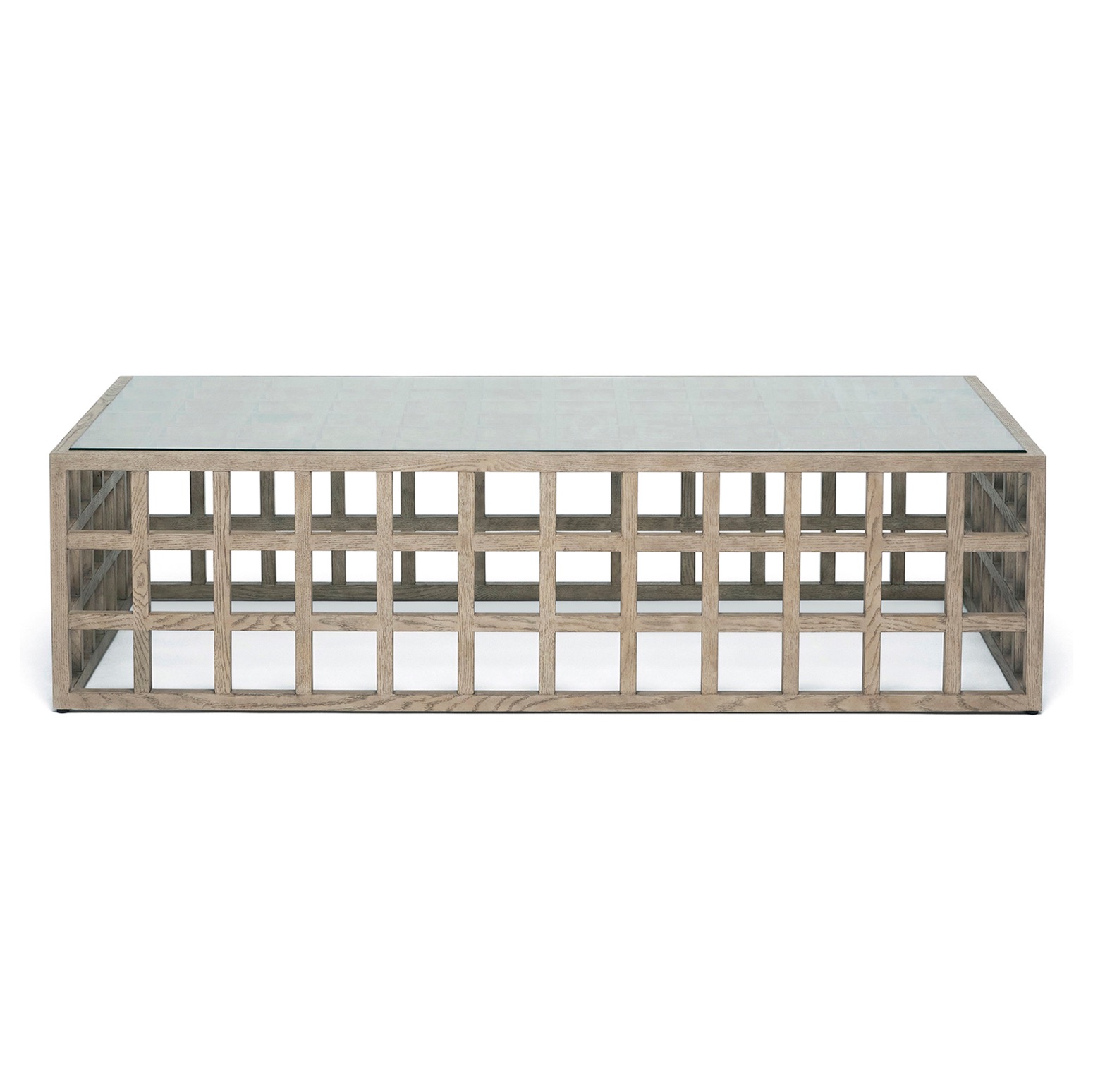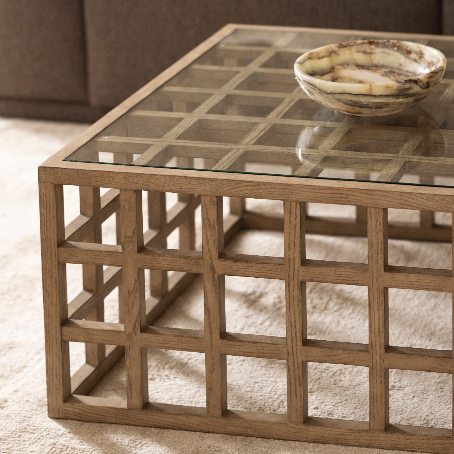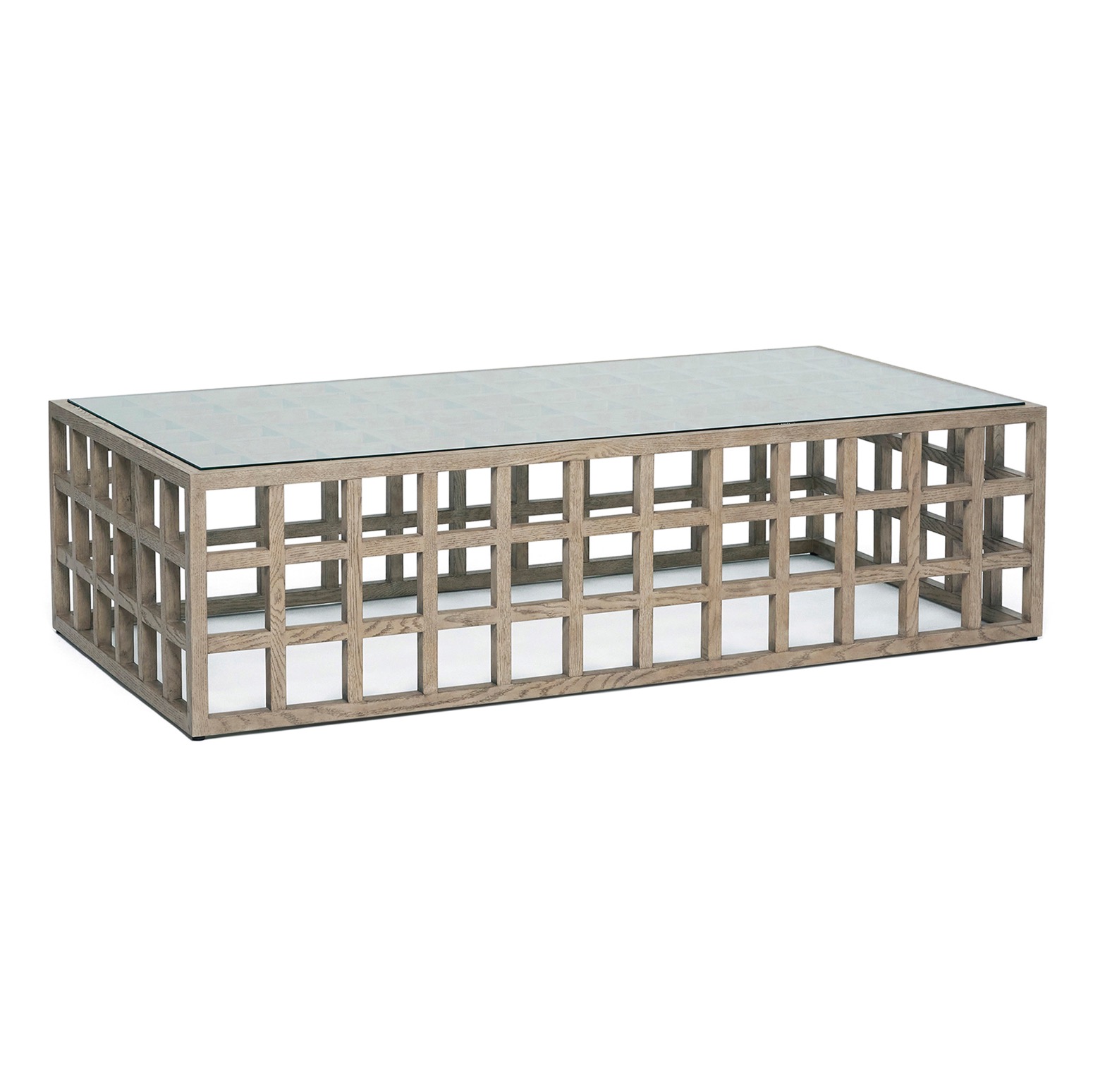 A Washed Taupe finish adds both warmth and light to the geometric feel of the glass-topped oak Corinne Rectangular Cocktail Table.
