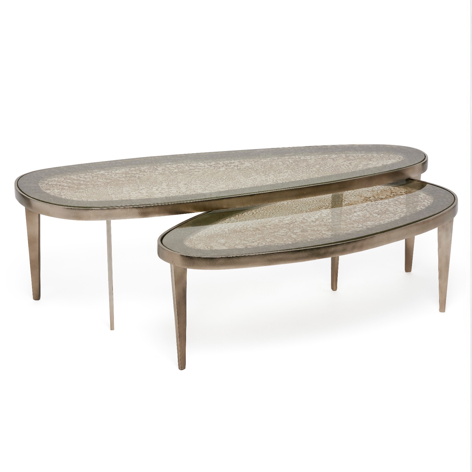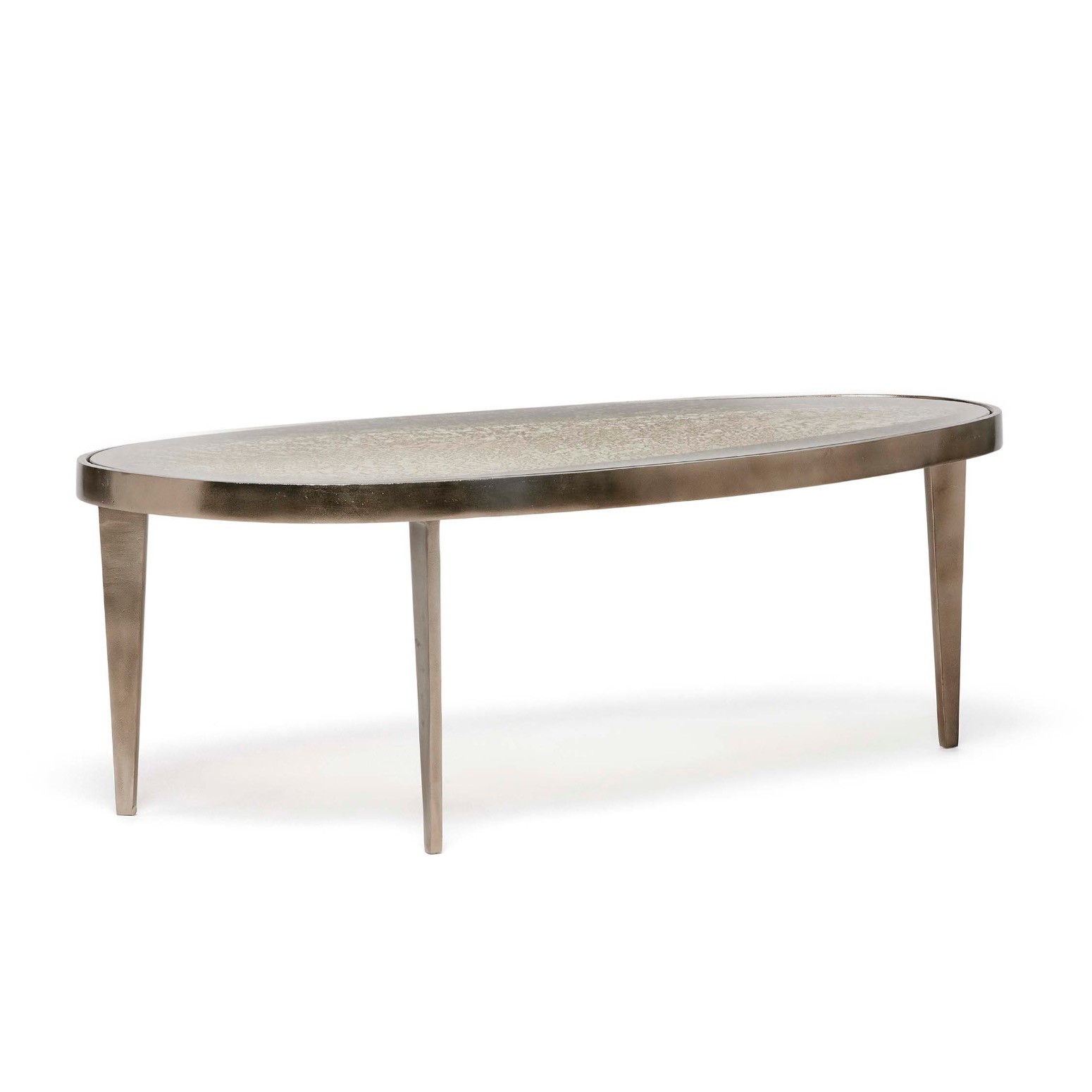 Twilight Bronze reactive glass and an aluminum base in a Twilight Bronze finish add dramatic flair to the eye-catching small Jan Cocktail Table.
