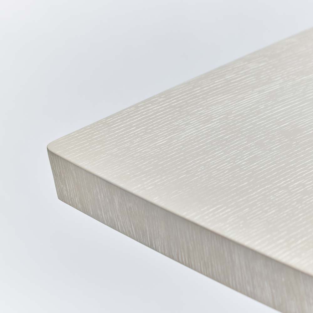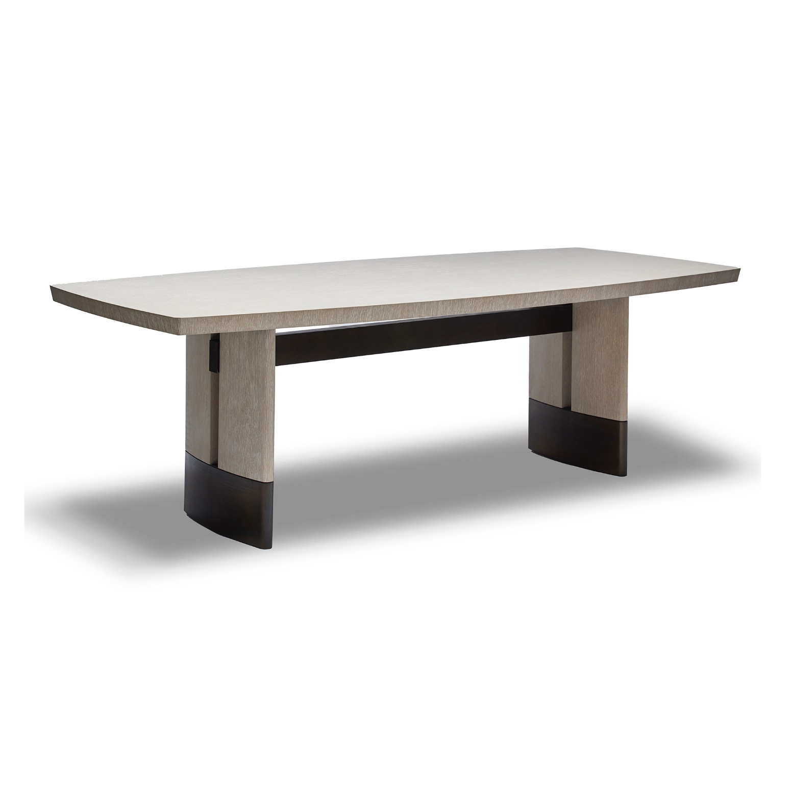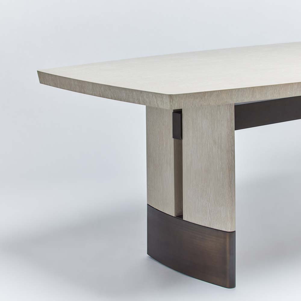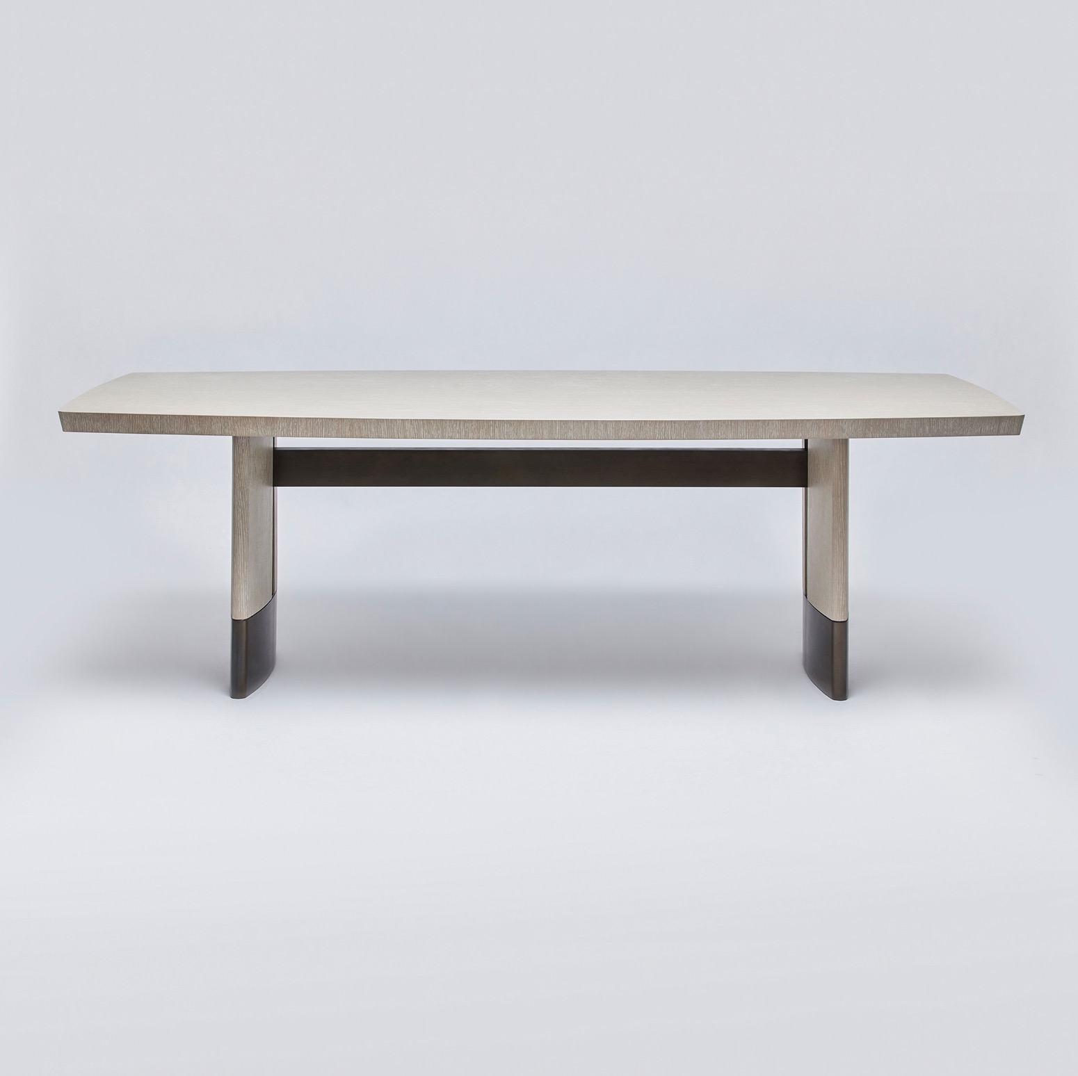 With a modern influence, the wood Boynton Dining Table boasts a cliffside finish and classic bronze metal accents.
