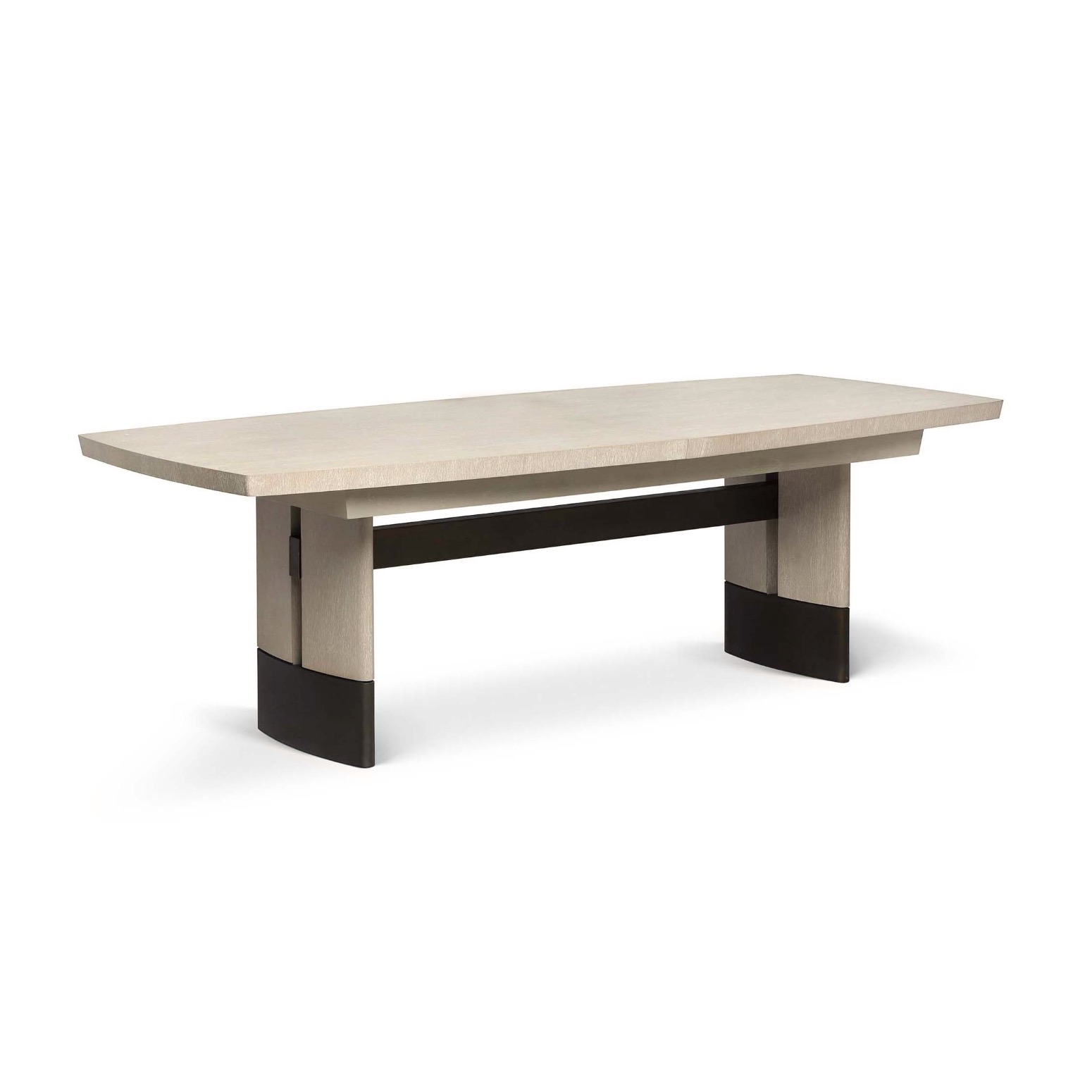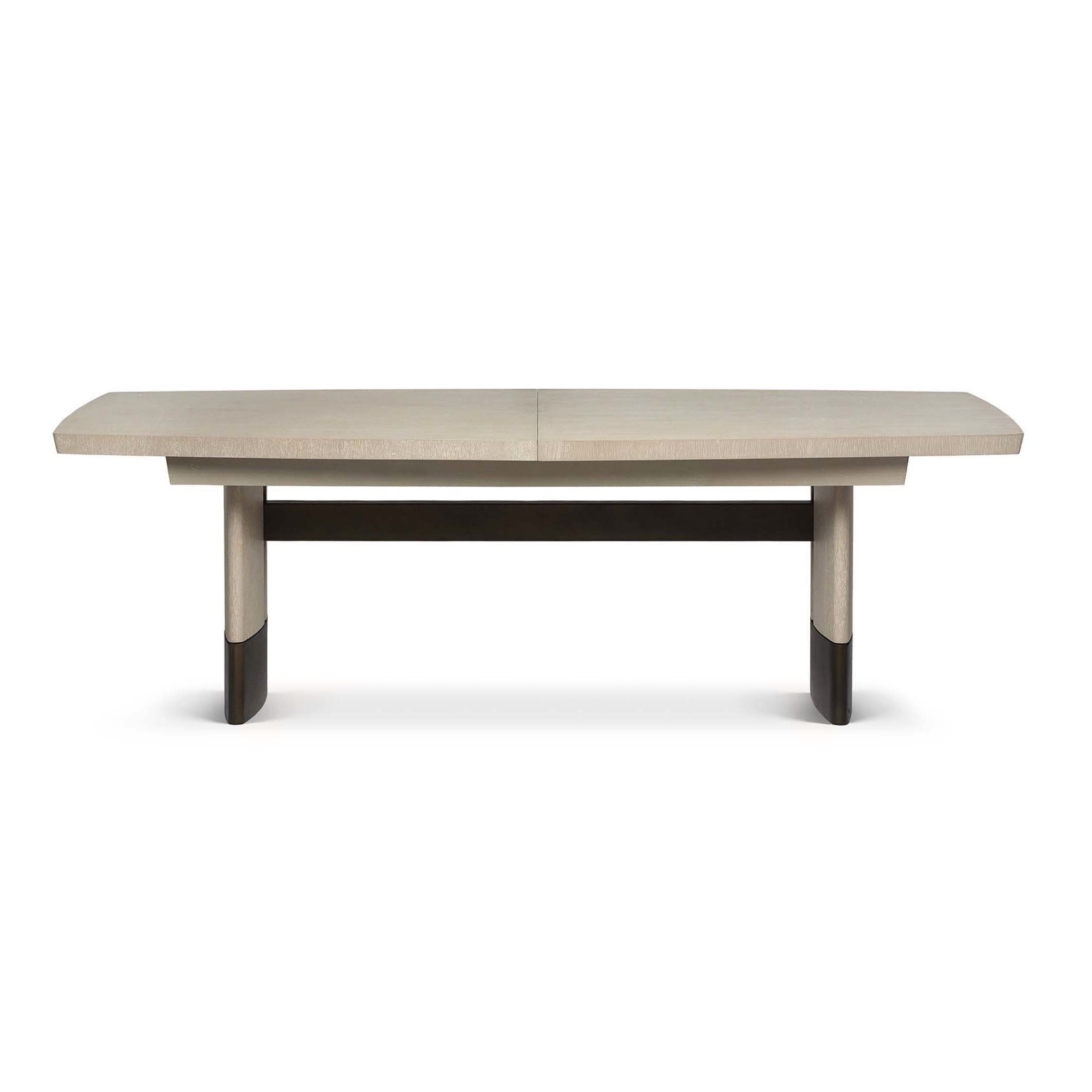 With a midcentury modern influence, the wood Boynton Self-Storing Extension Table boasts a cliffside oak finish and classic bronze metal accents.