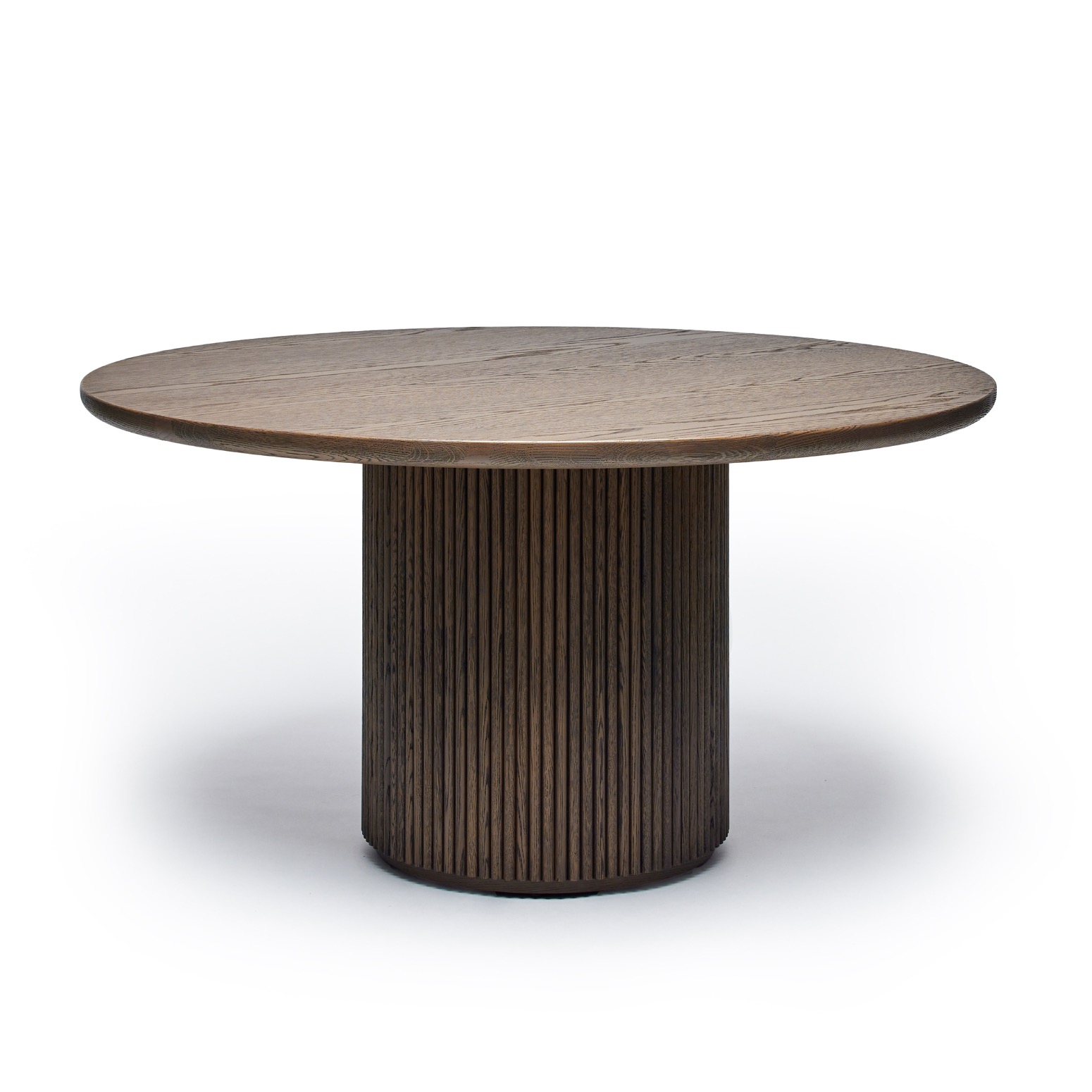 Crafted of mocha-stained oak and boasting a fabulous fluted base, the boldly sized Laurel Round Dining Table is an organic statement piece.