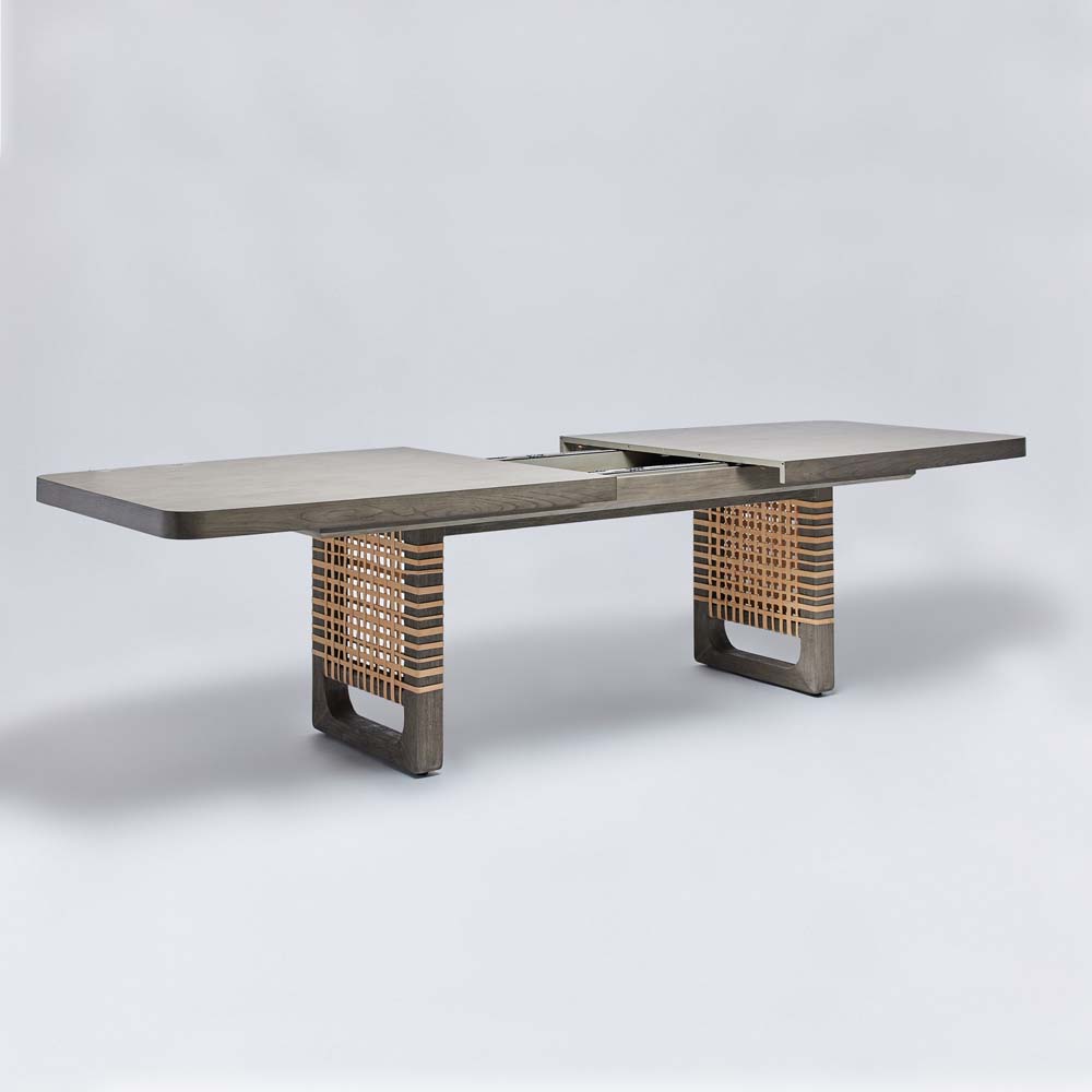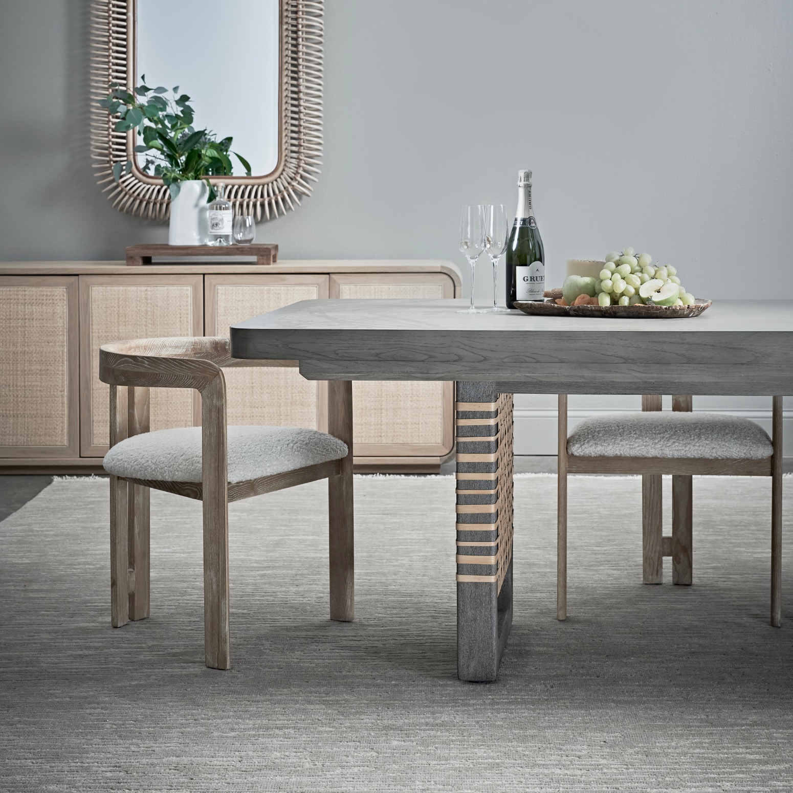 A dash of midcentury and a touch of organic, the Osprey Extension Table, including a 24"W removable leaf extension, is crafted of washed grey wood with natural rattan and grey cerused accents.