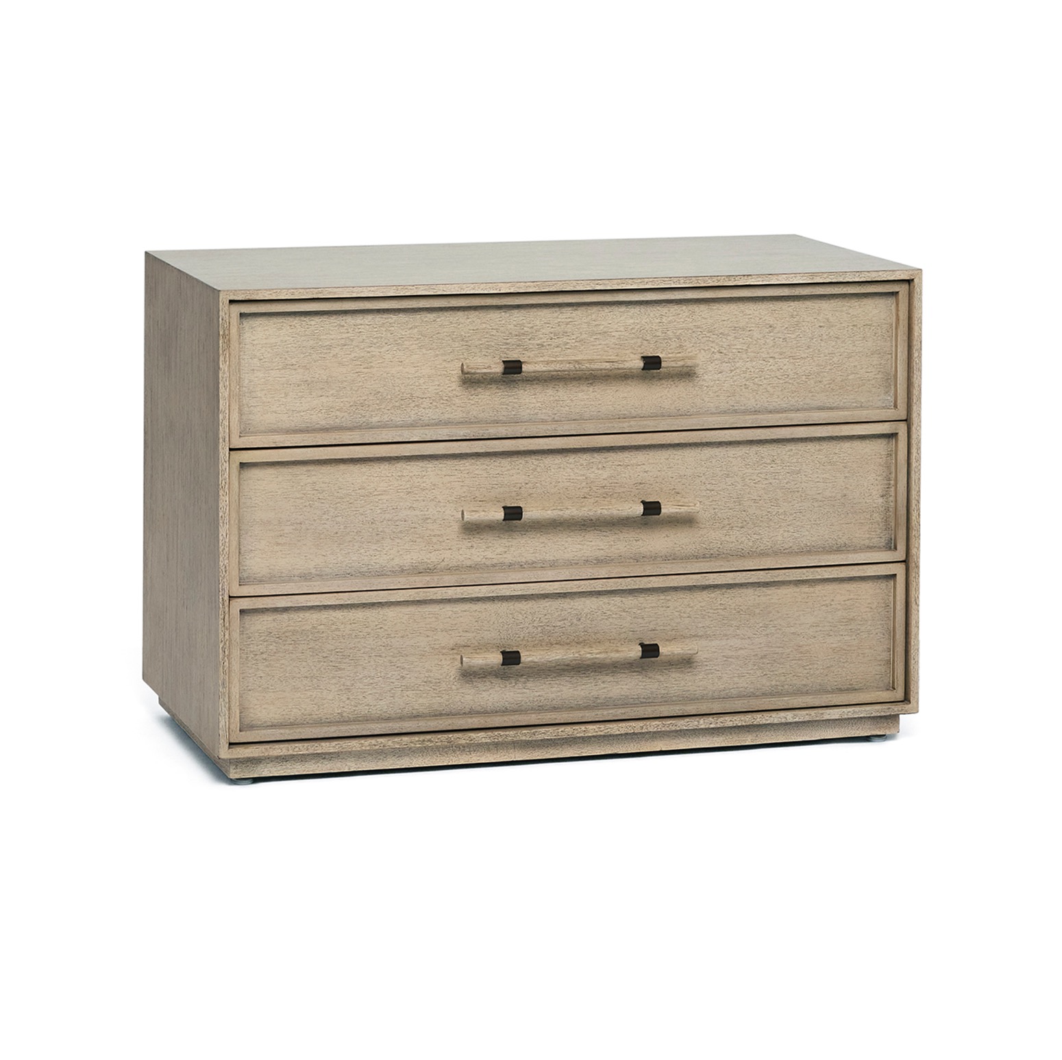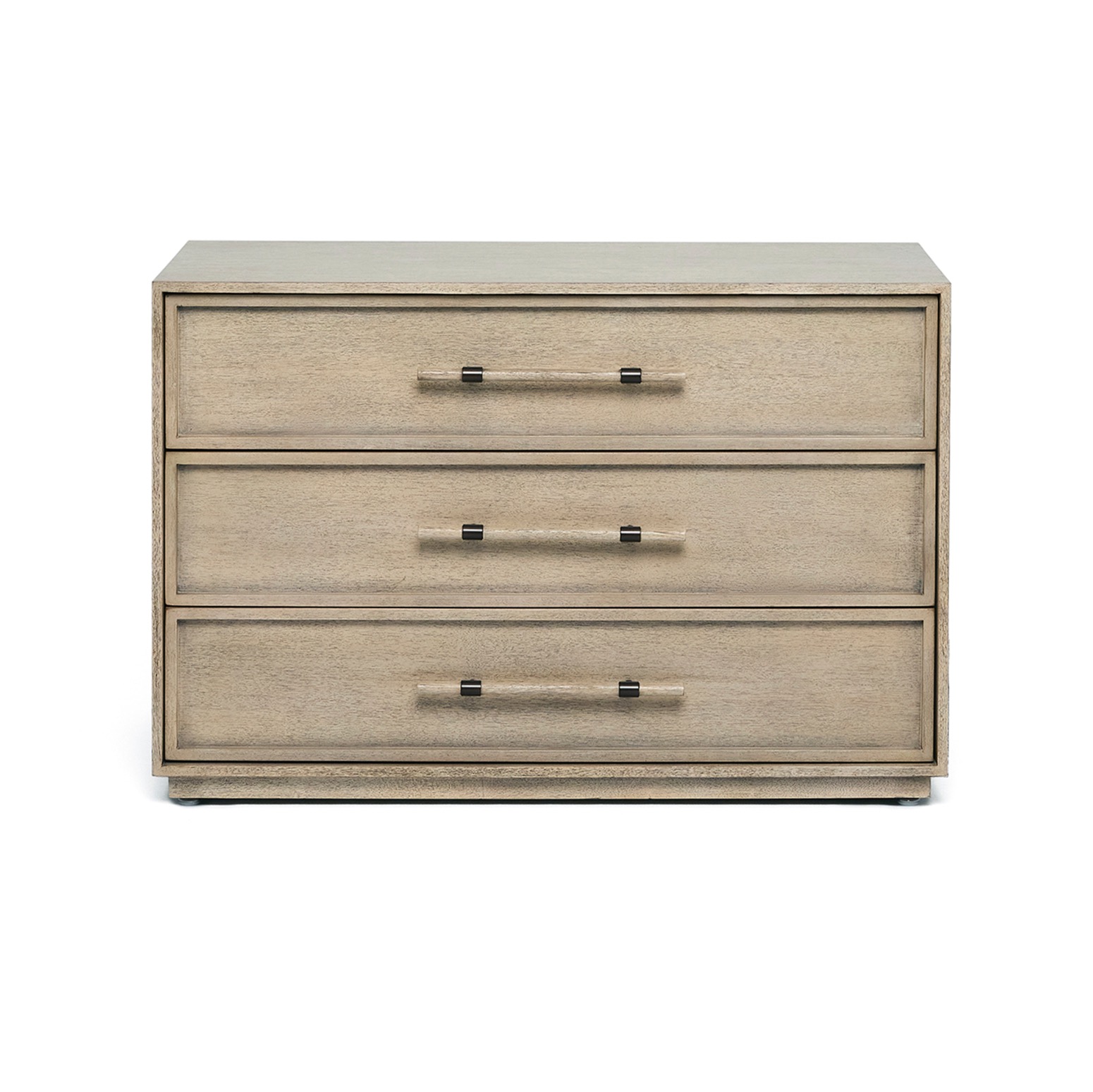 Crafted of mahogany in a washed taupe finish and featuring faux horn and brushed brass metal hardware, the Clement Bedside Chest showcases integrity and artisanal vibes.