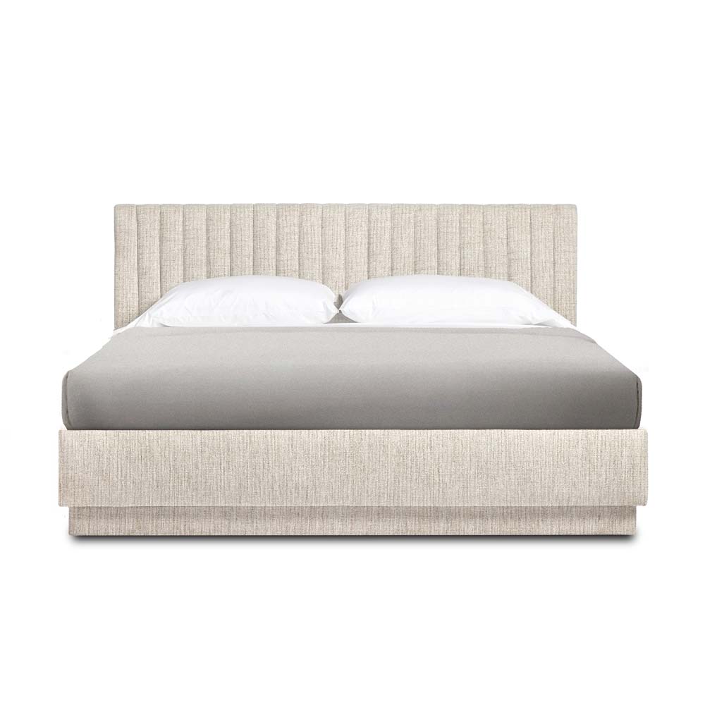 Art Deco-inspired and stunningly glamorous, the Skylar King Bed in Aria Sand features streamlined vertical channels on the headboard.