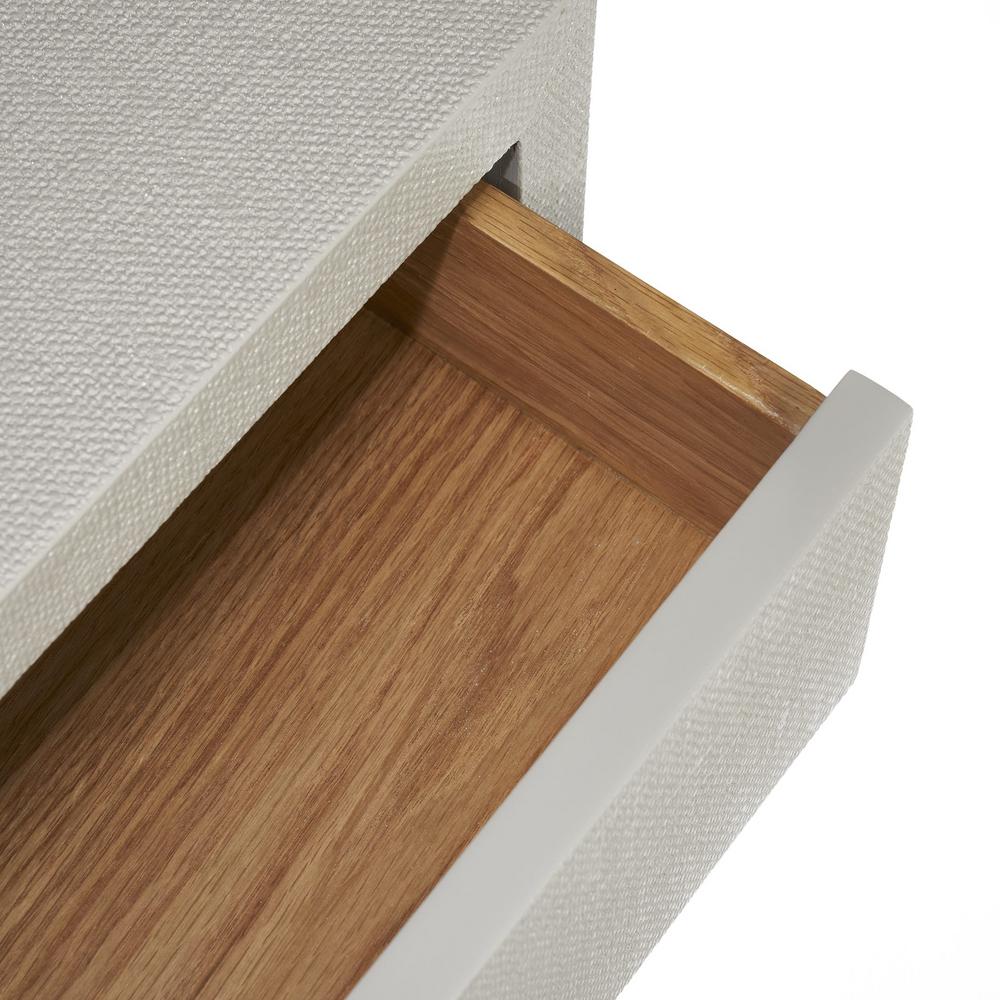 The clean lines of the Taylor Bedside Chest are transformed into a statement piece thanks to the texture of light grey faux linen and metal pulls in antique brass.
