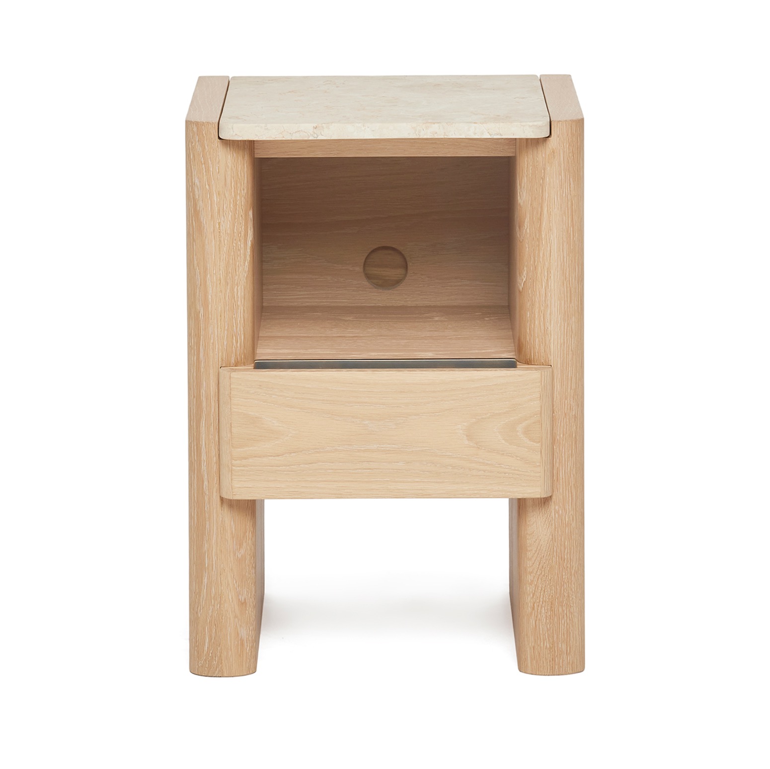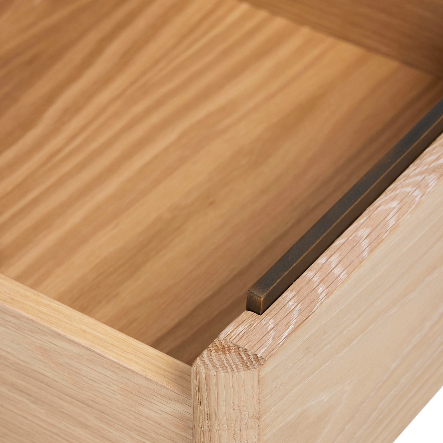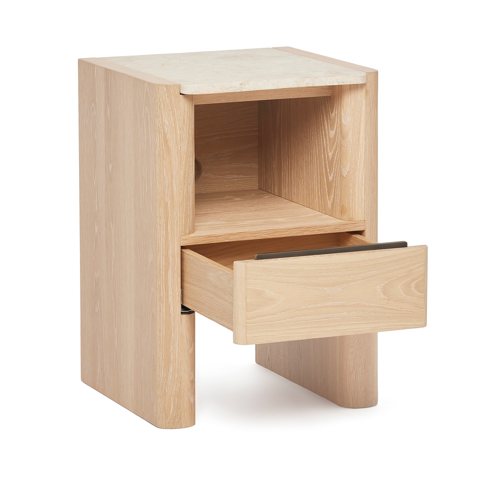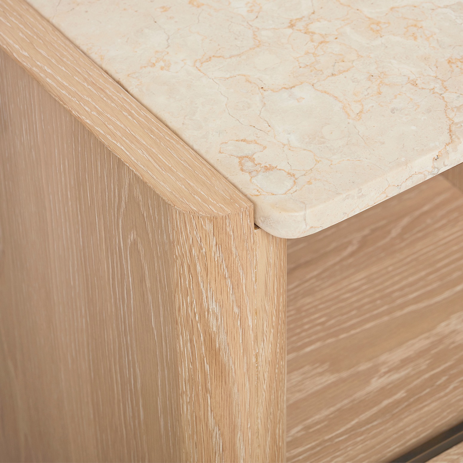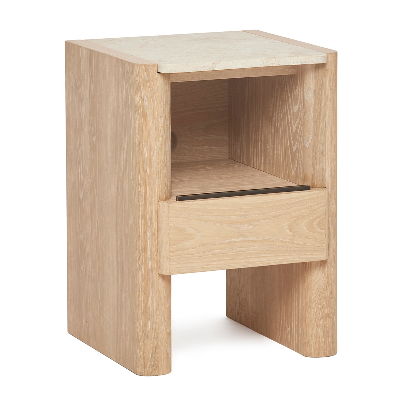 Substantial yet airy, versatile yet luxe, the Arden Small Bedside Chest is crafted of oak in a saddle finish and topped with honey marble.