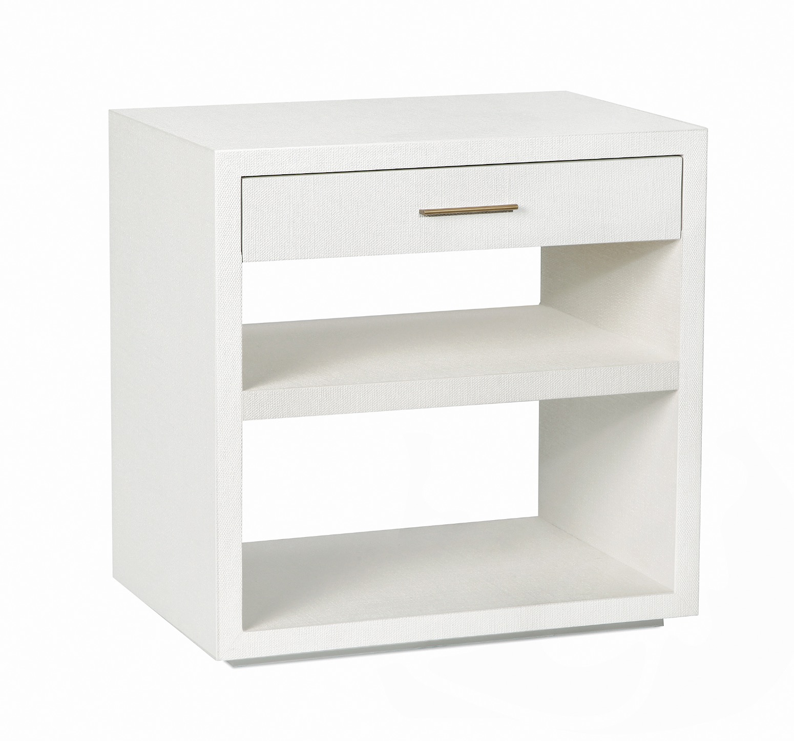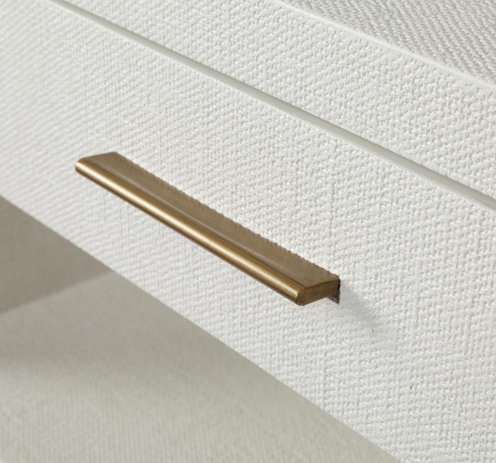 A practical bedside chest manages to retain its chic style when it's composed of natural white hand cast faux linen and antique brass-finished metal.