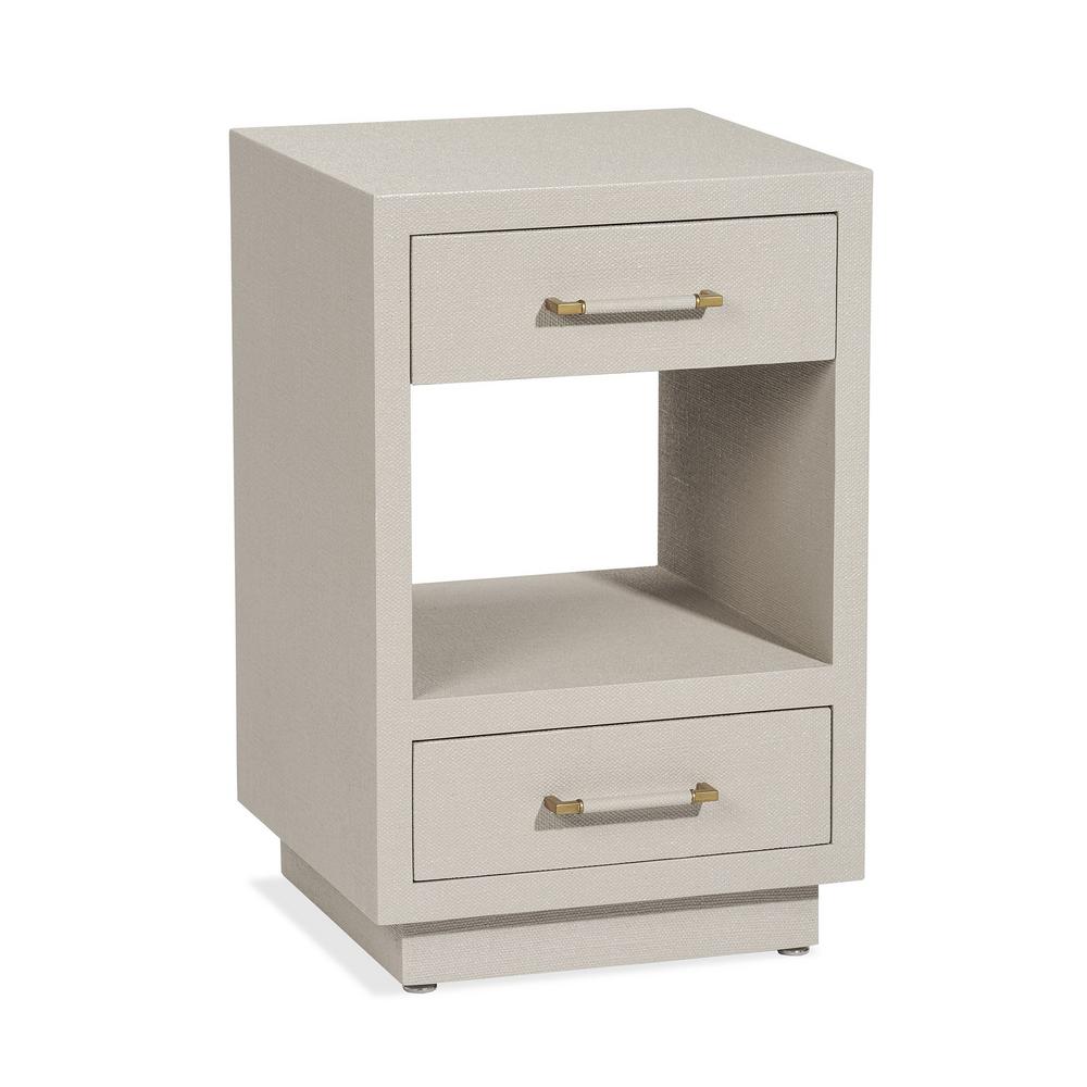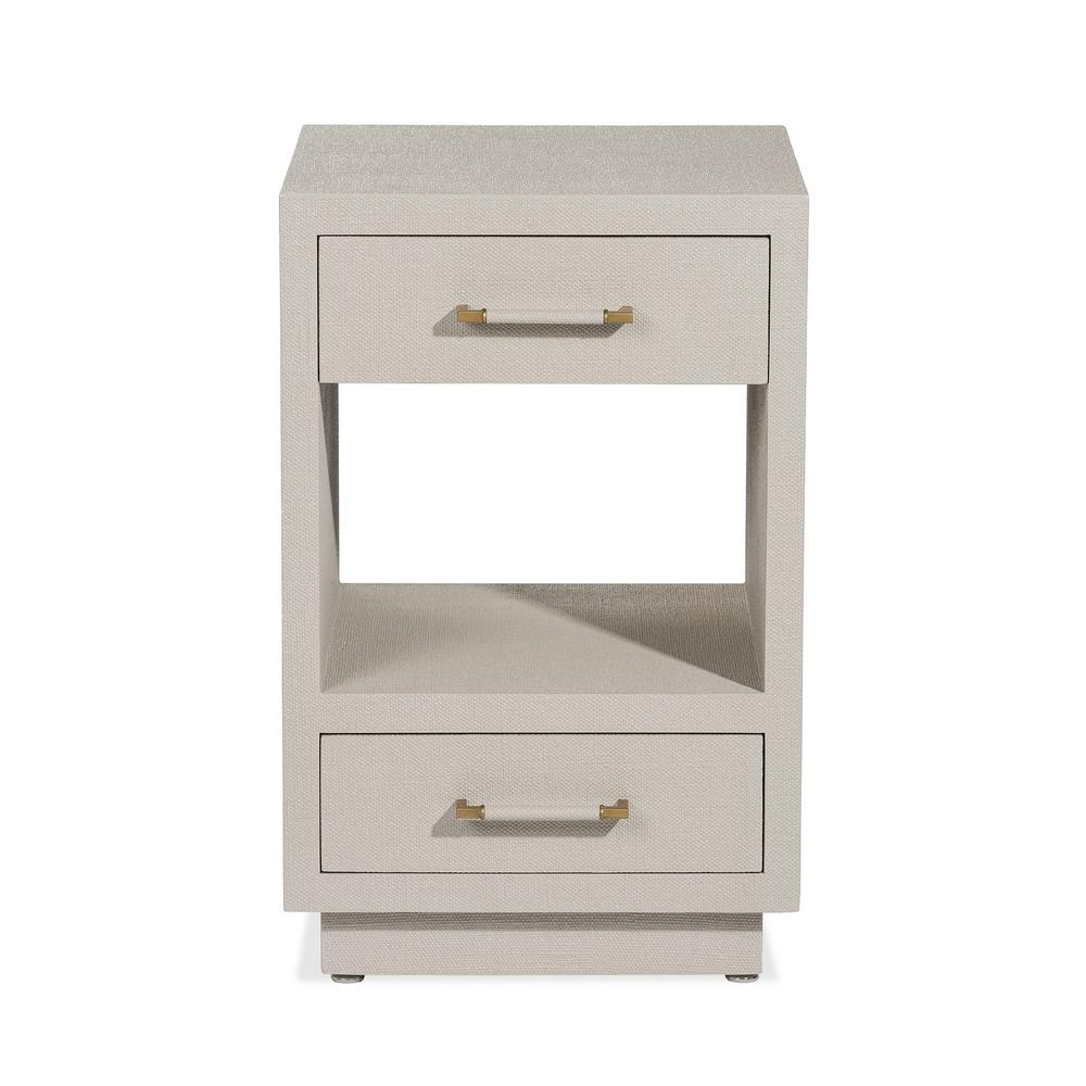 The clean lines of the Taylor Small Bedside Chest are transformed into a statement piece thanks to a surface of Caribbean Sand faux linen and metal pulls in Antique Brass.