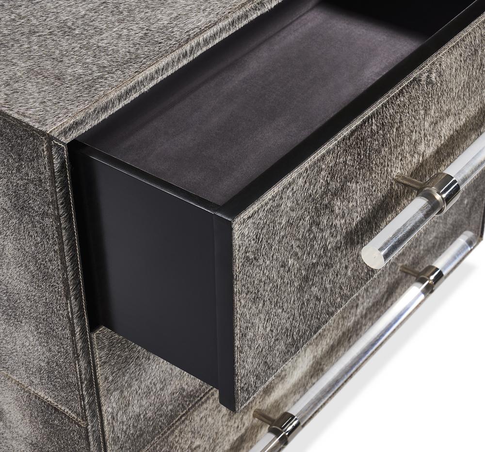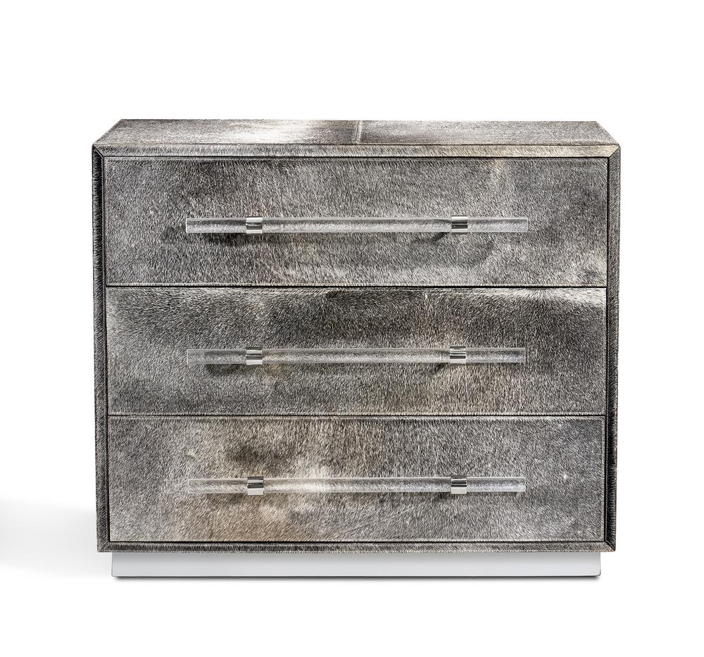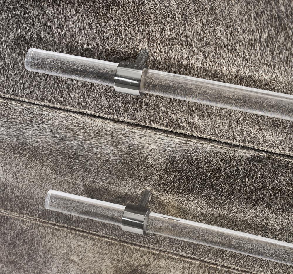 Light natural grey hide pairs with clear acrylic pulls and polished nickel accents to make the Cassian 3 Drawer Chest - 36"H a totally chic addition to any bedroom.