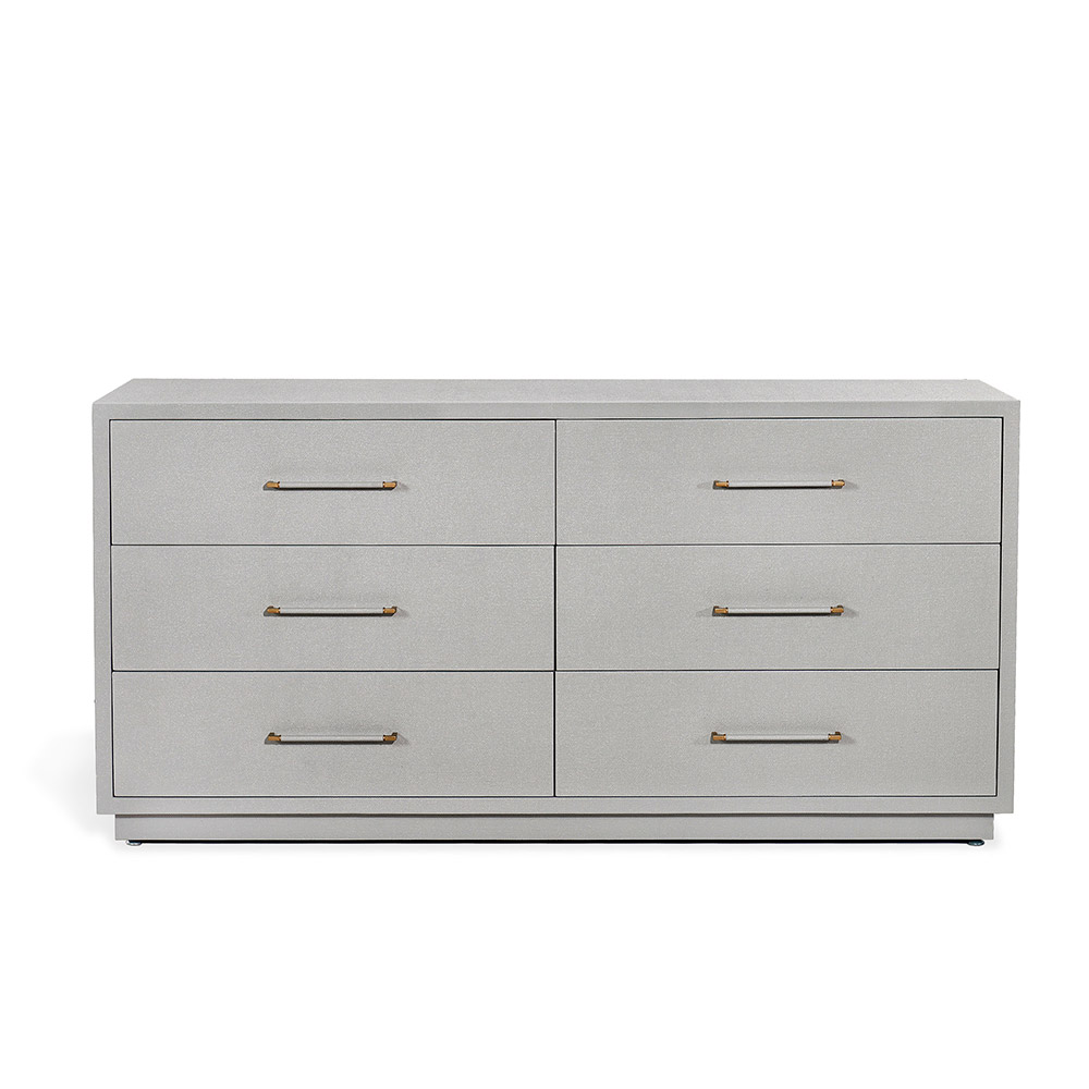 The clean lines of the Taylor 6-Drawer Chest are transformed into a statement piece thanks to a surface of light grey faux linen and metal pulls in an antique brass finish.