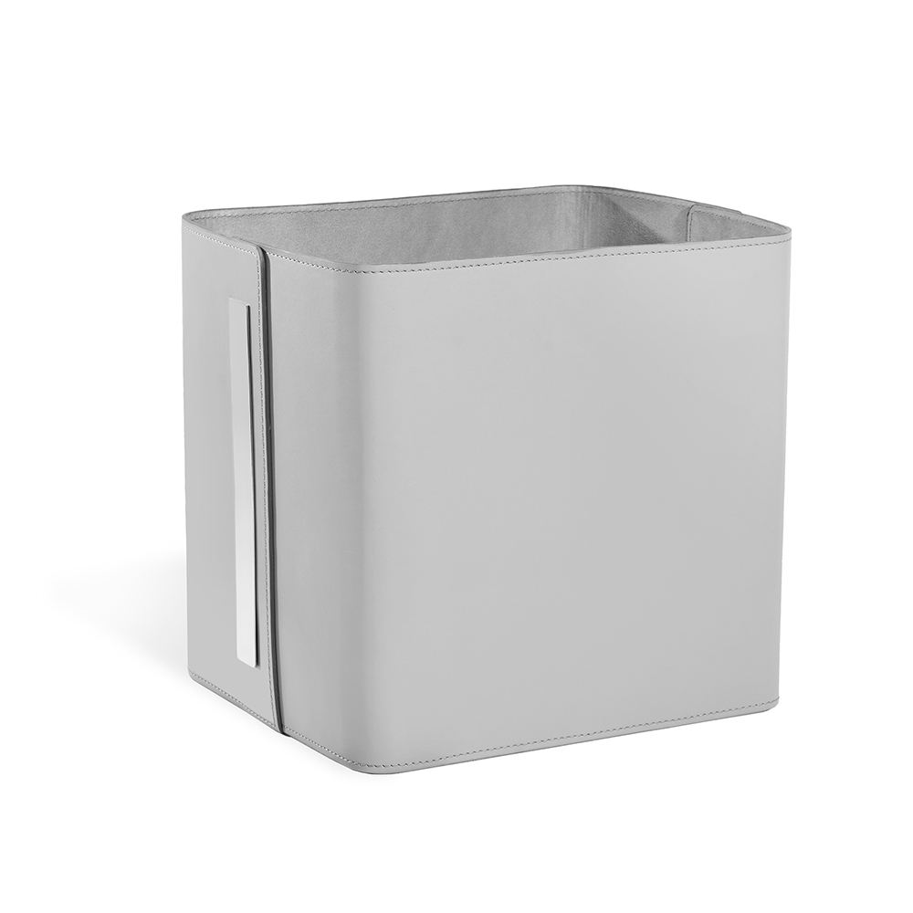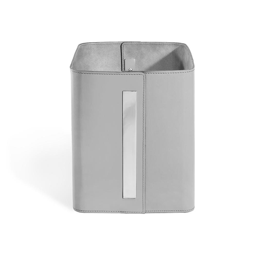 With its stunning light grey leather and polished nickel metal accents, the Portia Storage Basket makes for a versatile vessel used as a wastebasket or chic storage.