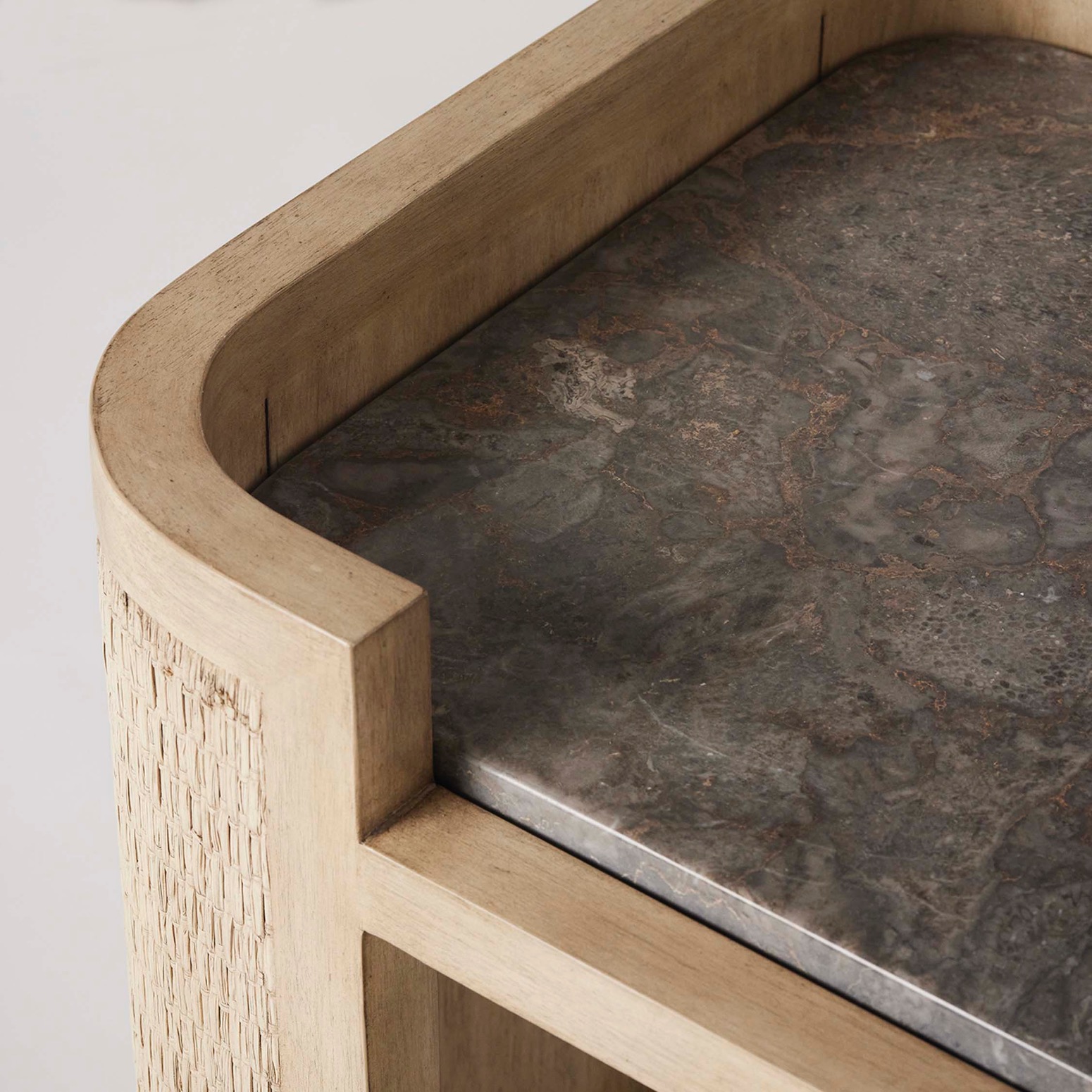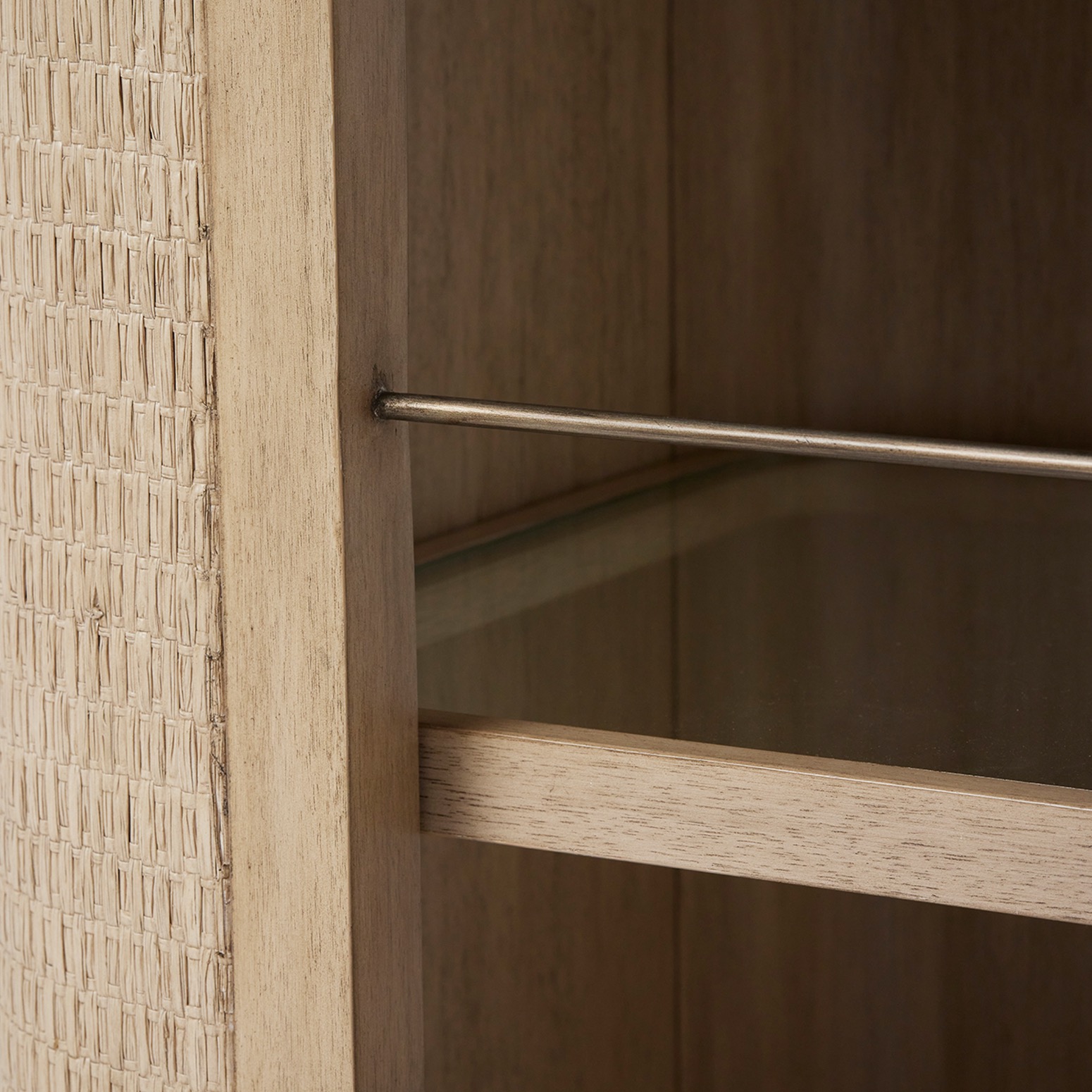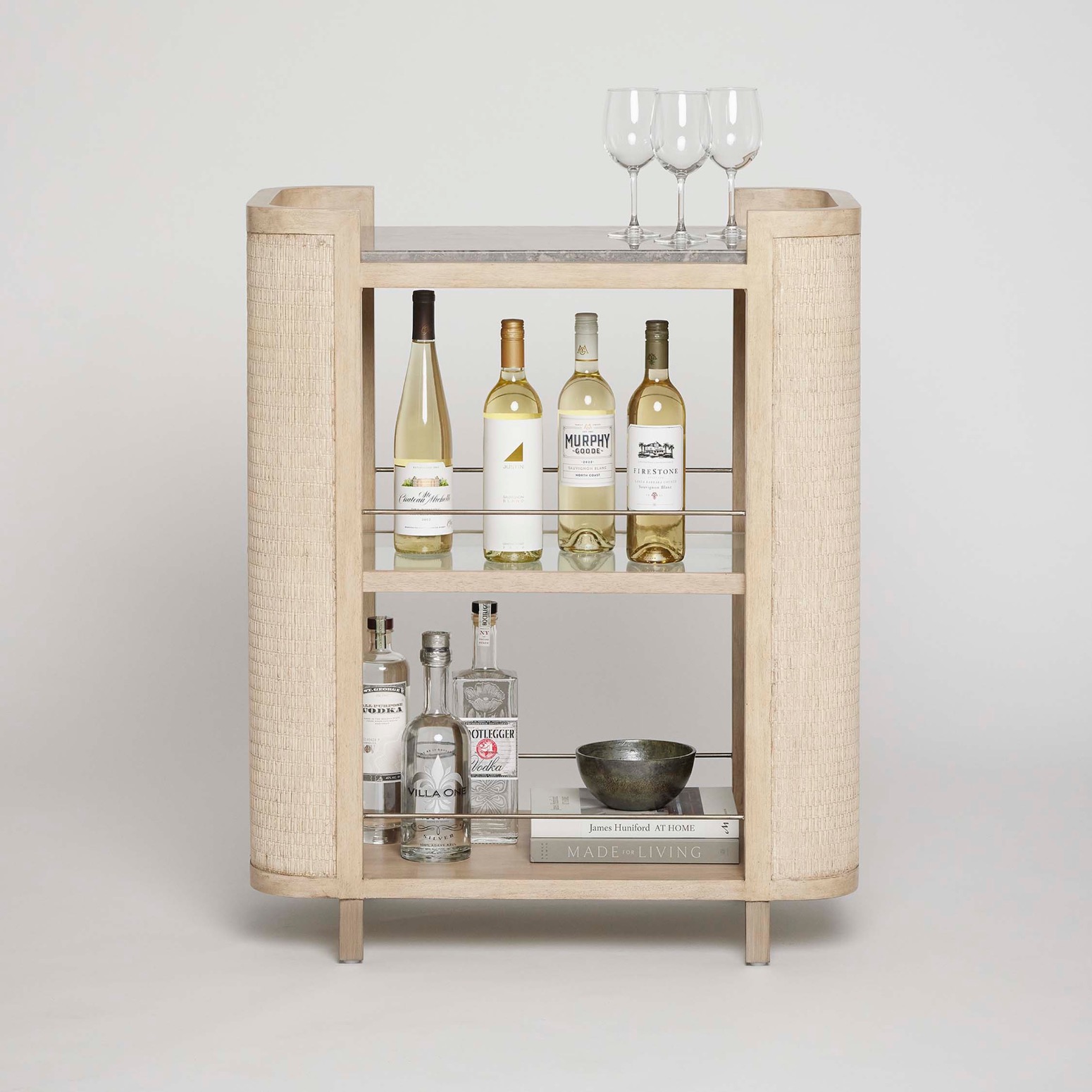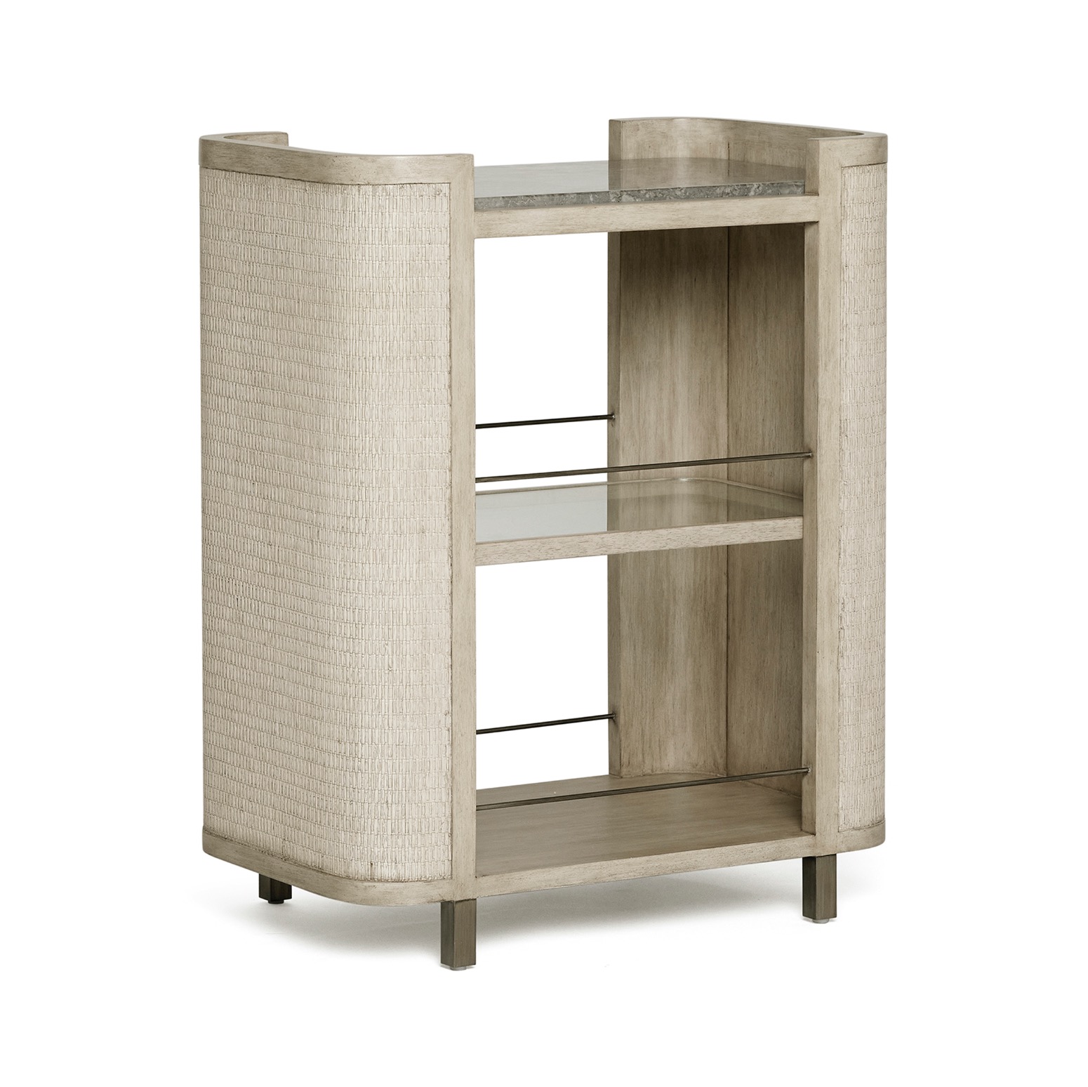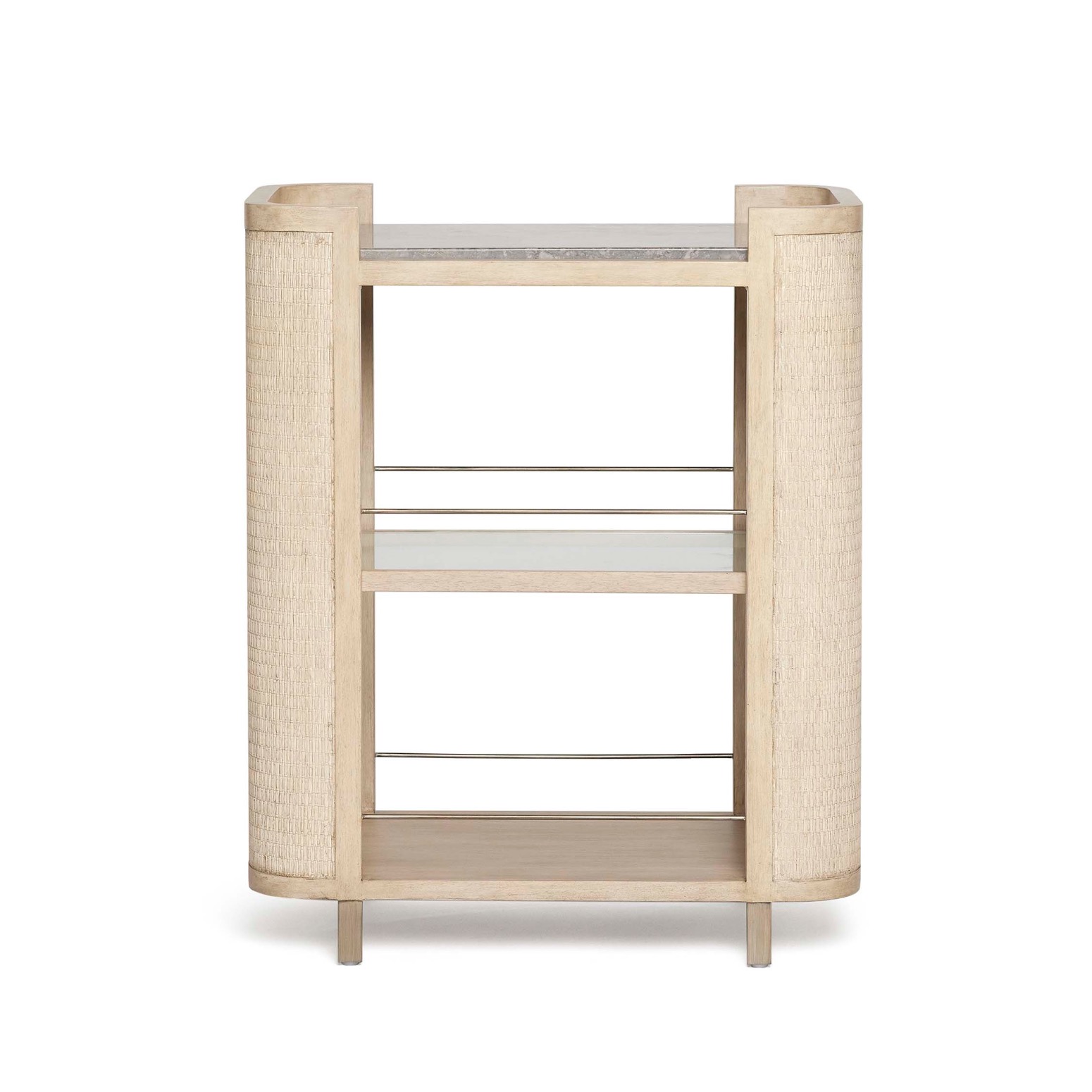 Crafted of Washed Taupe wood, rattan and Satin-Aged bronze, the Harperly Bar Cart brings organic flair to an entertaining essential.