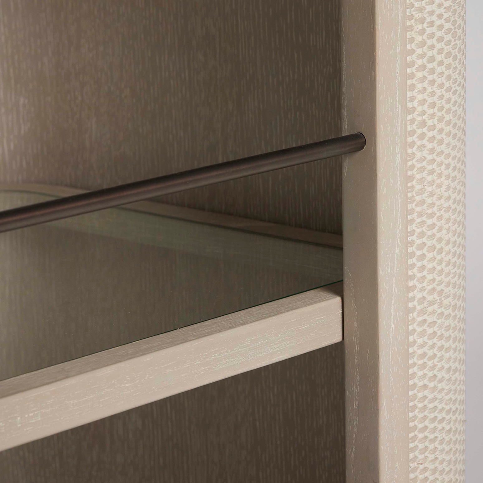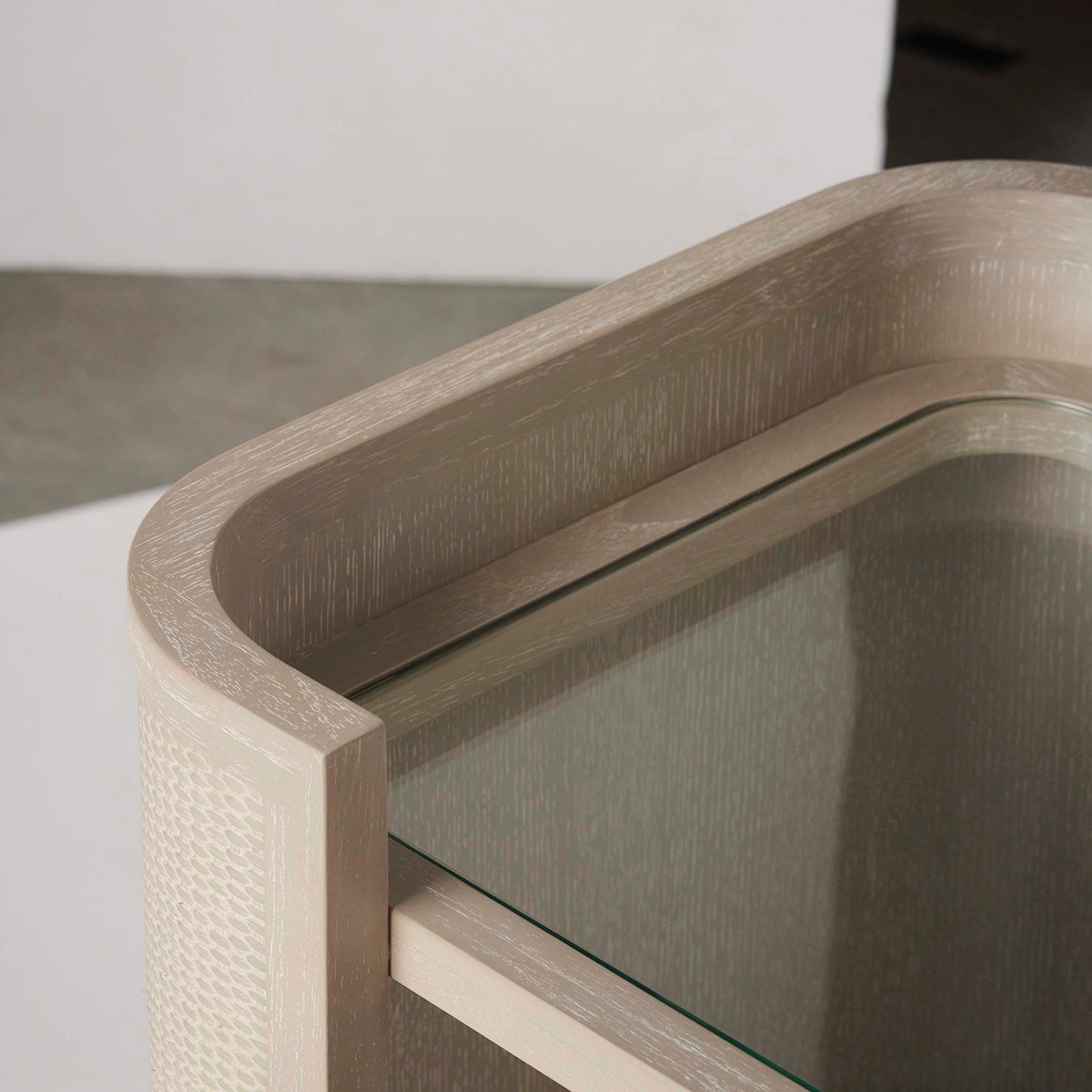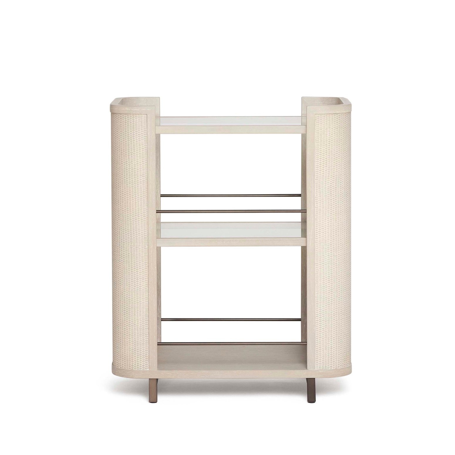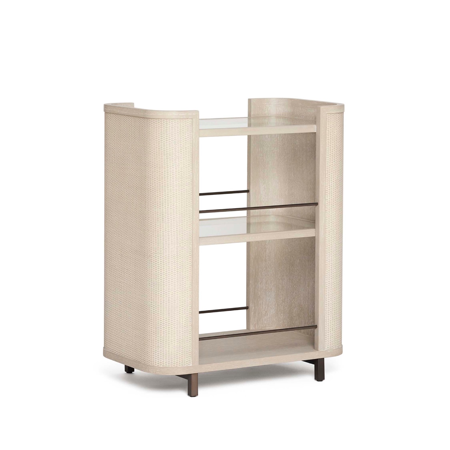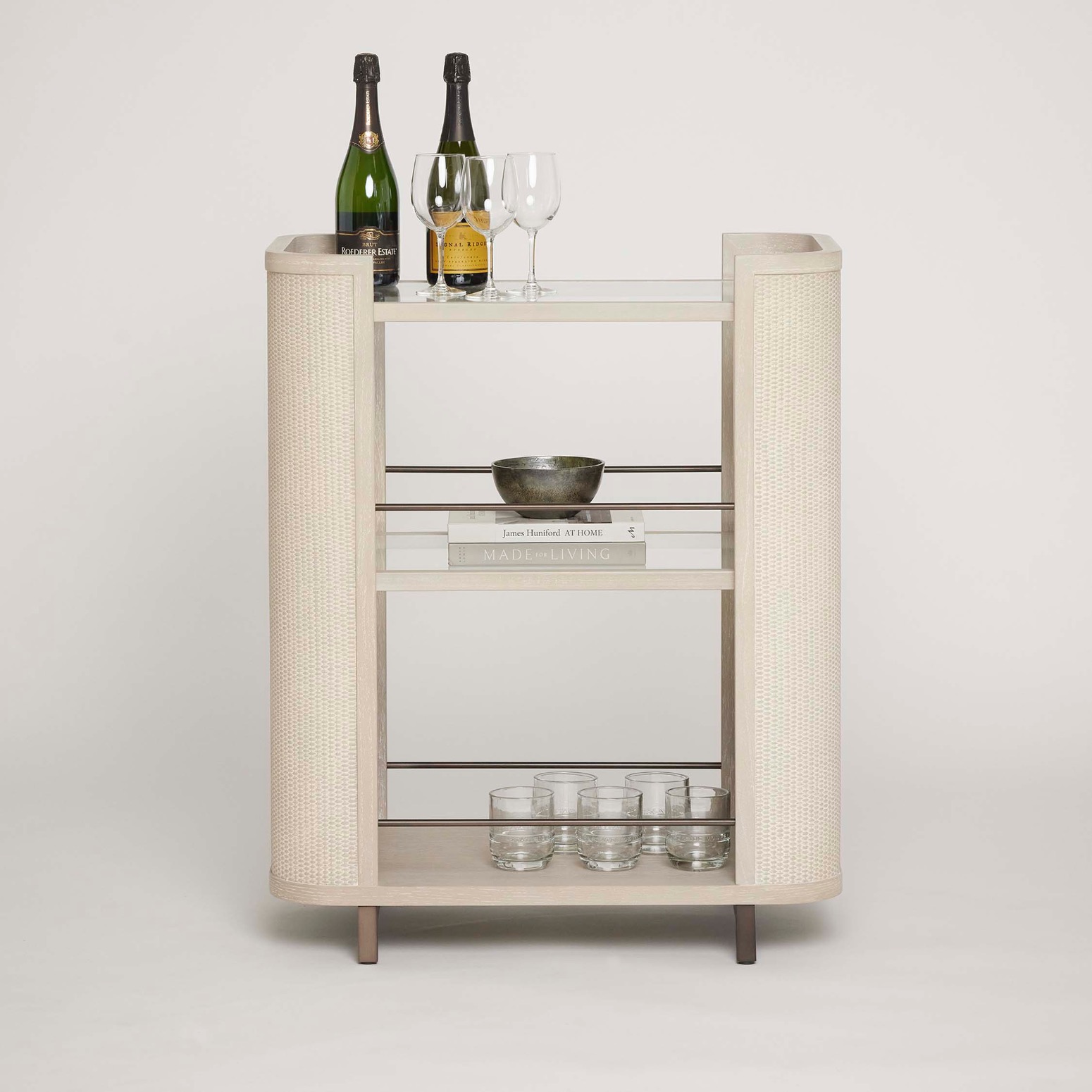 A cliffside finish brings a breezy feel to the versatile oak Holmes Bar Cart and metal hardware in a classic bronze finish.