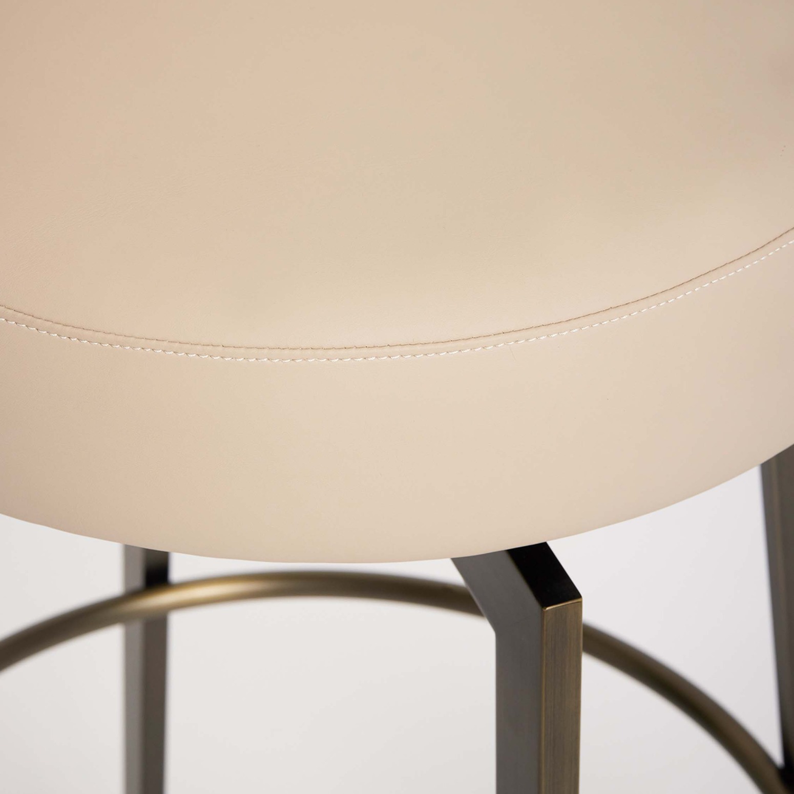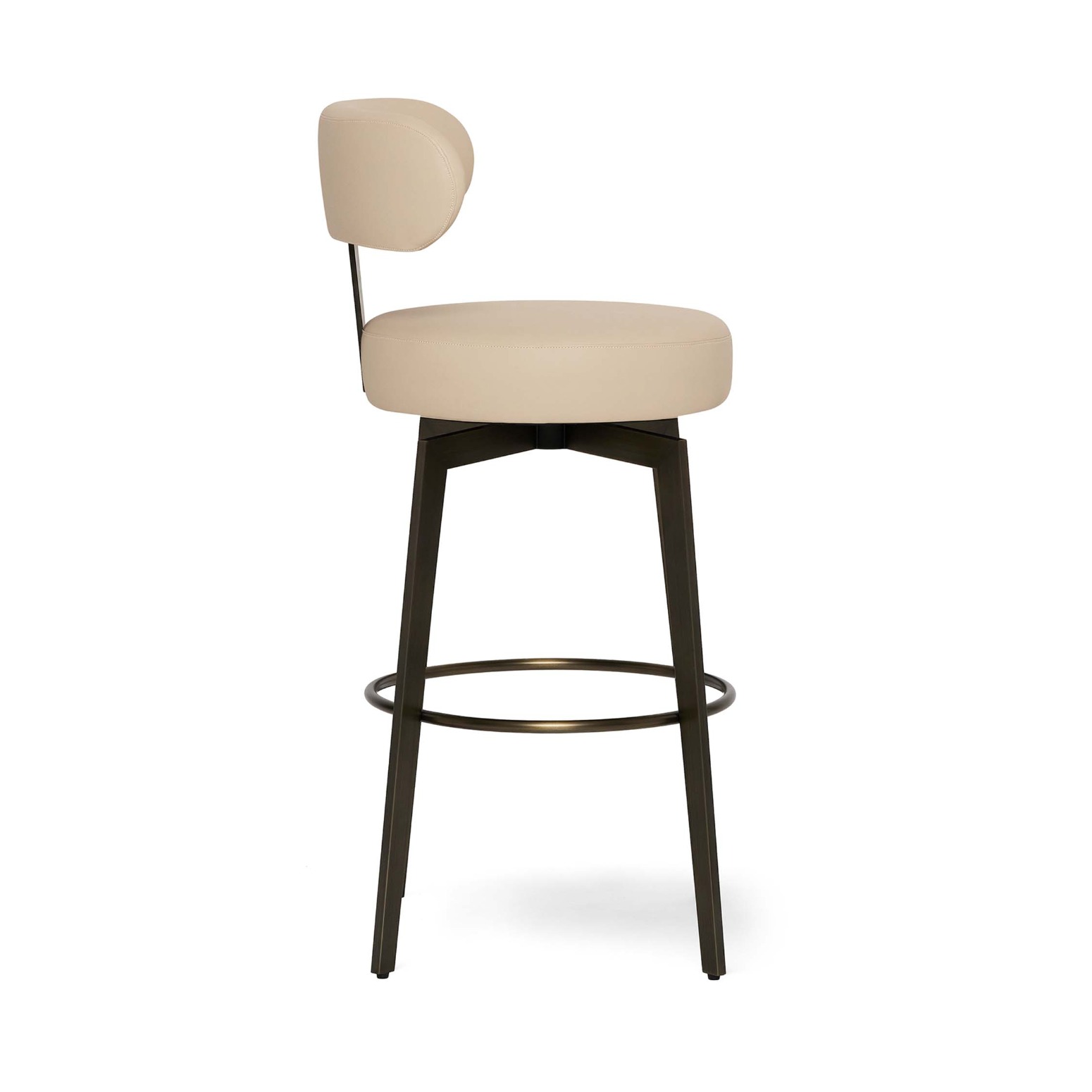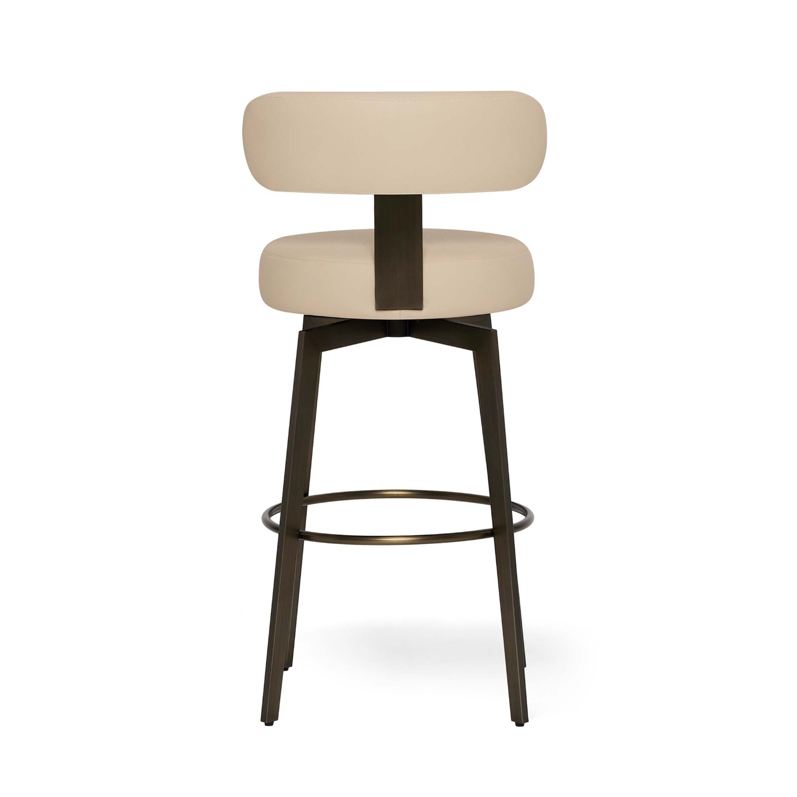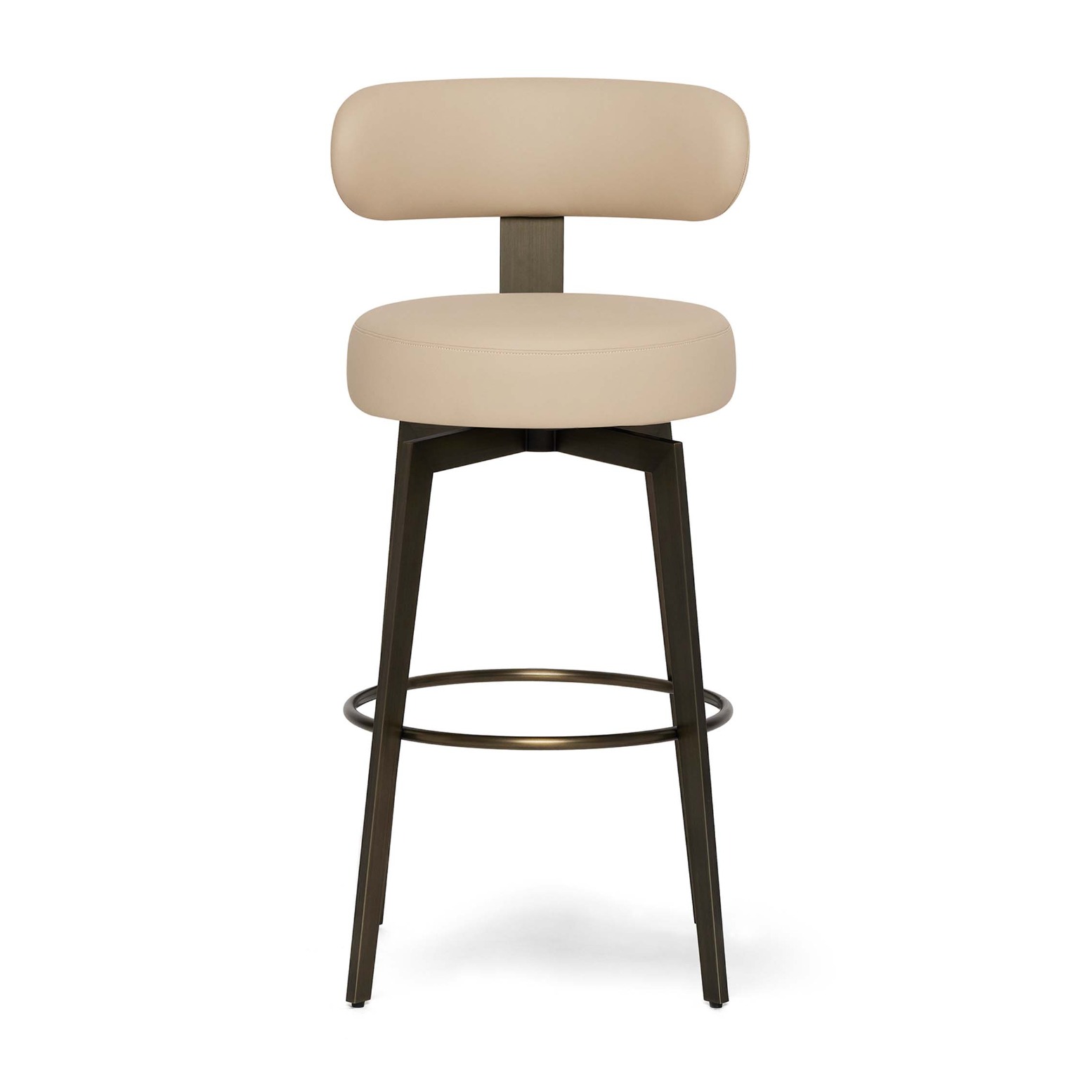 Boasting a stainless frame in antique bronze and cream latte vegan leather upholstery, the Clermont Bar Stool brings style to a classic swivel seating option.