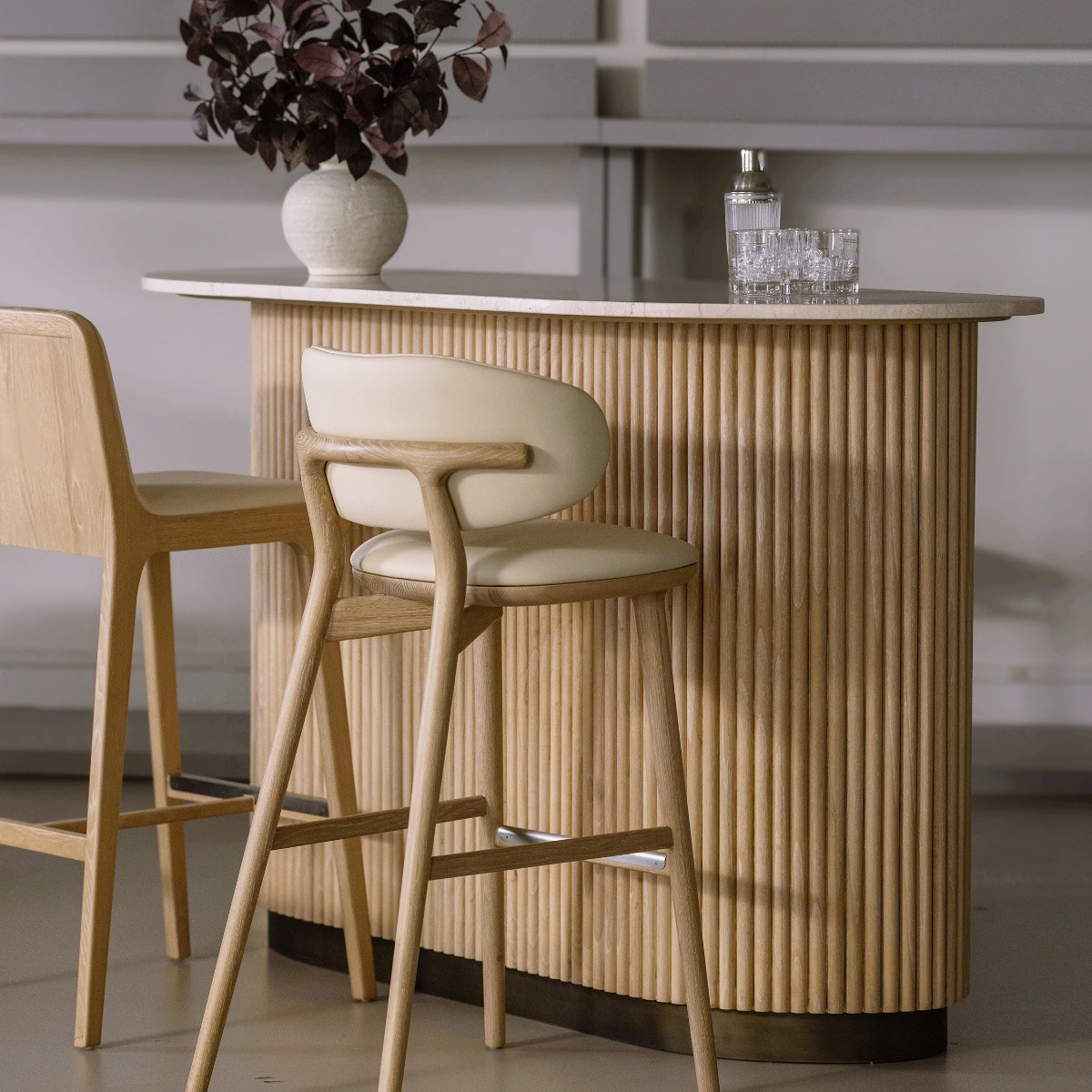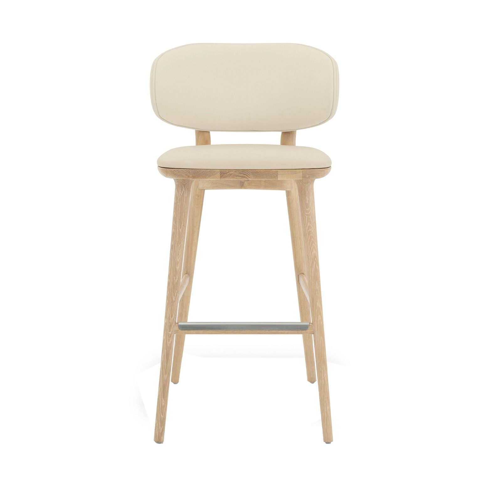 With an oak frame in a saddle finish, upholstery in acorn vegan leather and metal foot-rail in a brushed nickel, the Soren Bar Stool boasts versatile, sublime midcentury vibes that pair with any style.