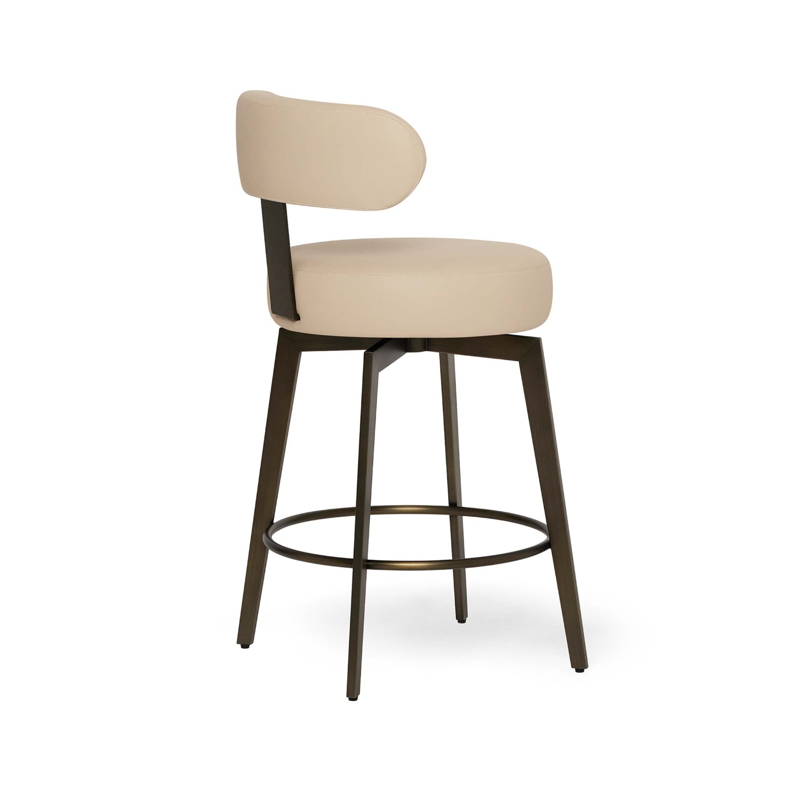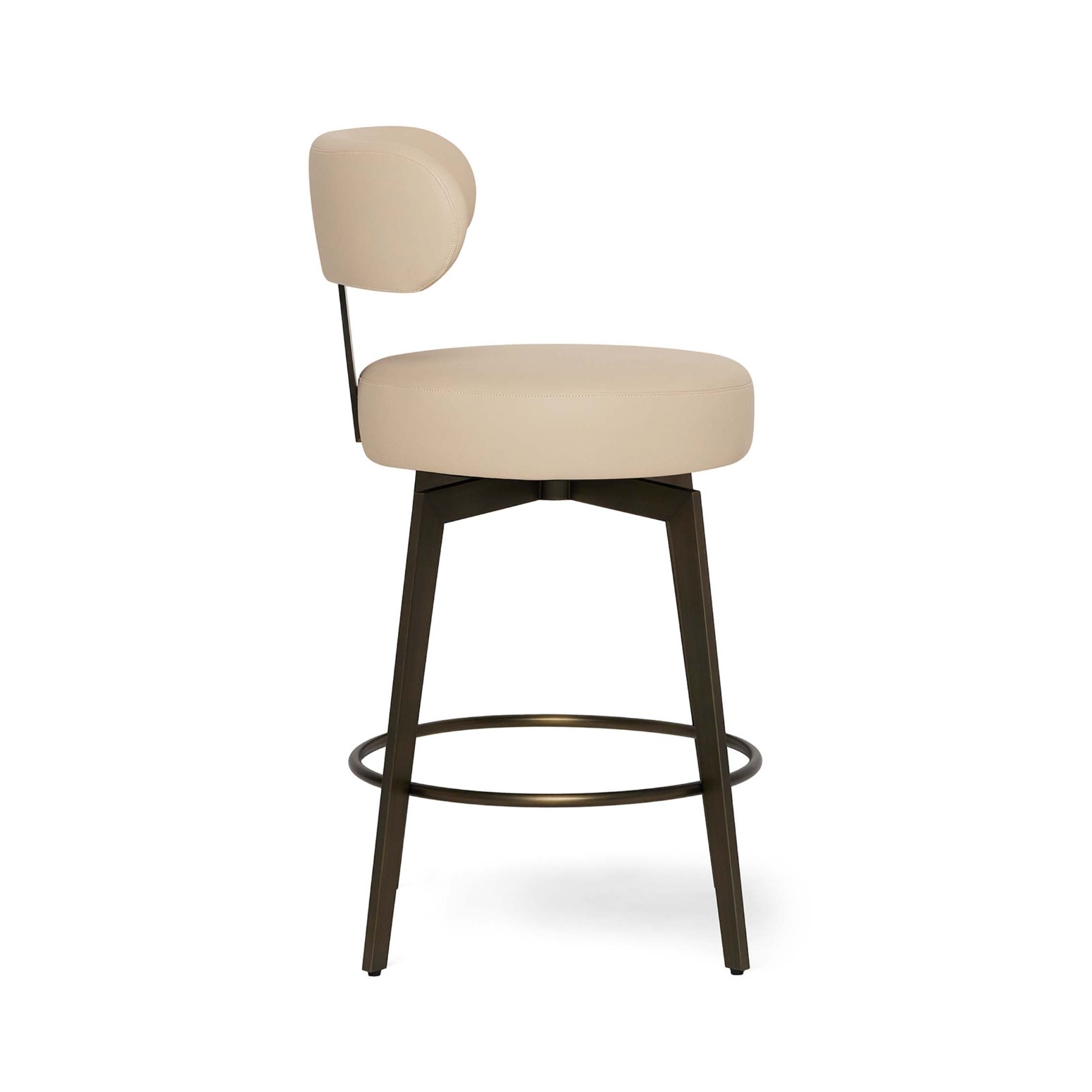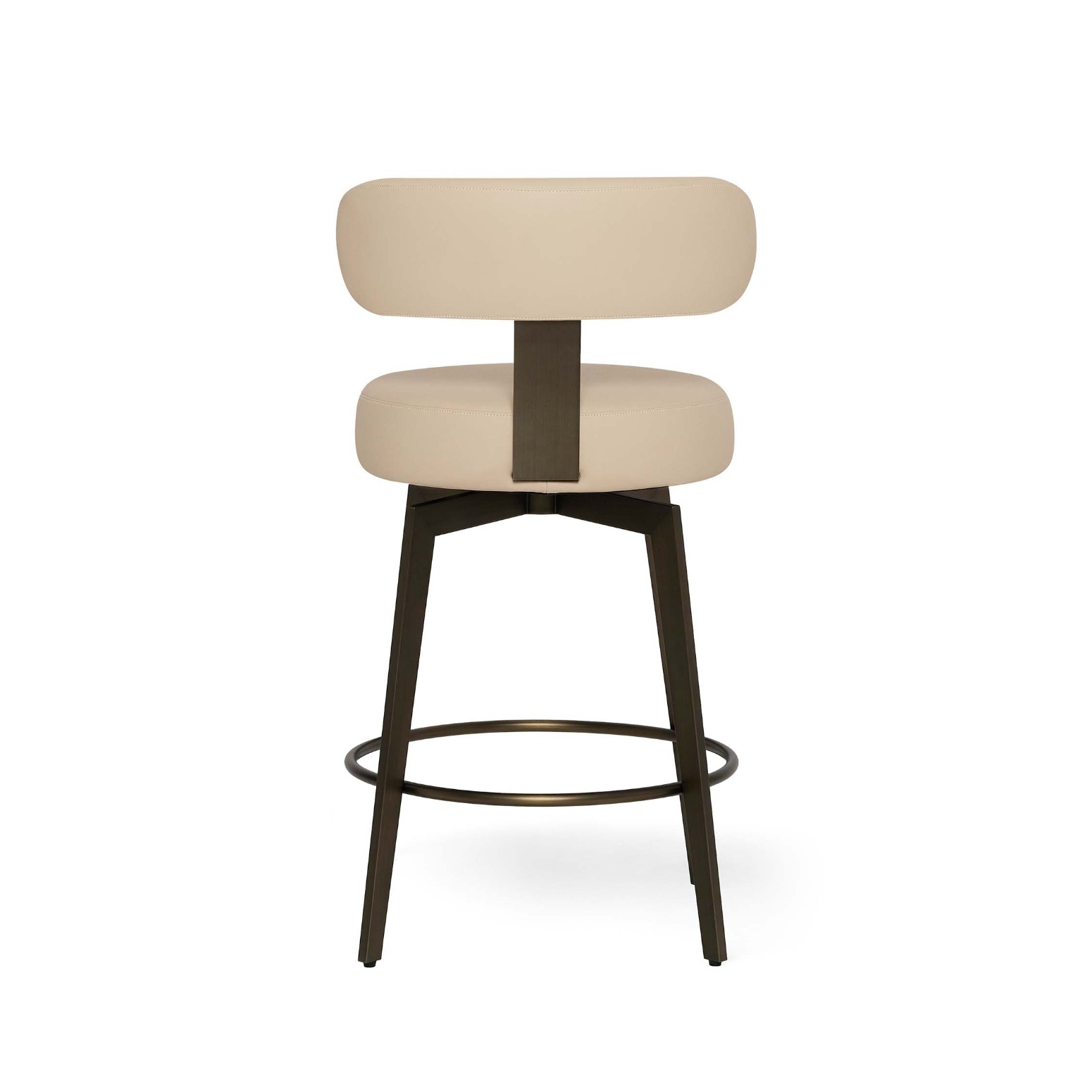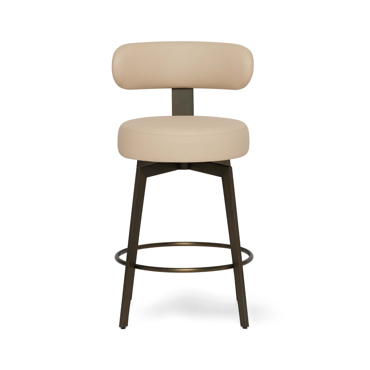 Boasting a stainless frame in antique bronze and cream latte vegan leather upholstery, the Clermont Counter Stool brings style to a classic swivel seating option.