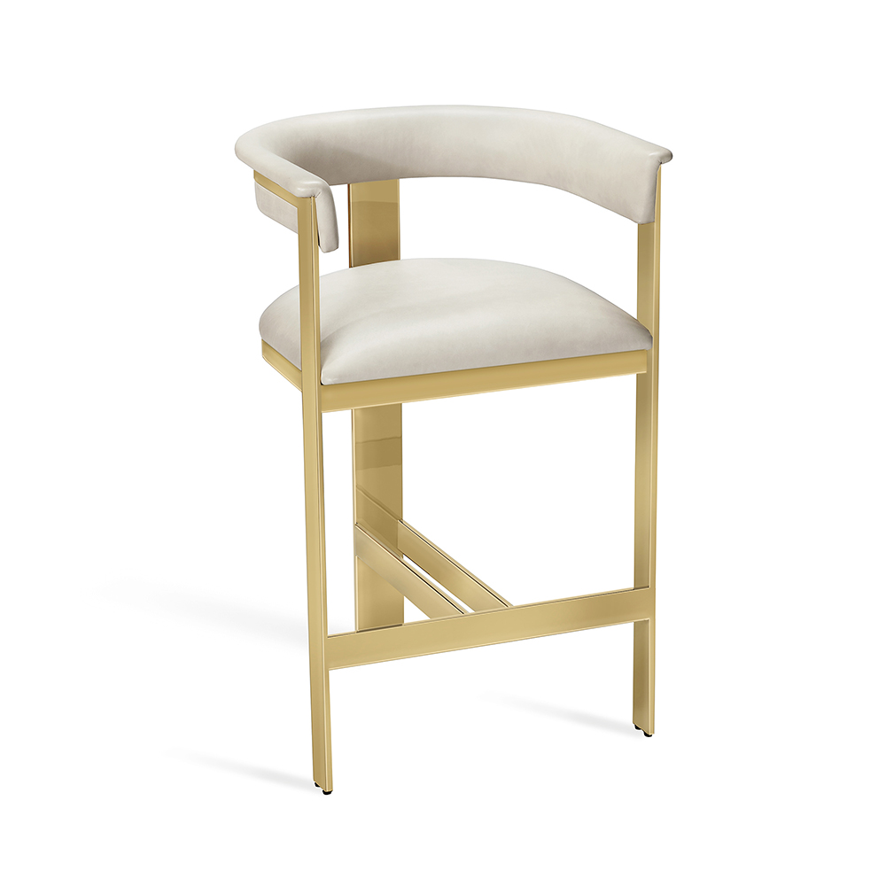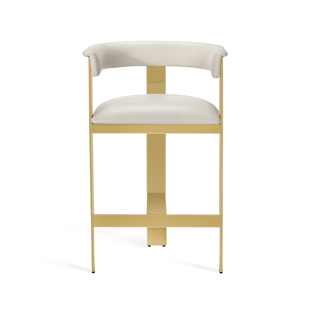 Boasting an art moderne influence, the Darcy Counter Stool features a cream leather seat and a streamlined stainless steel frame in a polished brass finish.