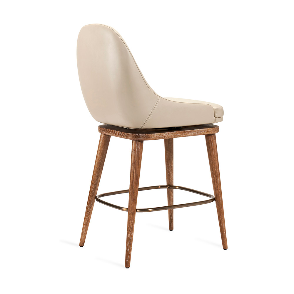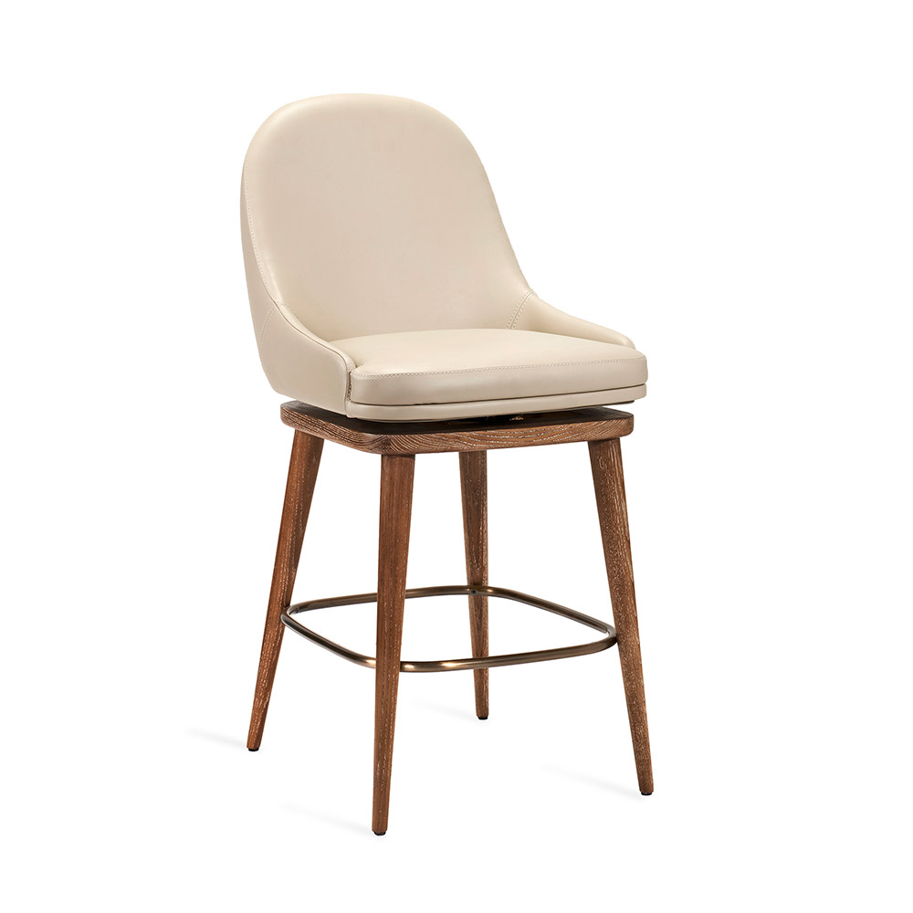At once sophisticated and playful, the Harper Swivel Counter Stool boasts an autumn brown wood frame and metal footrest in a satin brass finish paired with a cream latte vegan leather seat.