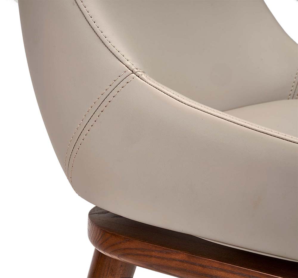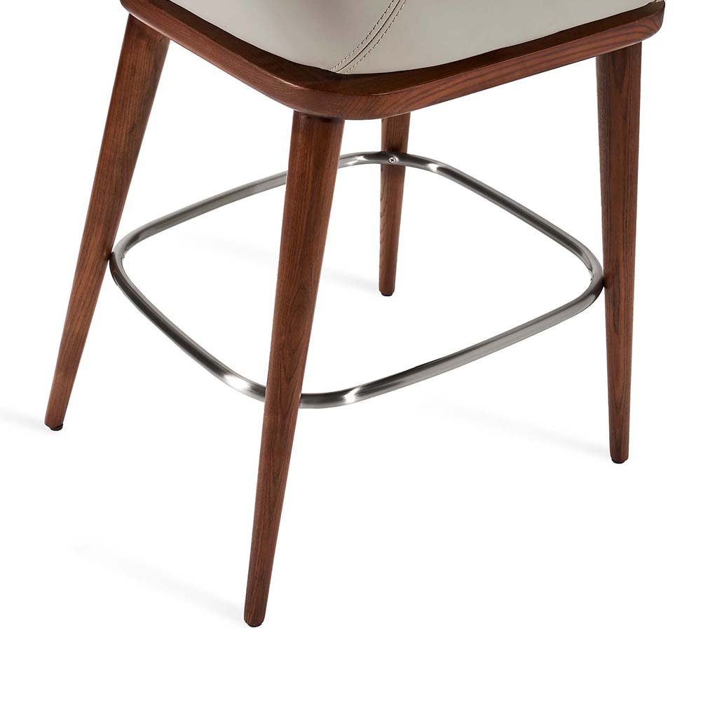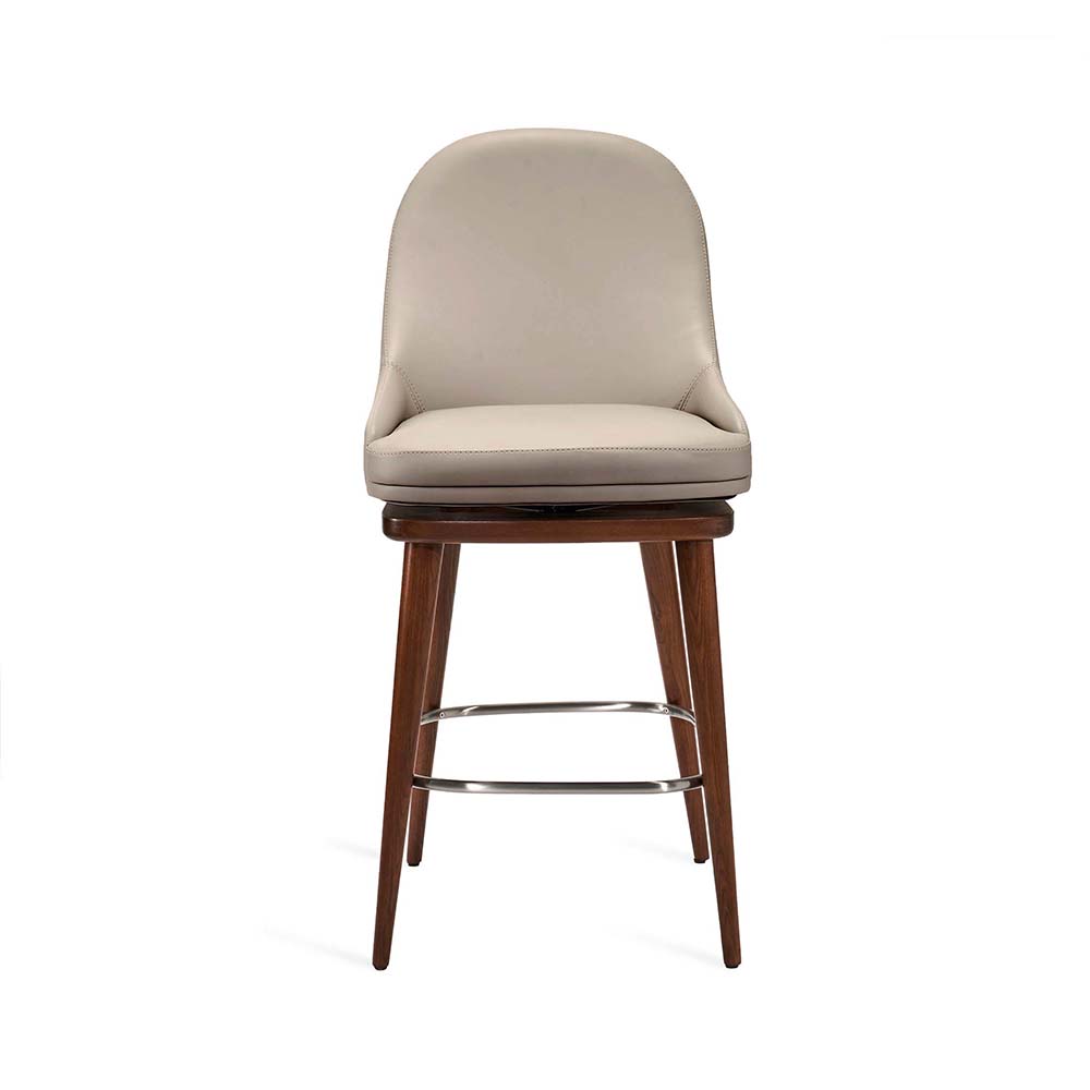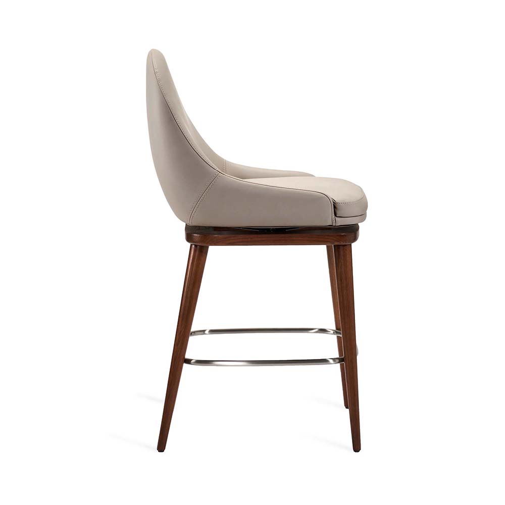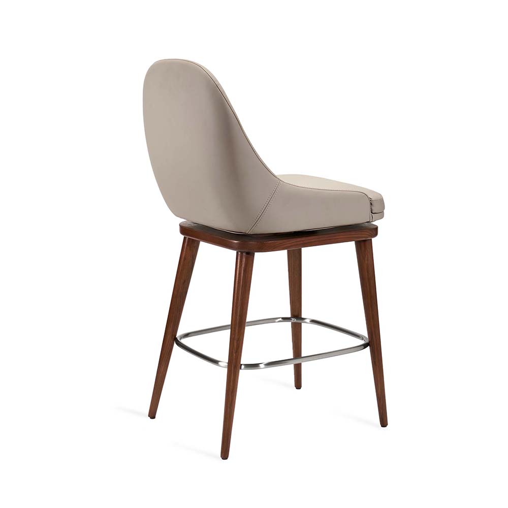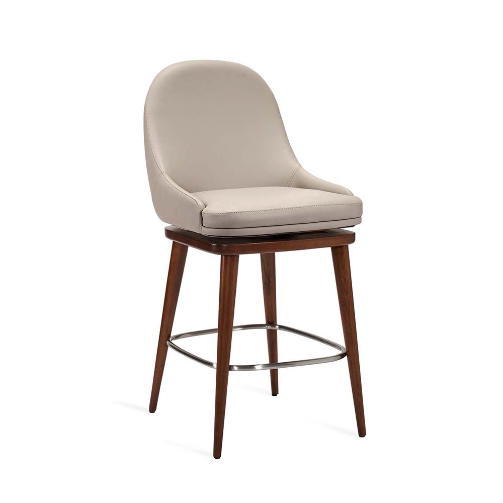 At once sophisticated and playful, the Harper Swivel Counter Stool boasts walnut-stained wood frame and metal footrest in a satin nickel finish paired with a St Tropez grey vegan leather seat.