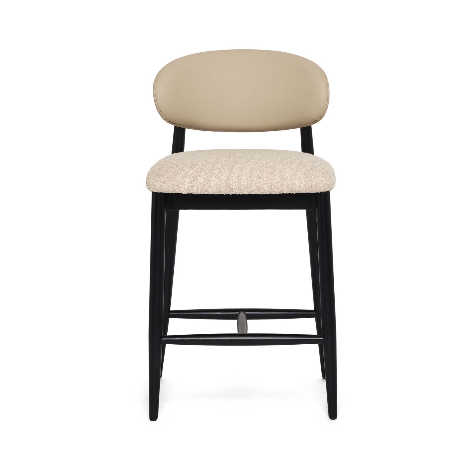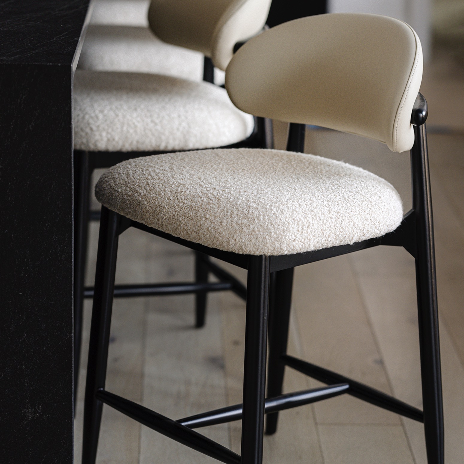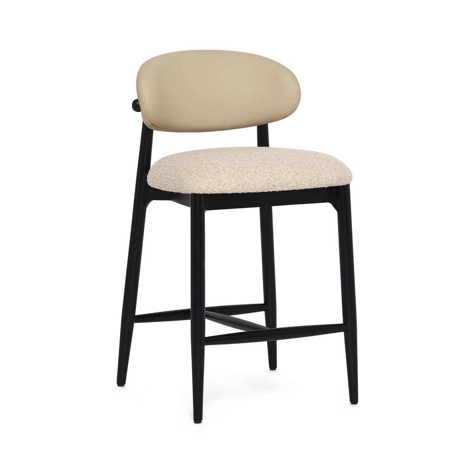 Giving Danish modern vibes, the ash Liam Counter Stool boasts the moody pairing of a matte black finish, vegan leather and baja seed upholstery in cream latte.