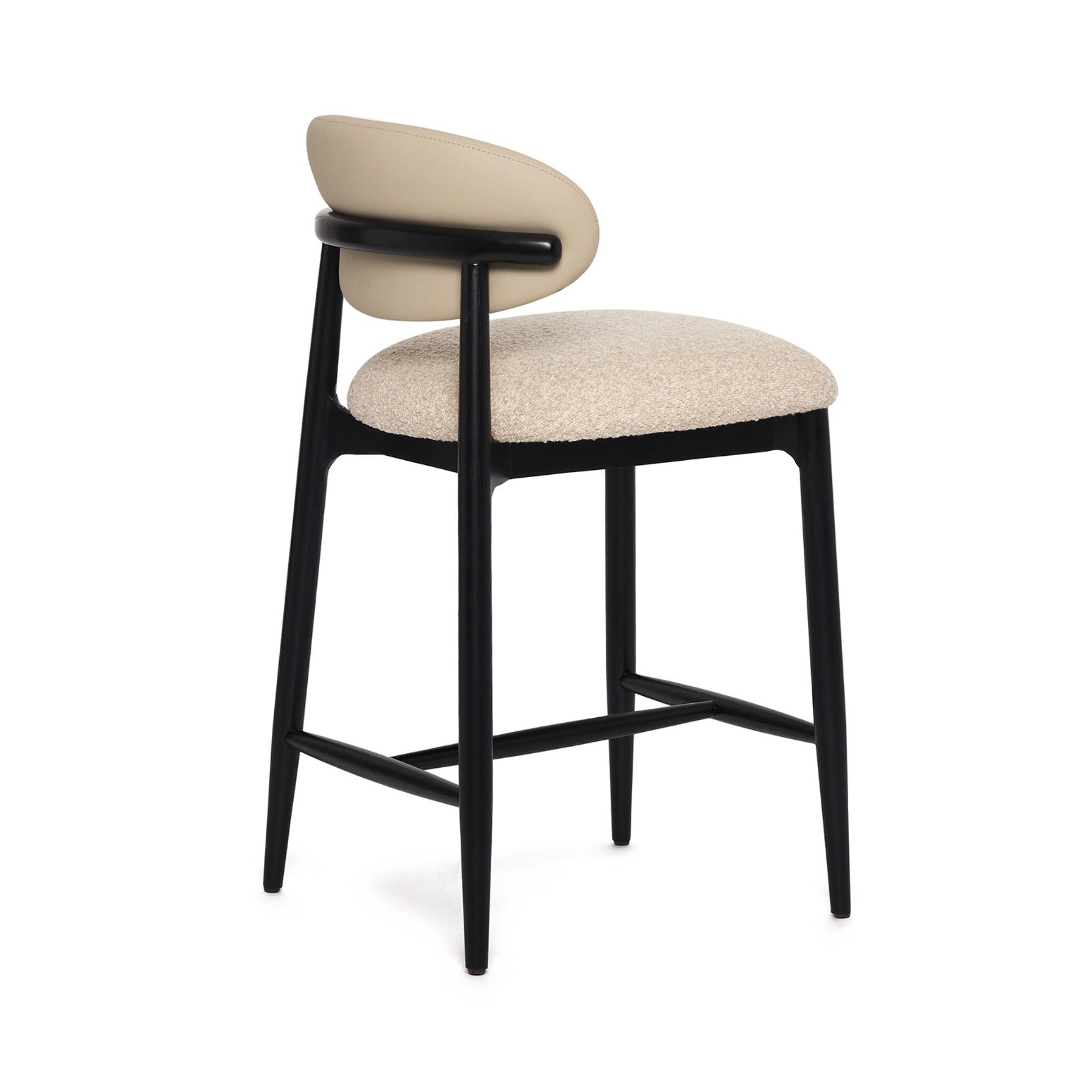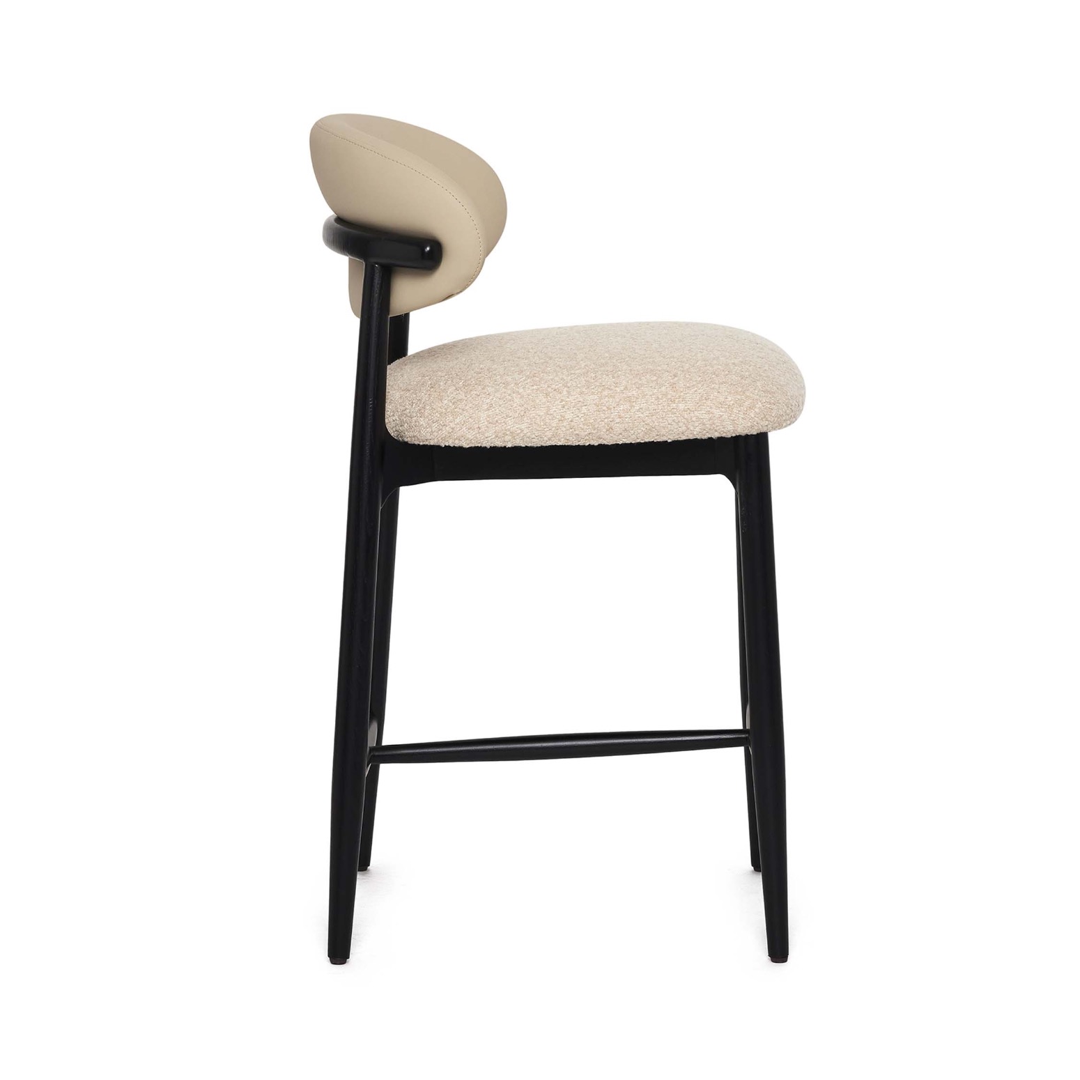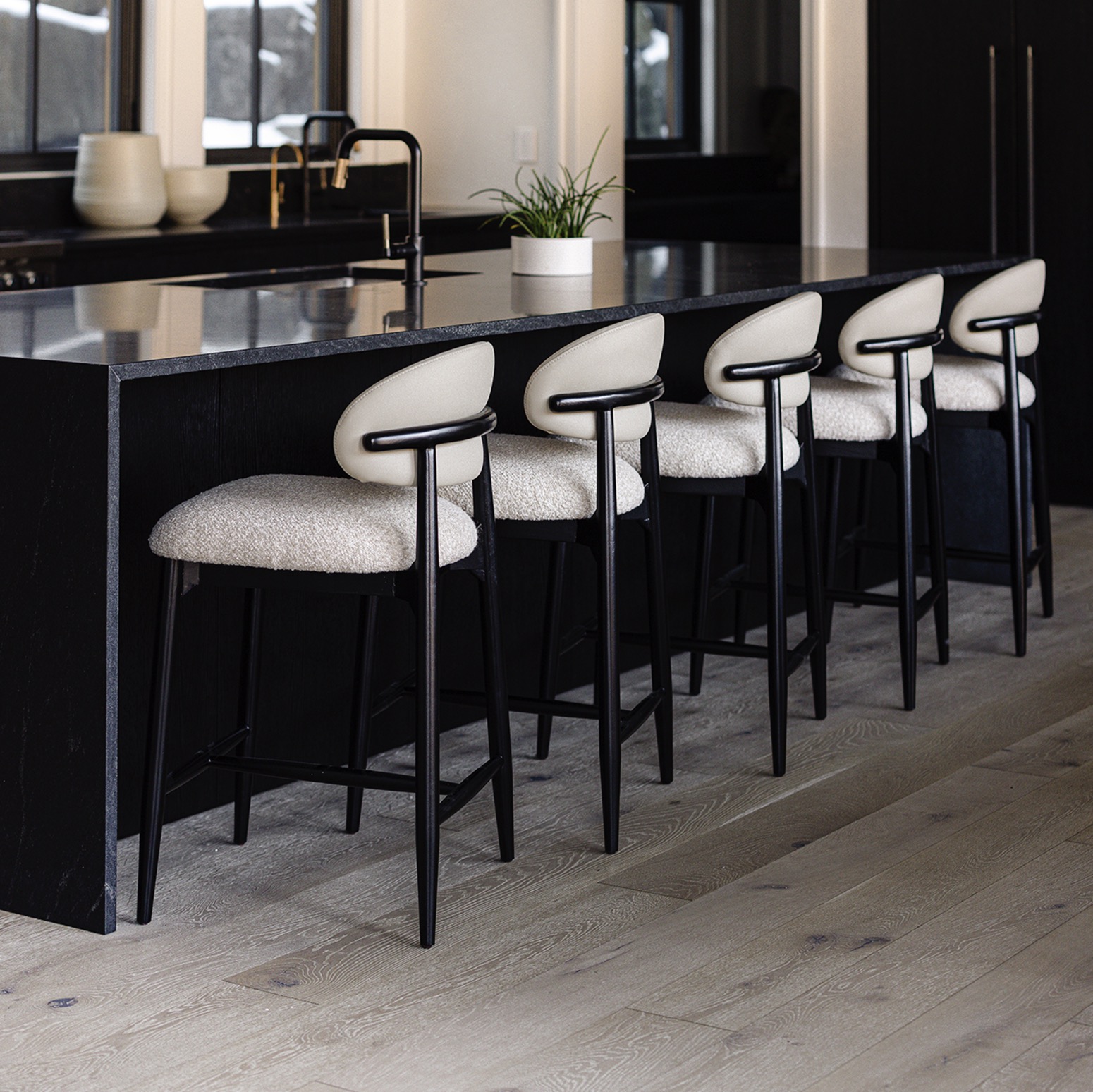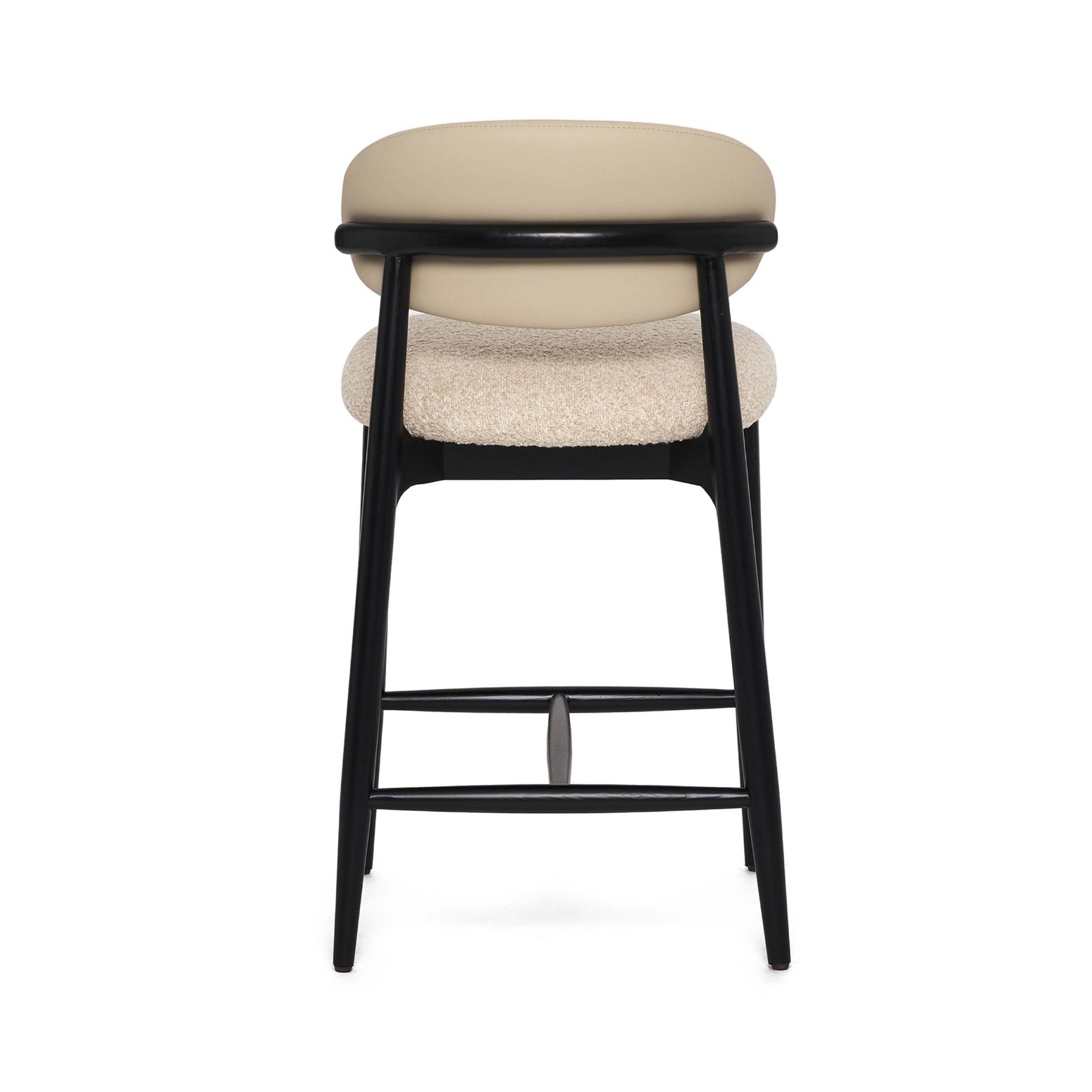 Giving Danish modern vibes, the ash Liam Counter Stool boasts the moody pairing of a matte black finish, vegan leather and baja seed upholstery in cream latte.