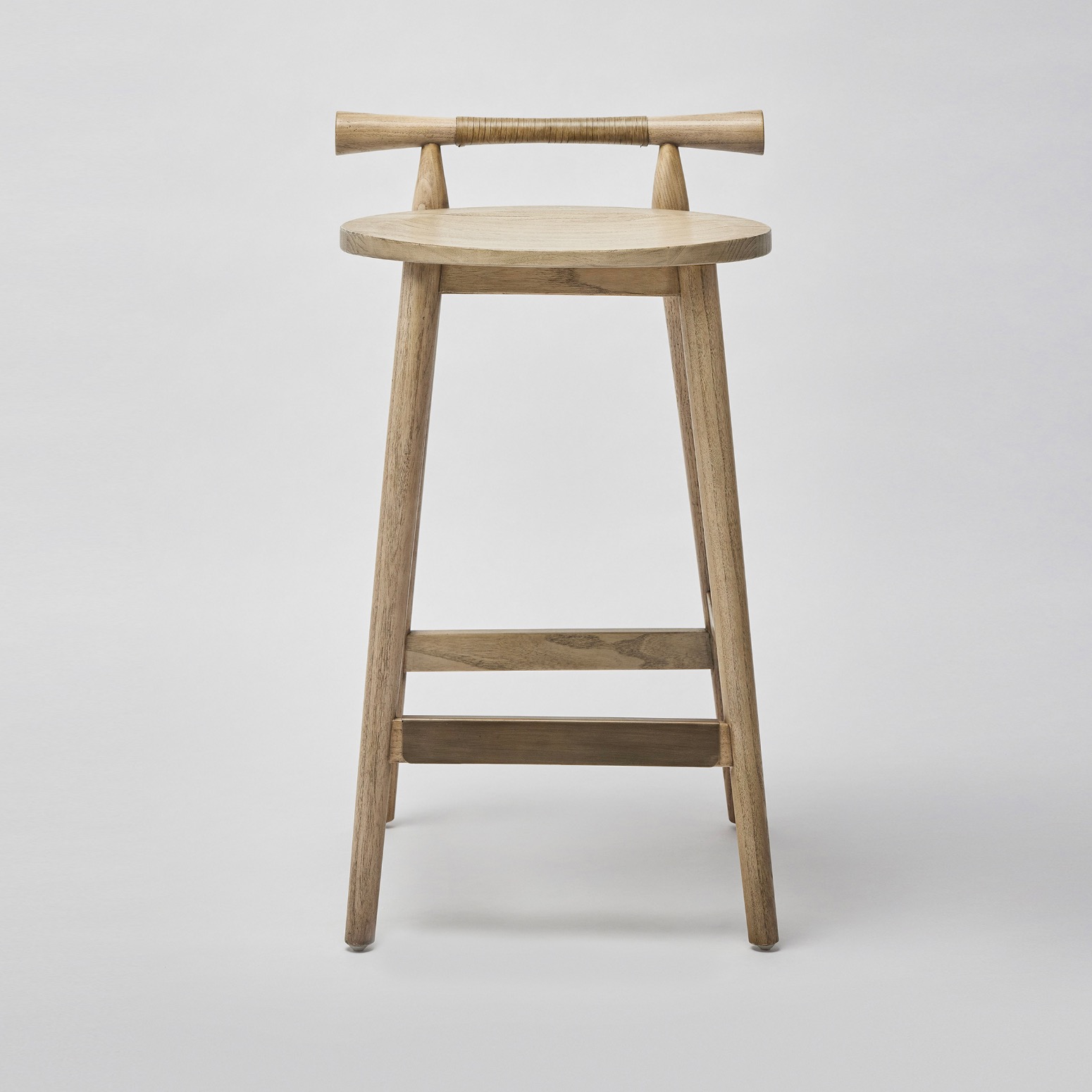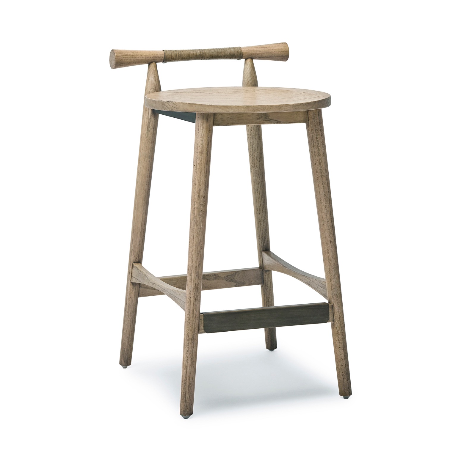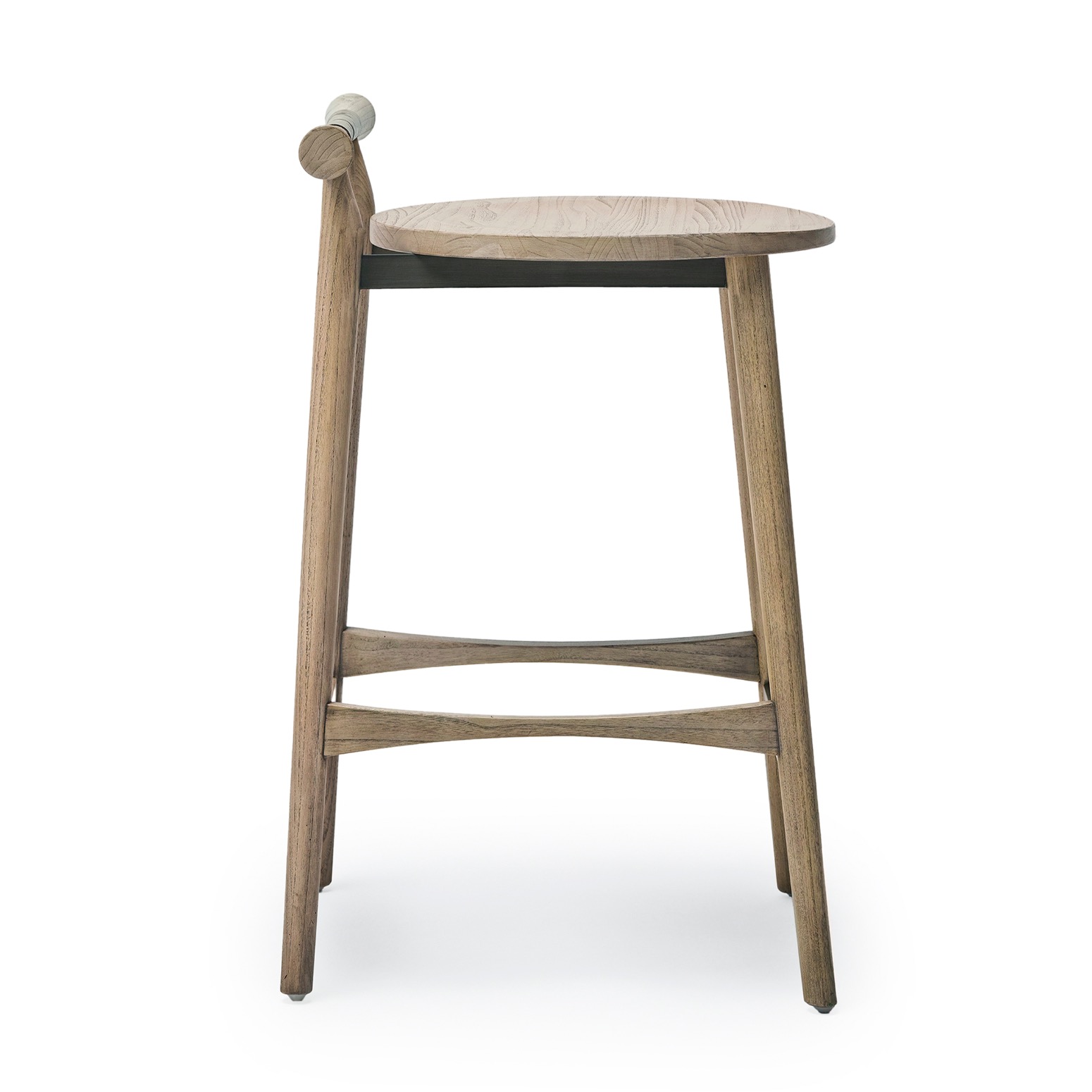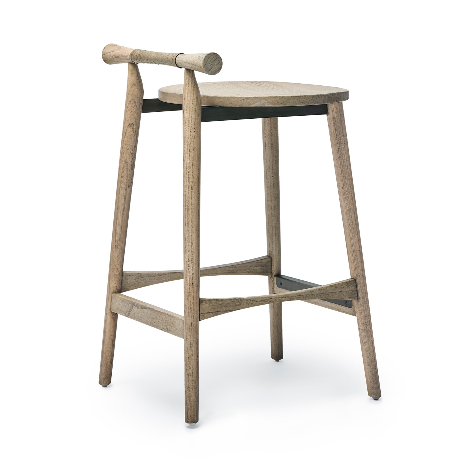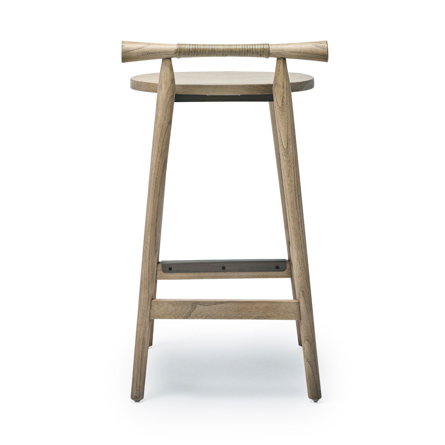 An evocative silhouette, realized in washed taupe wood with leather detailing, gives the Madeira Counter stool a stunning global vibe.