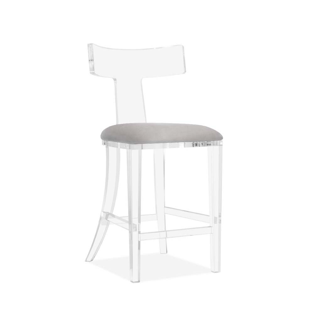 Pairing on-trend acrylic with a grey velvet seat, the Tristan Klismos Counter Stool delivers a fabulous take on a classic silhouette.