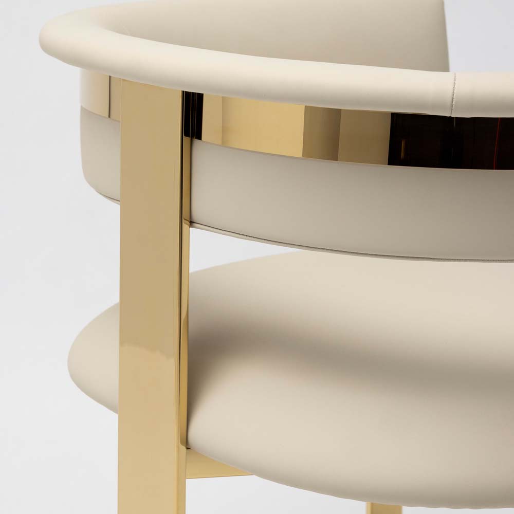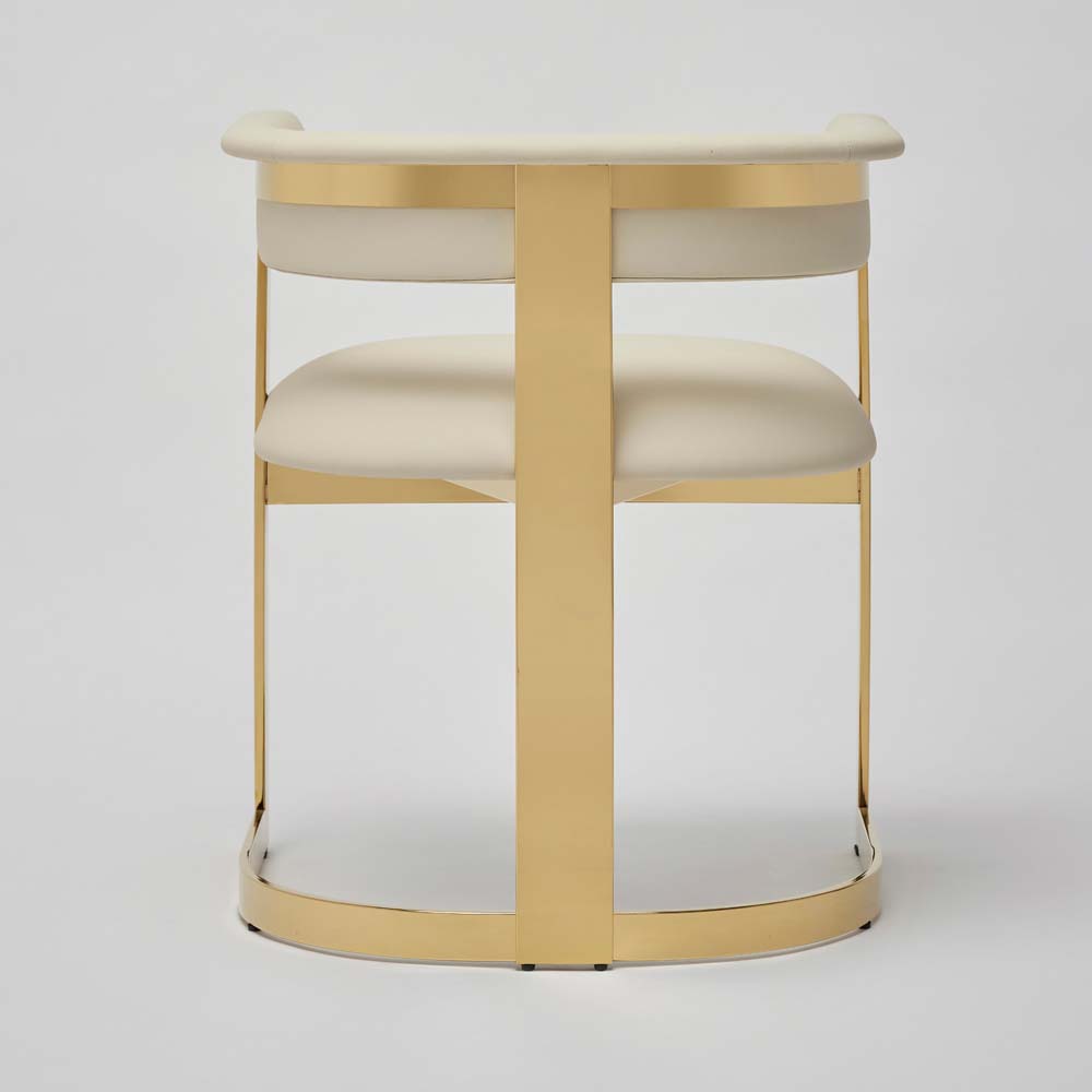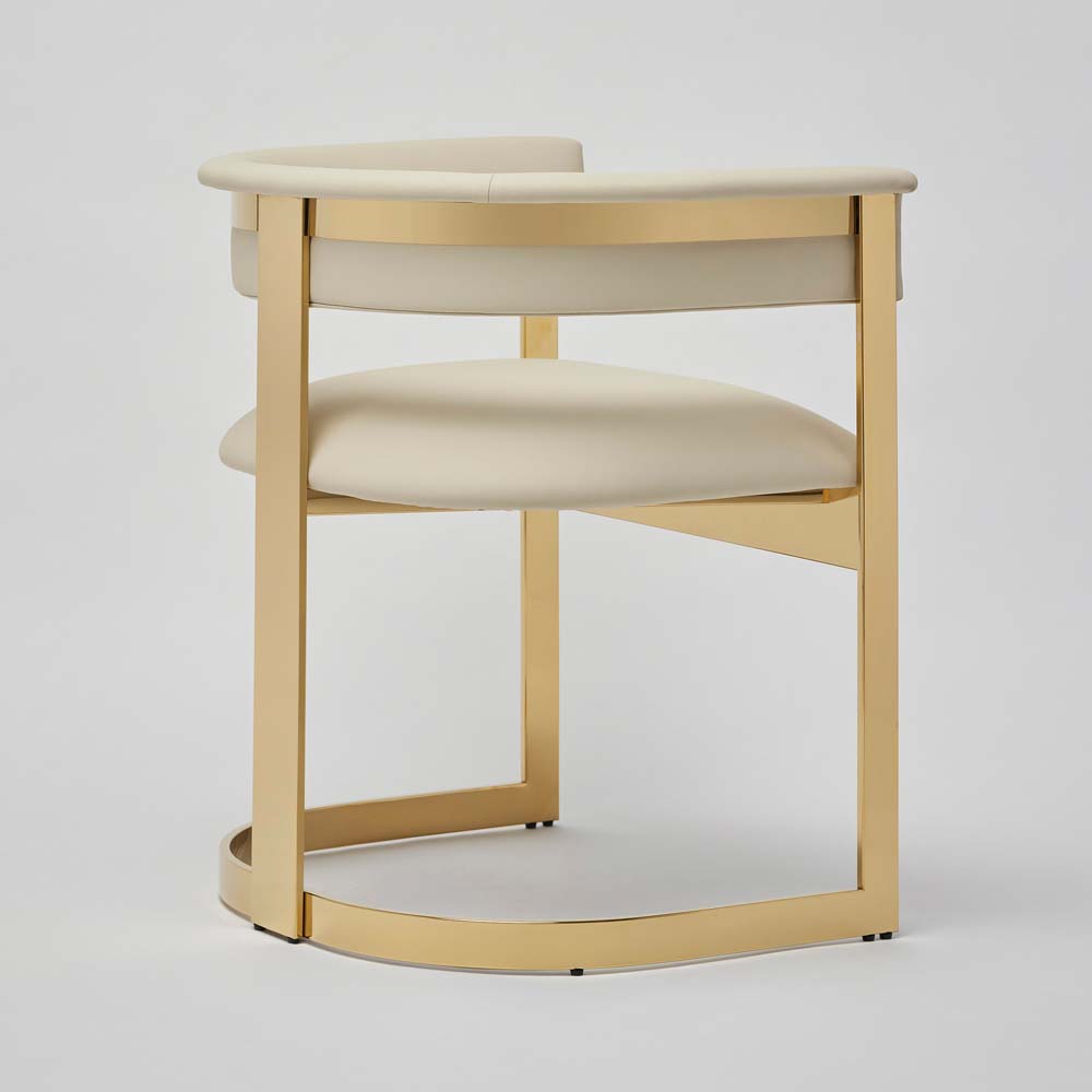 Introducing a fresh take on our beloved Darcy line, the Darcy II Dining Chair features a solid curved base complemented by a streamlined polished brass frame and buff cream leather upholstery.