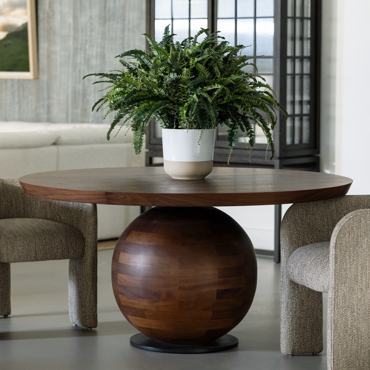 A sculptural base in stainless steel finished in deep bronze supports a rich walnut top to make the Carter Dining Table a stunning statement.