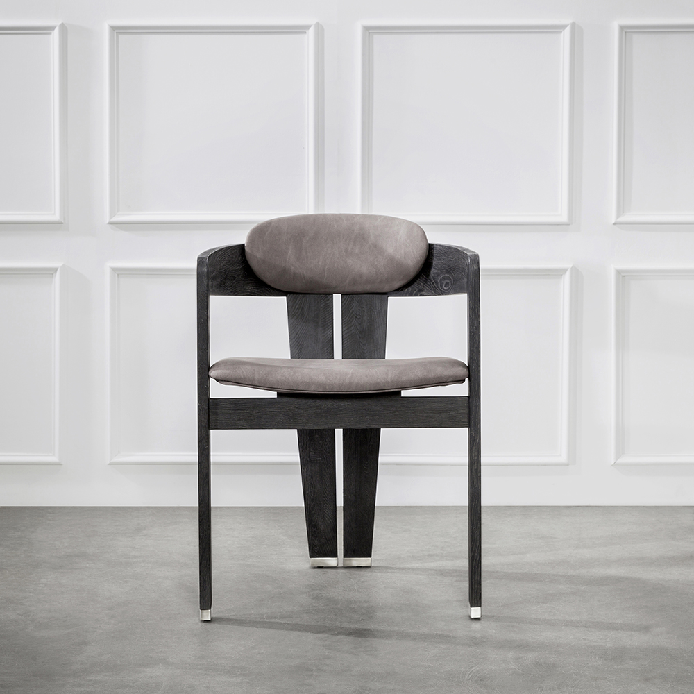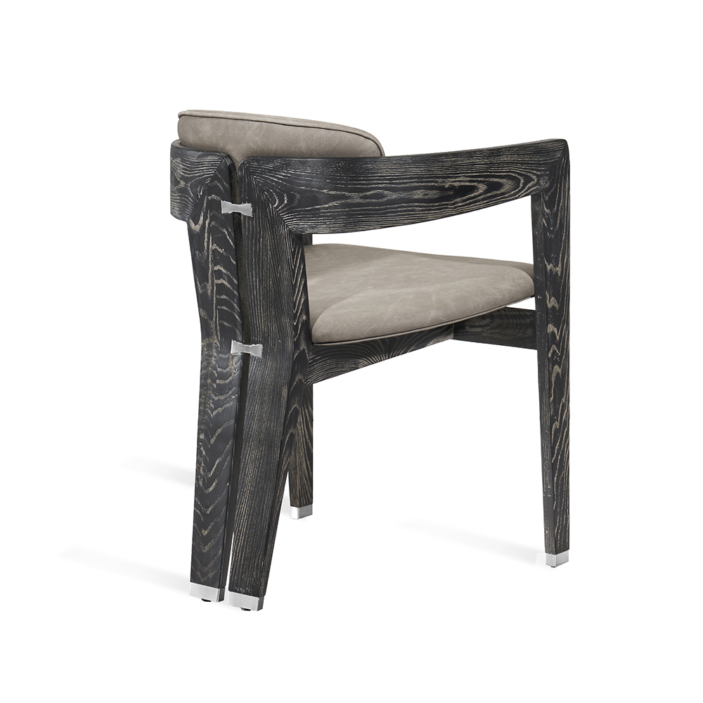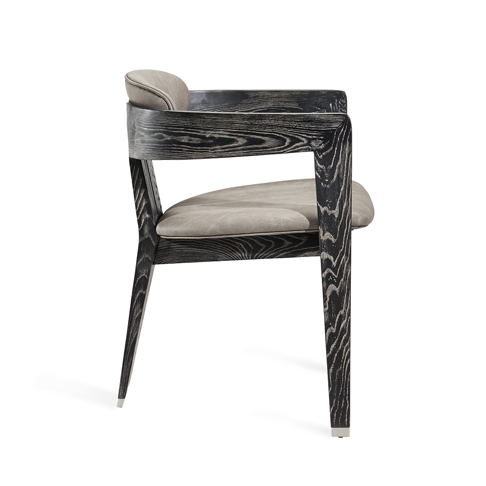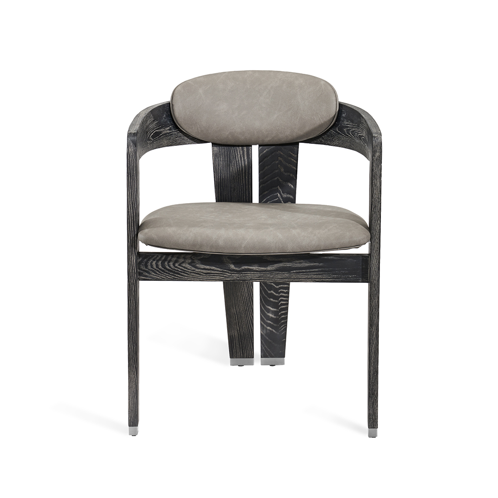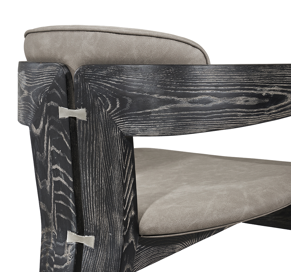 A distressed charcoal vegan leather seat perfectly complements the charcoal ceruse-finished wood frame of the eye-catching Maryl Dining Chair.