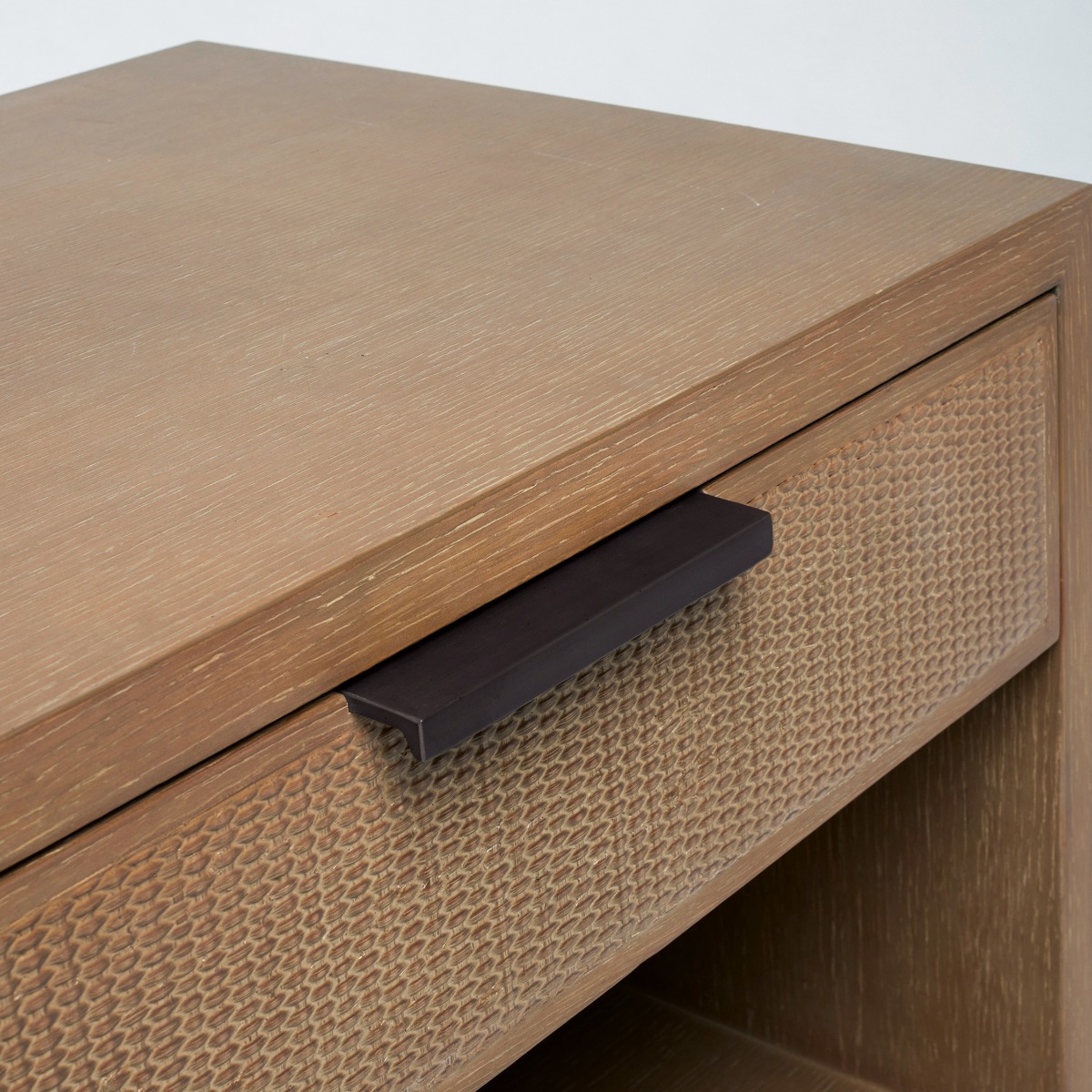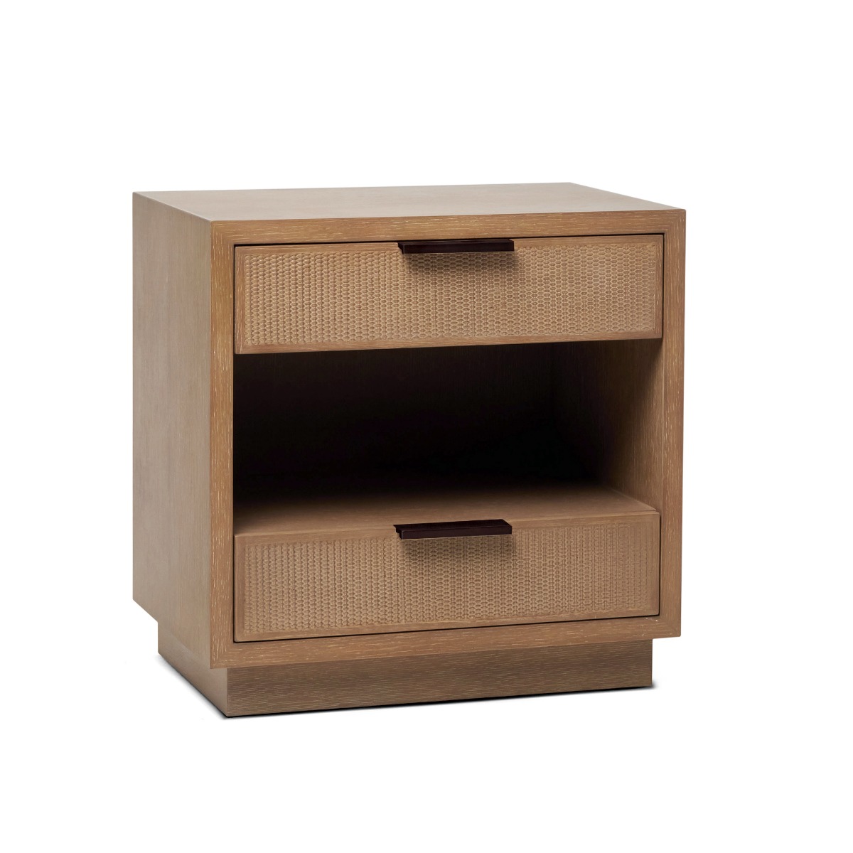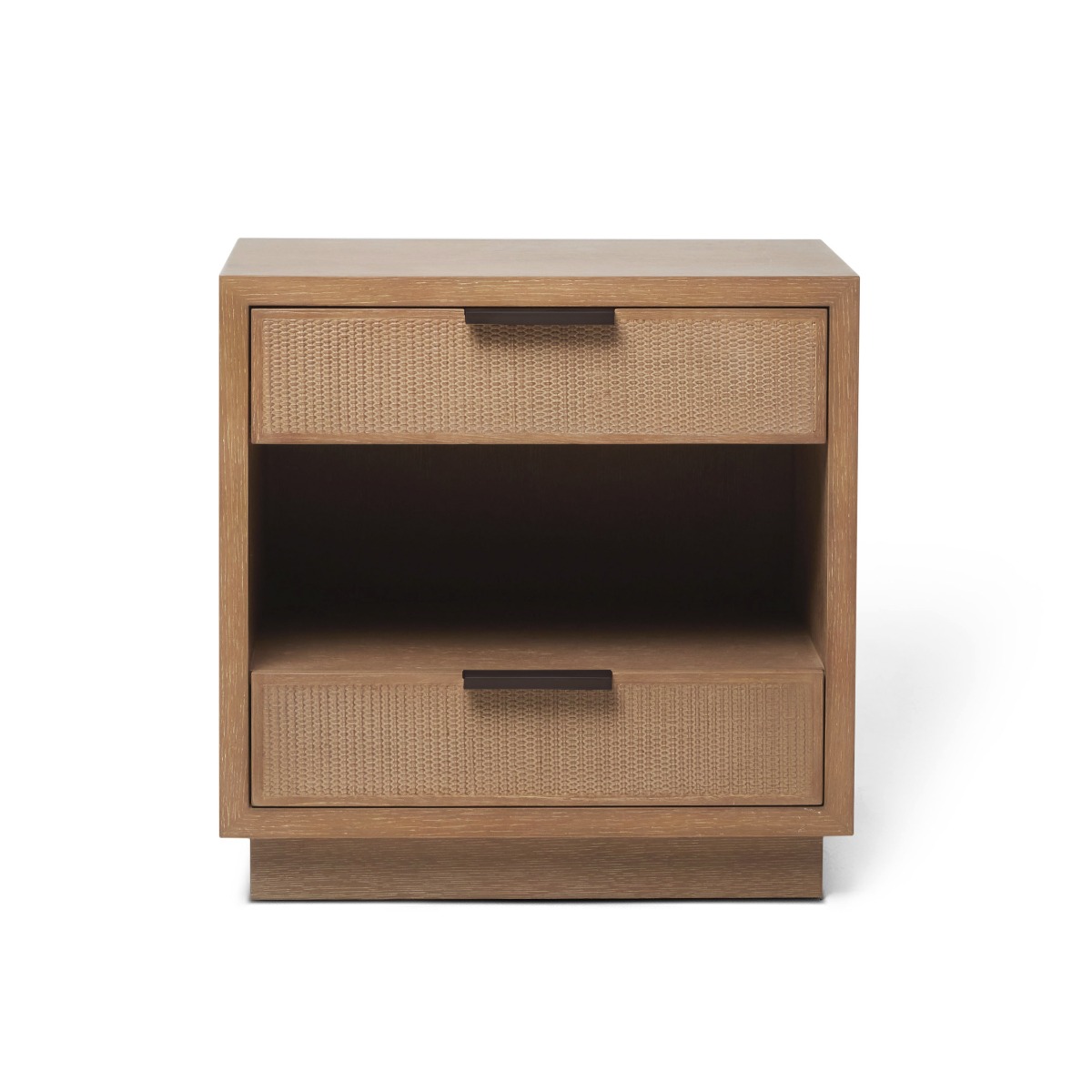 Crafted of oak in a harvest finish and featuring rattan drawer fronts, the Holmes Bedside Chest delivers organic texture and natural flair.