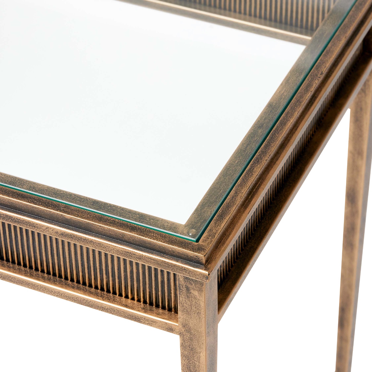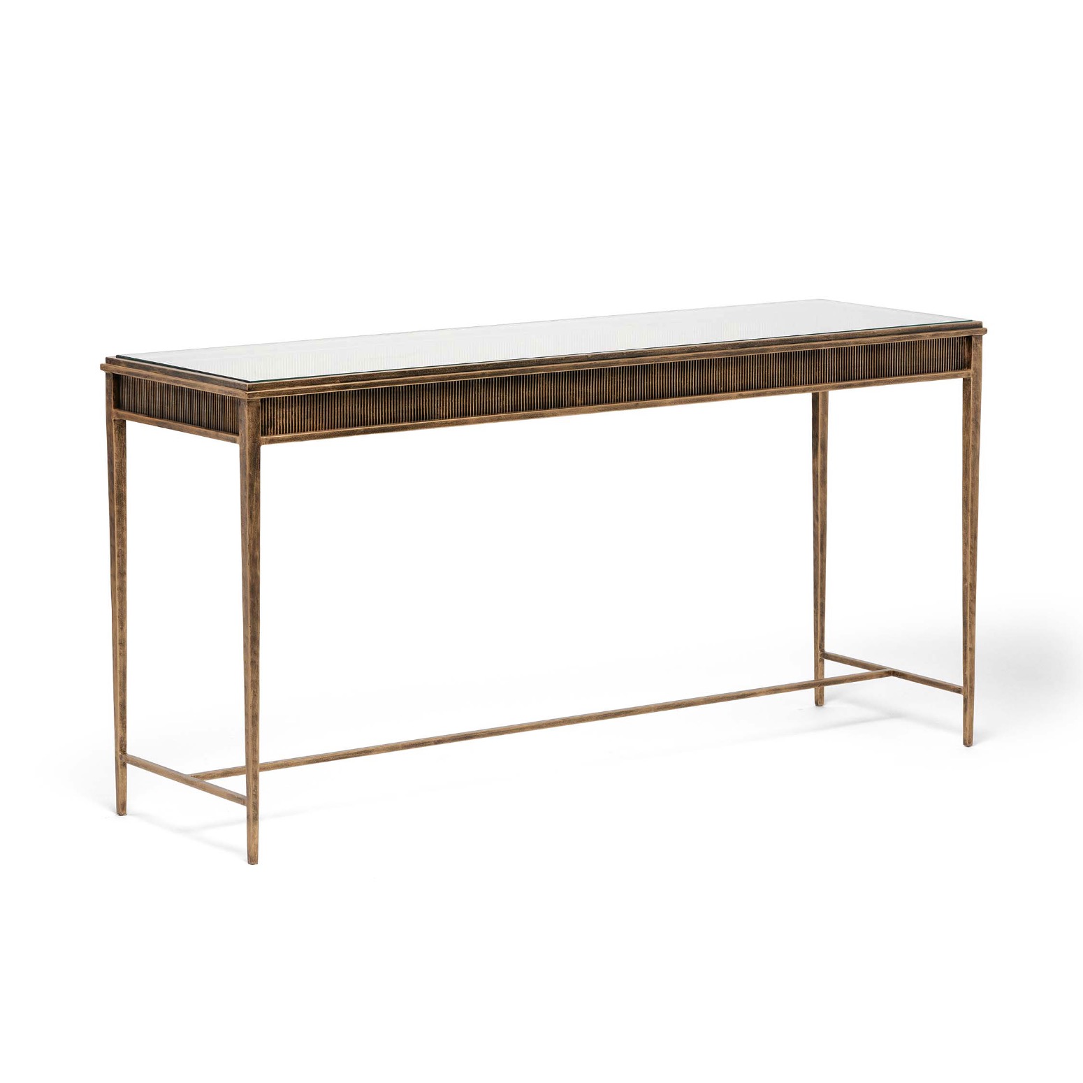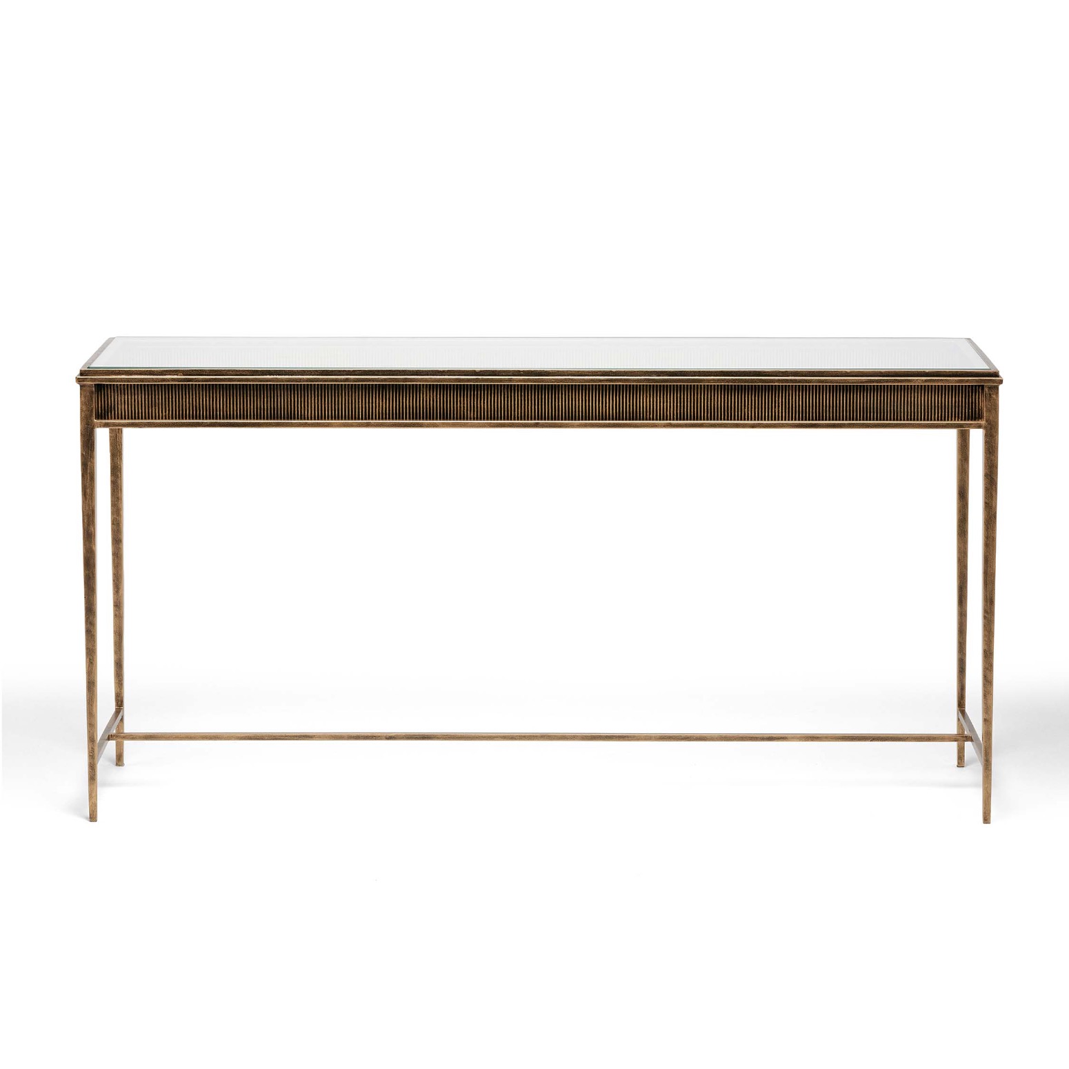 Clear glass tops the iron Camille Console Table in a gilded brass finish and lets the classically elegant base steal the show.