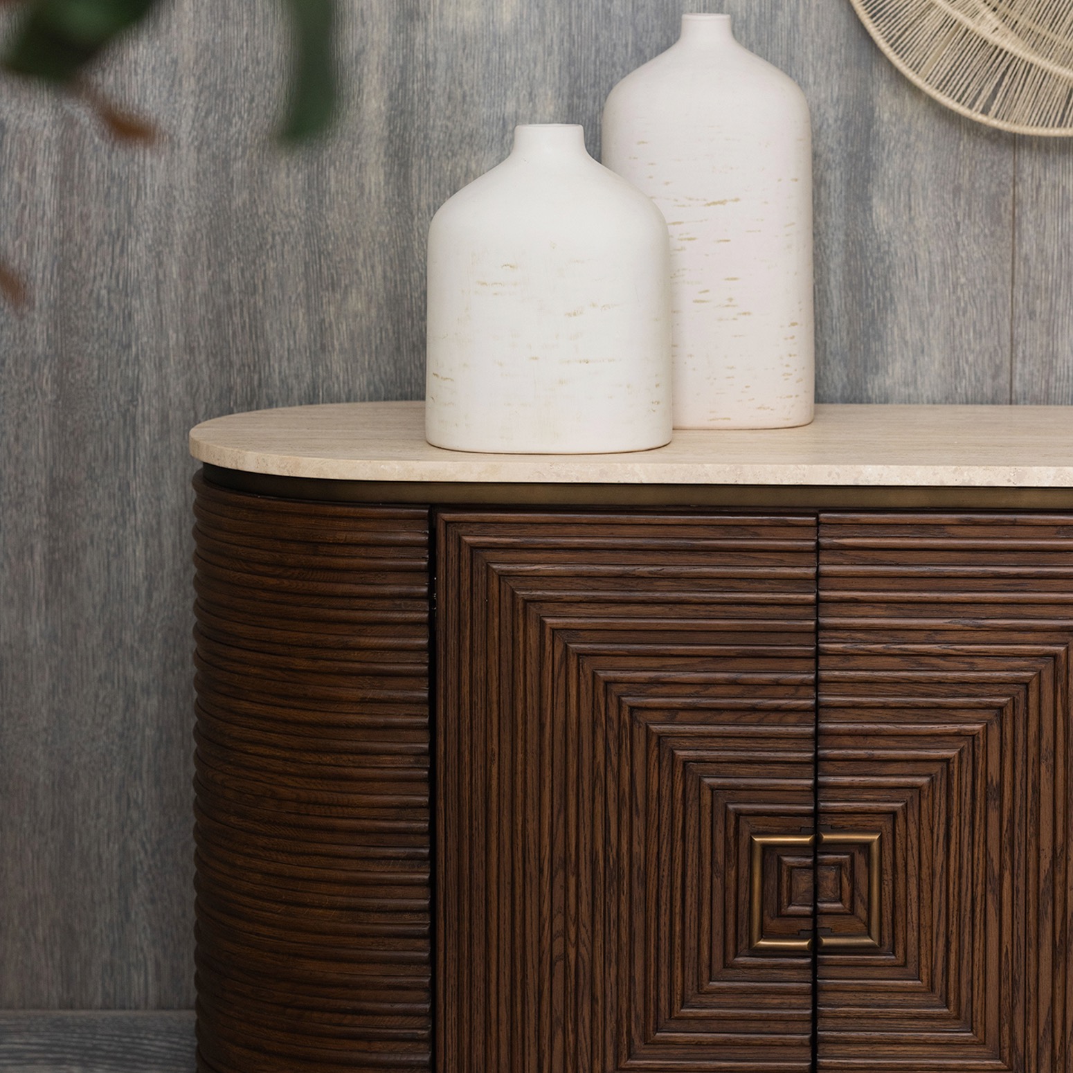 Crafted of oak in a classic walnut finish and topped with raw travertine, the art deco-influenced Marina Credenza is a true stunner.