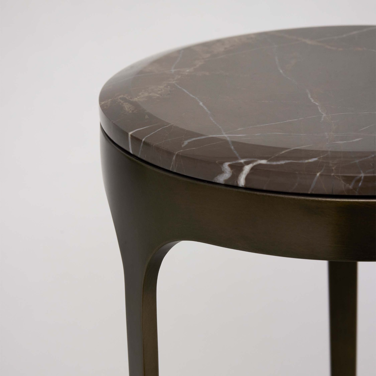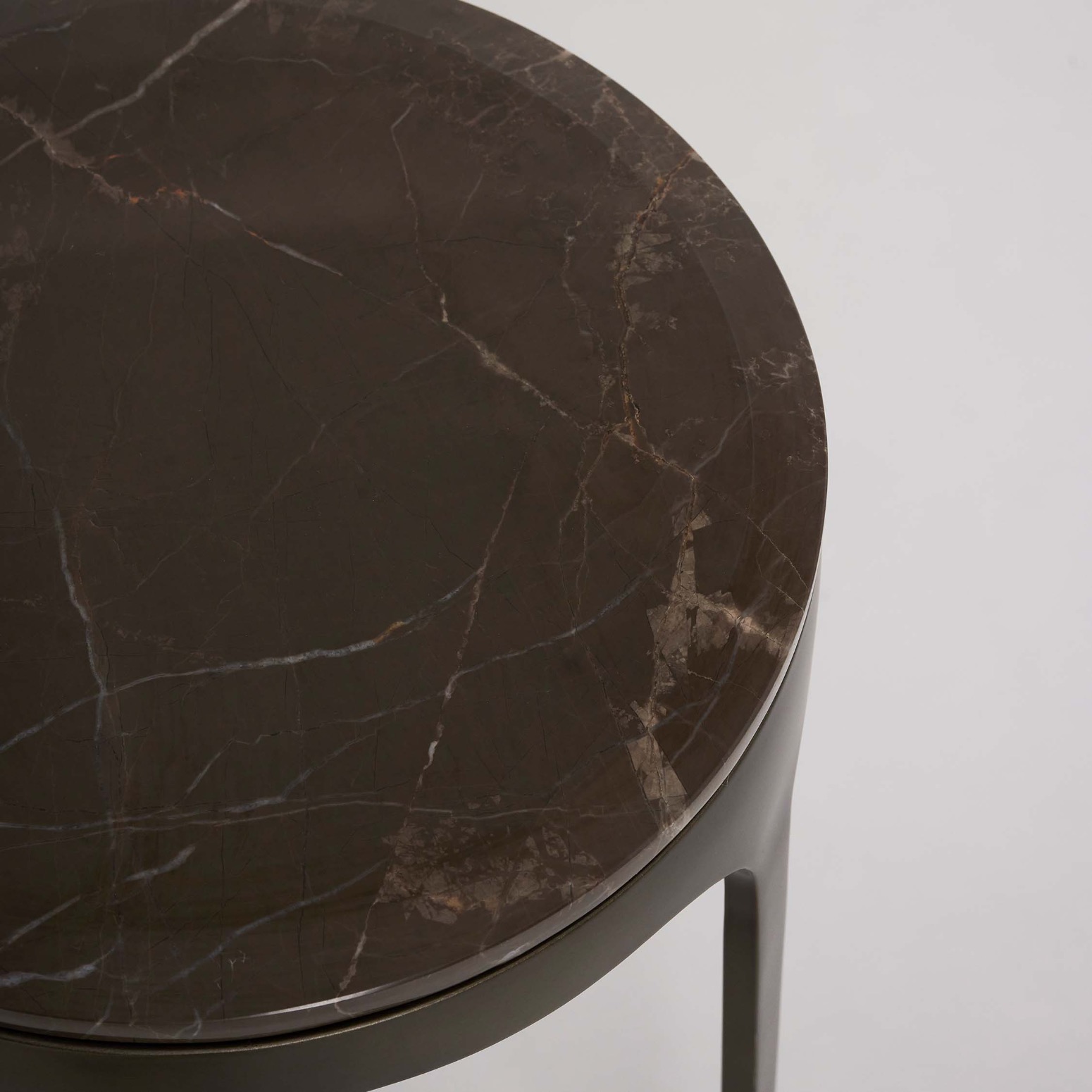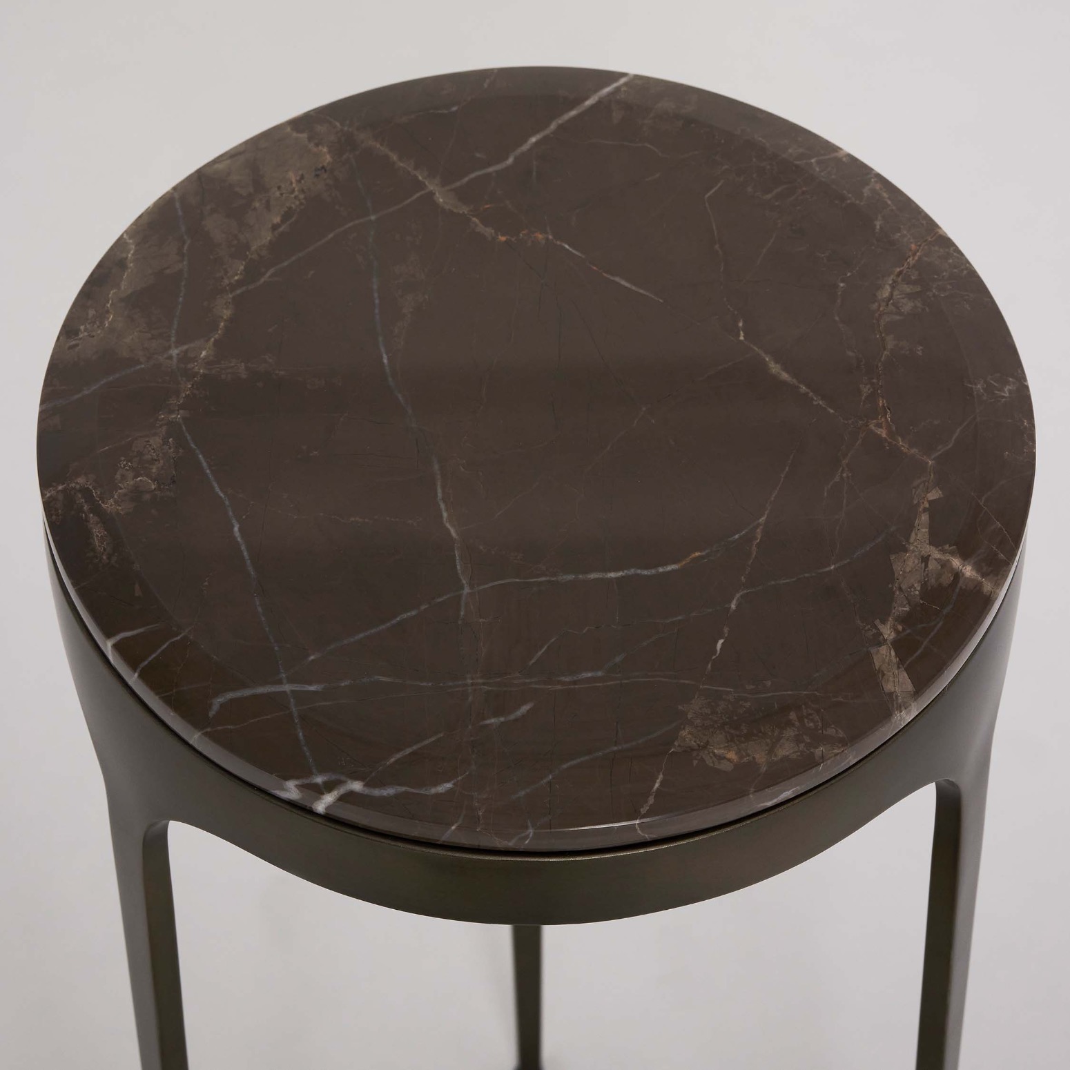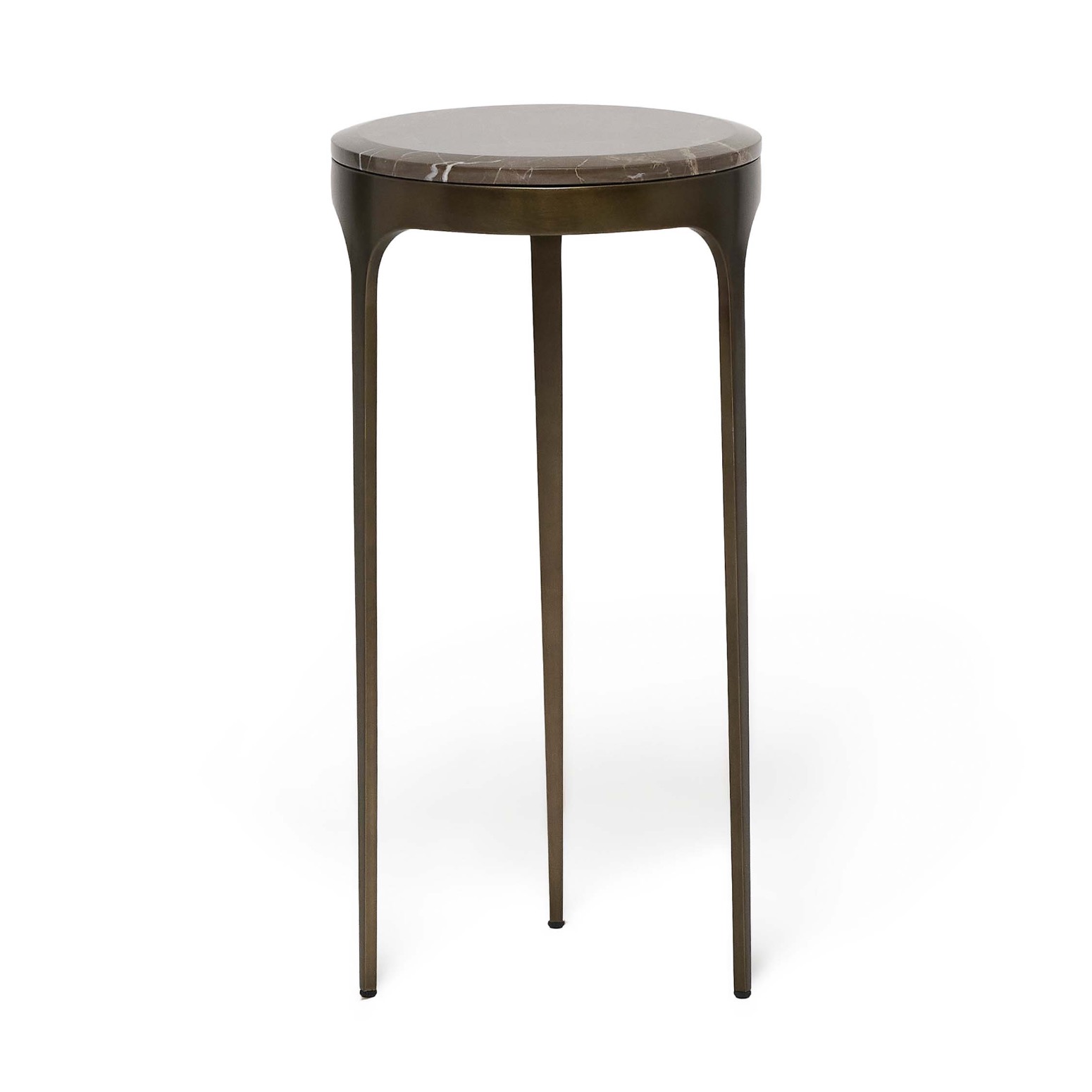 Making for a sophisticated accent, the Camilla Drink Table features a stainless steel base in an antique bronze finish and a terra brown marble top.