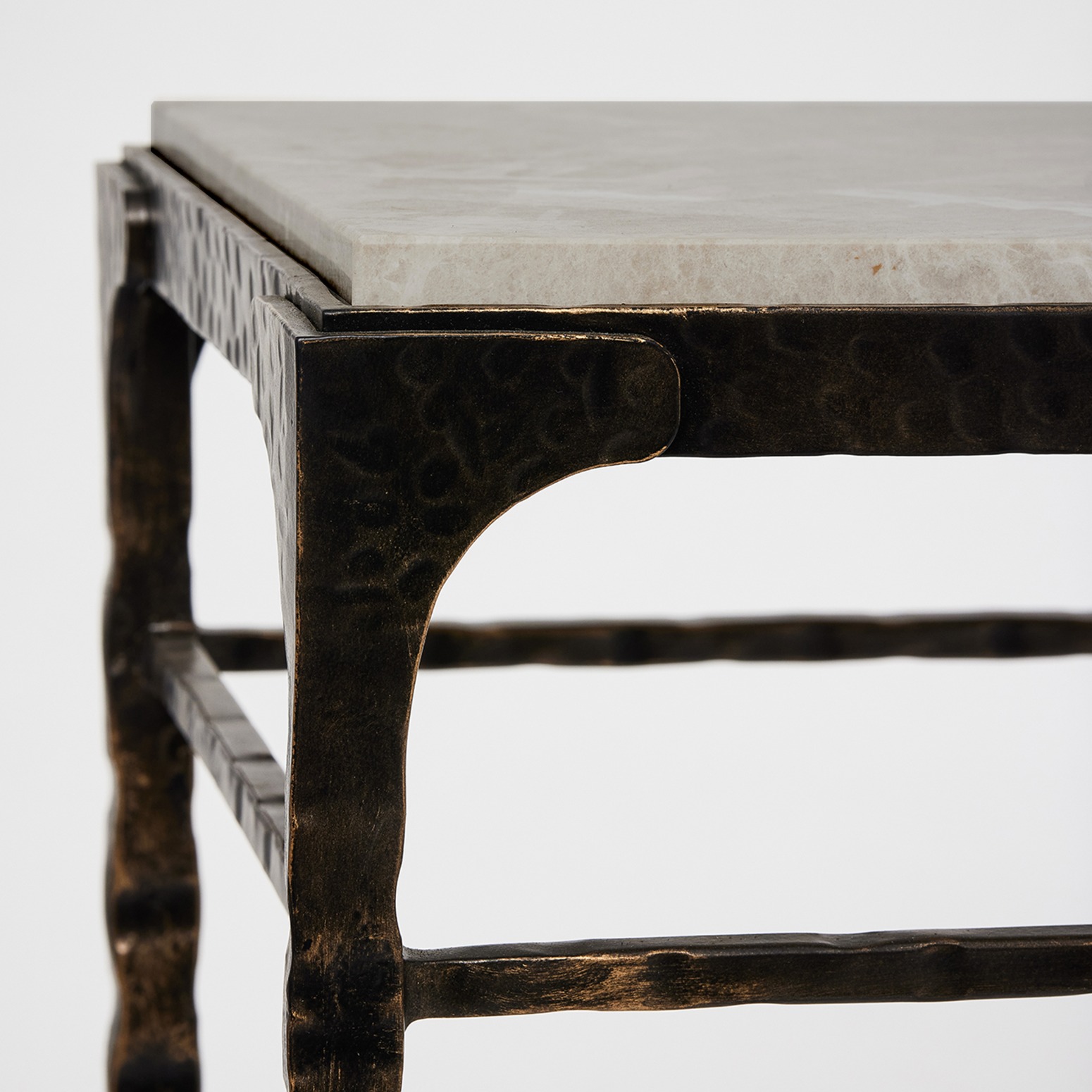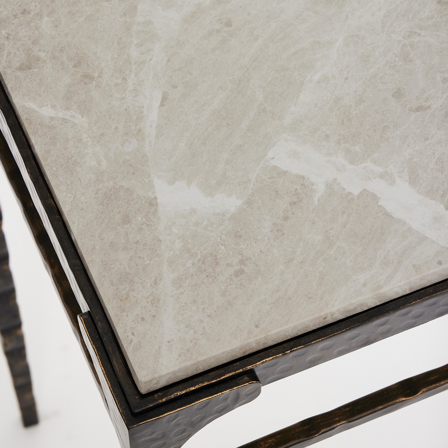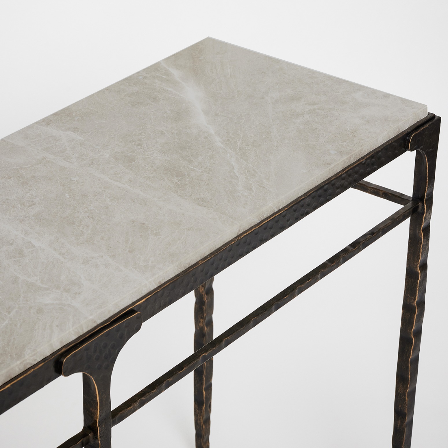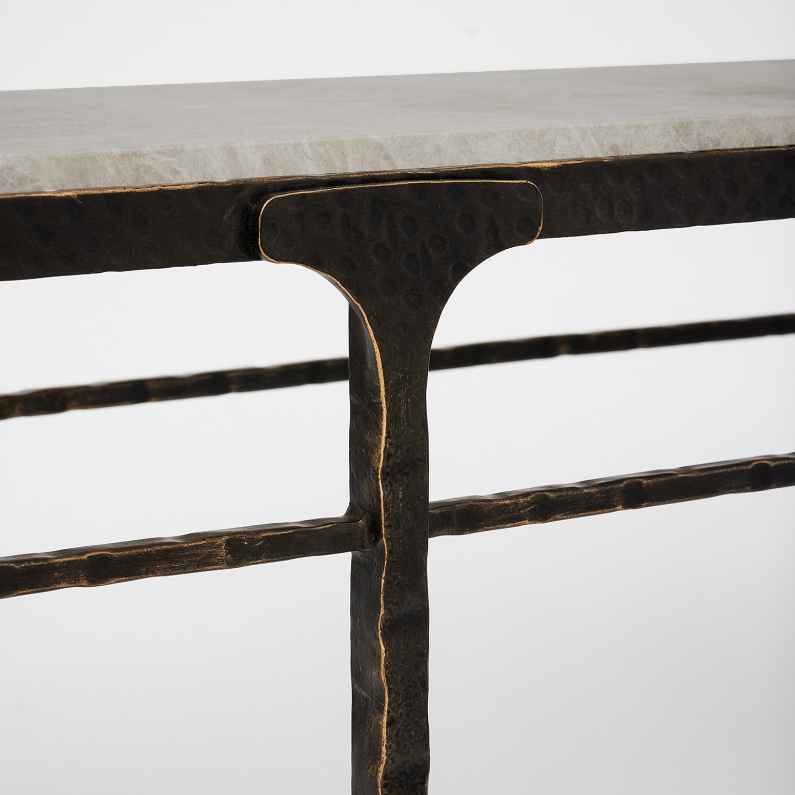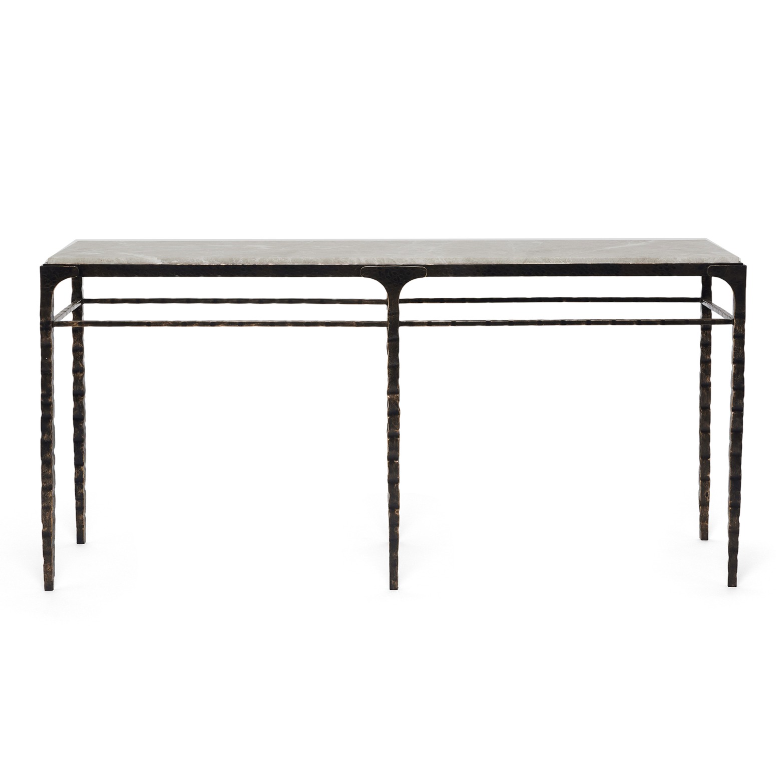 The iron Channing Grand Sofa Table features a vintage nickel finish and an emperador grey marble top and becomes that versatile piece that perfectly complements any space.