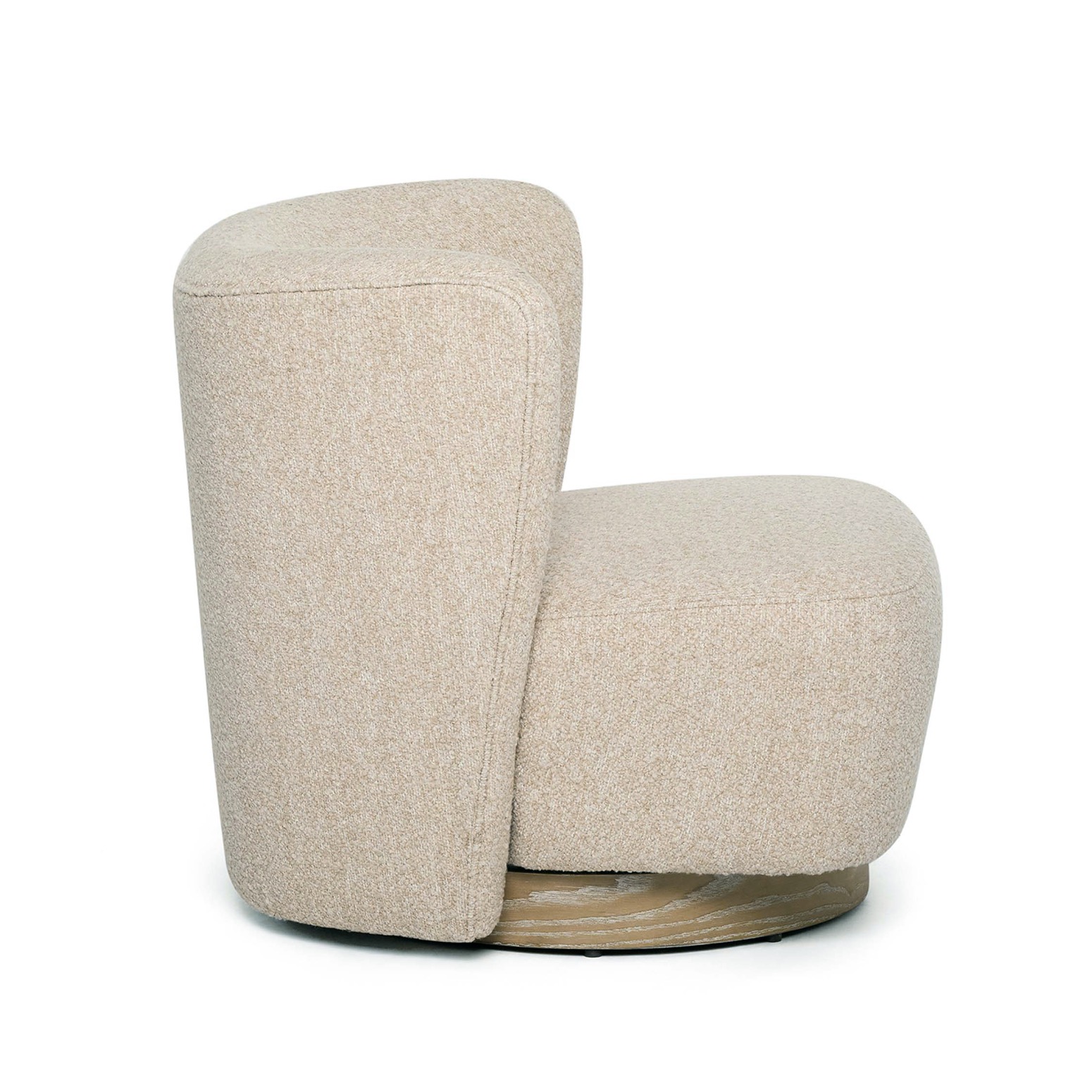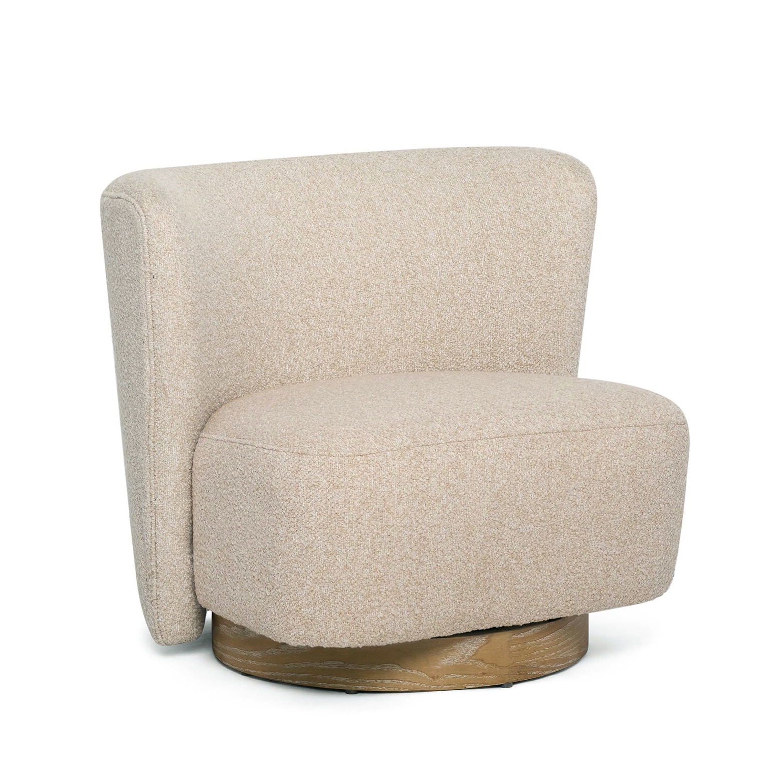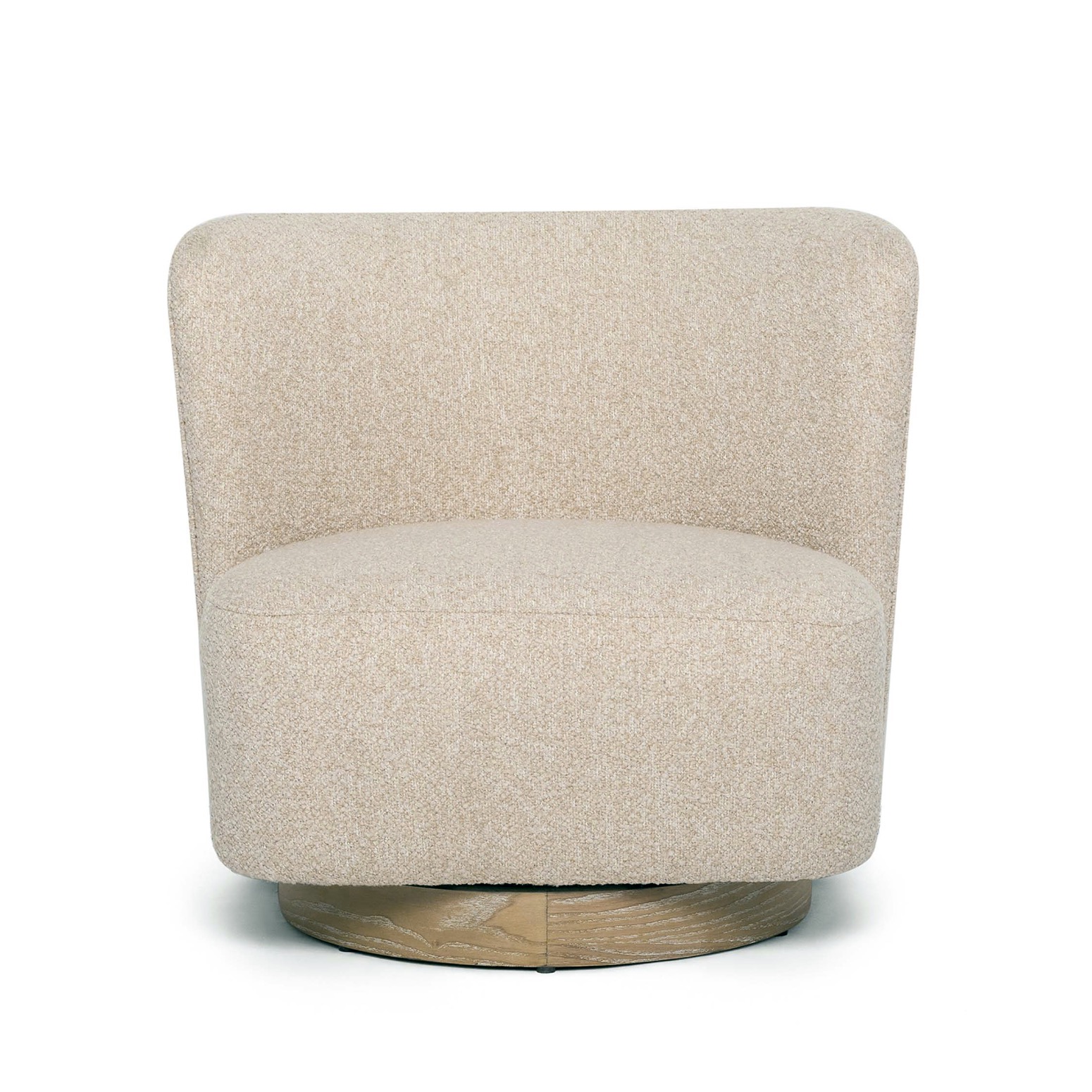 With its curved back, fabric upholstery in Baja Seed and whitewash ash base, the plush Dorian Swivel Lounge Chair beckons.