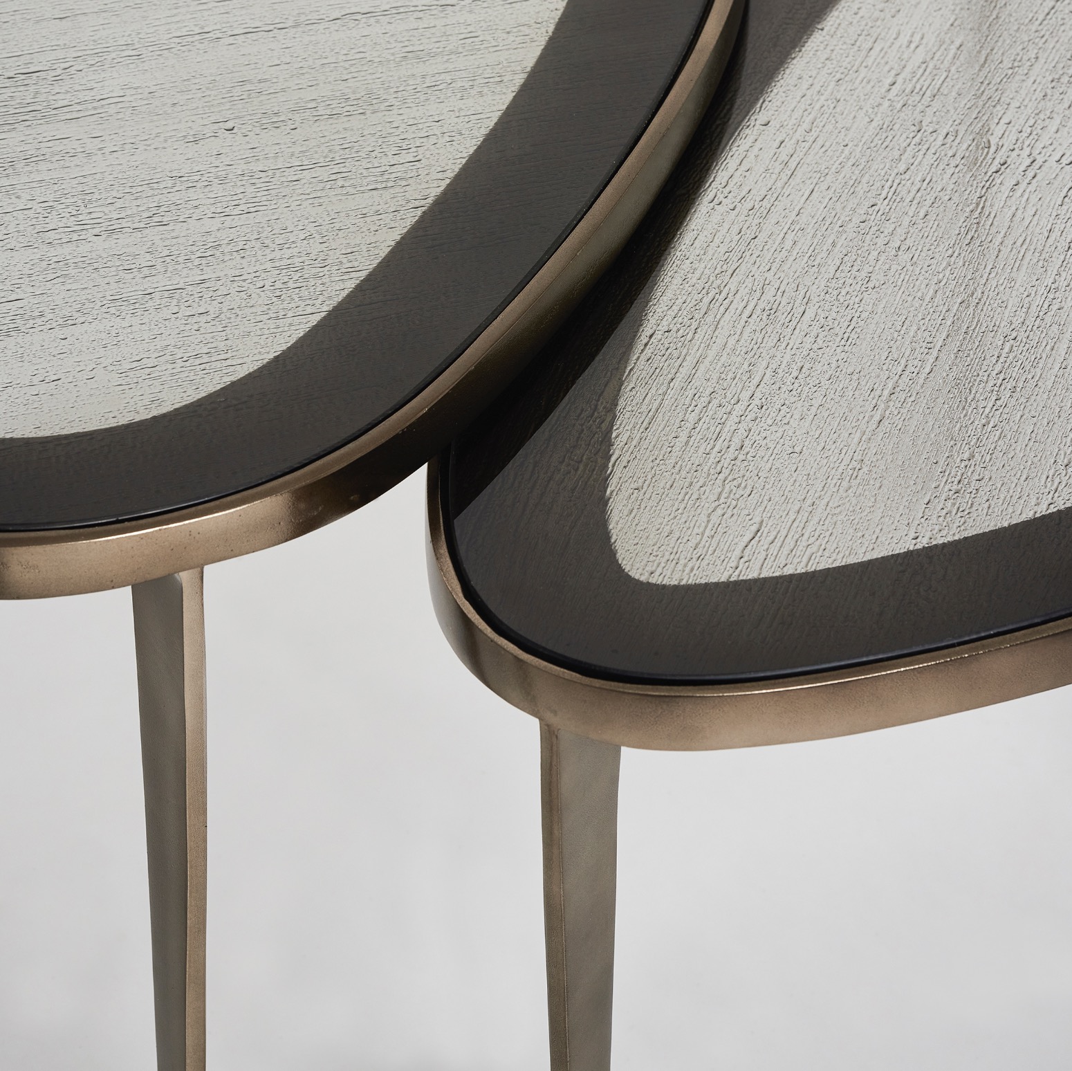 Sepia tinted glass and an aluminum base in a twilight bronze finish turn the eye-catching Jan Bunching Cocktail Tables into a dramatic trio.